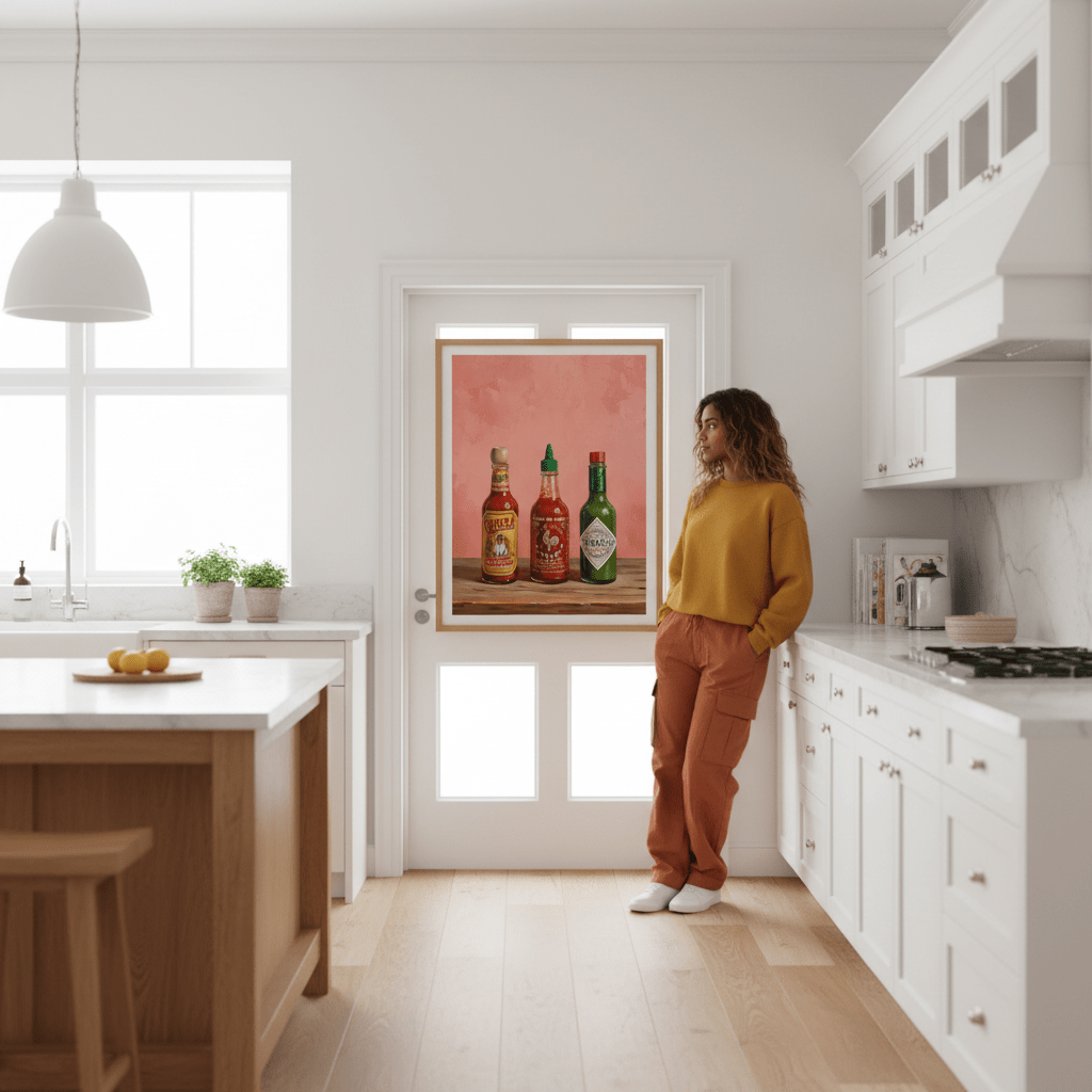 Elevate your kitchen décor with this striking trio of hot sauce illustrations, each rendered in bold sketch style against a warm burnt pink backdrop. Perfect for spice enthusiasts and culinary art collectors, this three-piece set captures the vibrant personality of hot sauce culture through contemporary illustration. The cohesive colour palette and complementary compositions create visual impact whether displayed as a gallery wall or grouped statement piece. Ideal for modern kitchens, dining spaces, or anywhere you want to inject personality and warmth into your walls.
