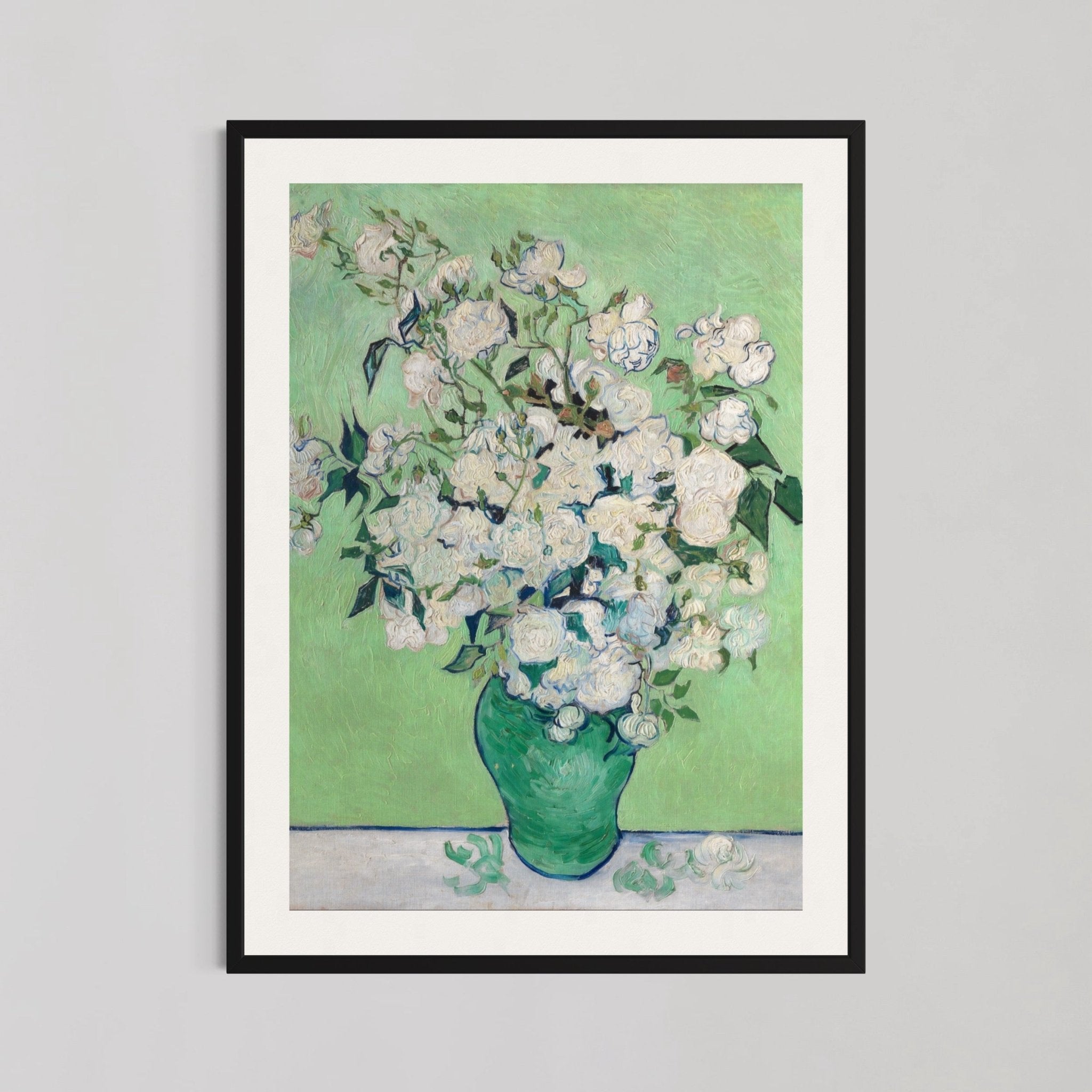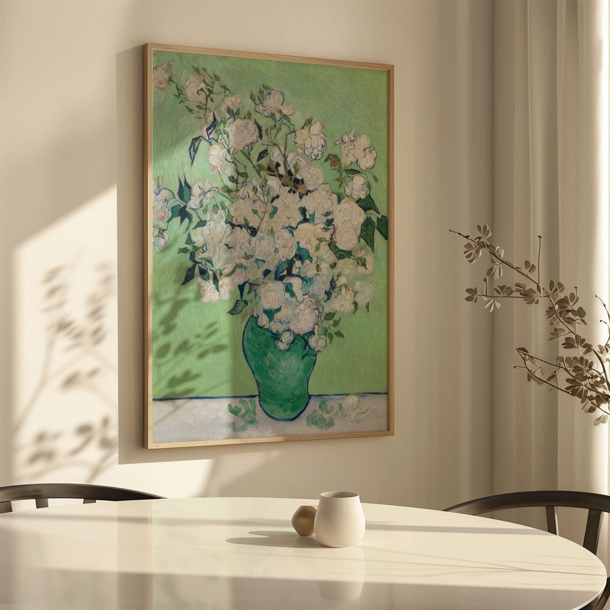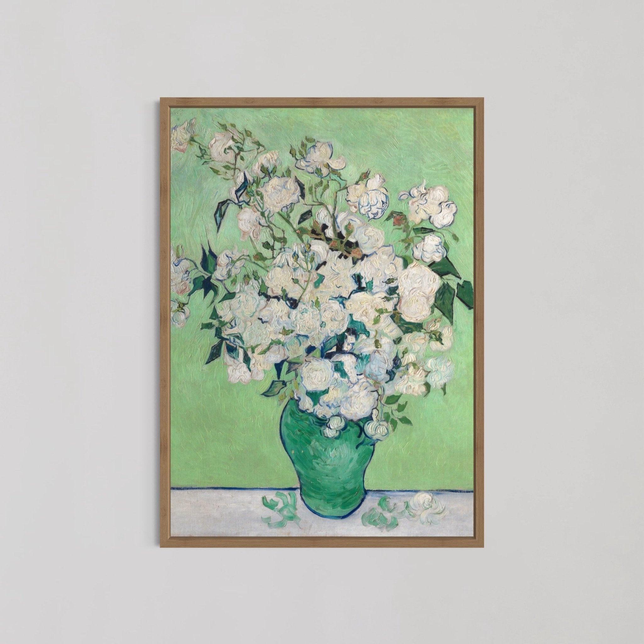 Experience the exquisite beauty of Vincent van Gogh's Still Life Vase with Pink Roses Wall Art. The detailed brushstrokes and delicate colors capture the essence of the renowned artist's work. Perfect for adding a touch of elegance to any space.