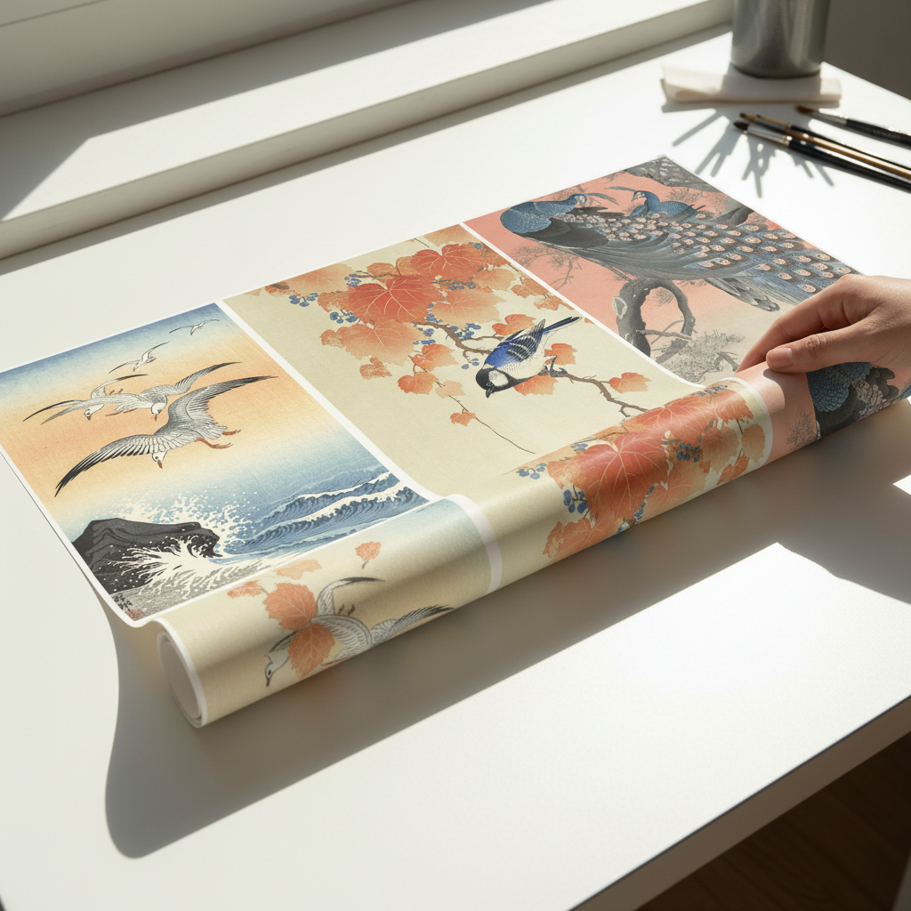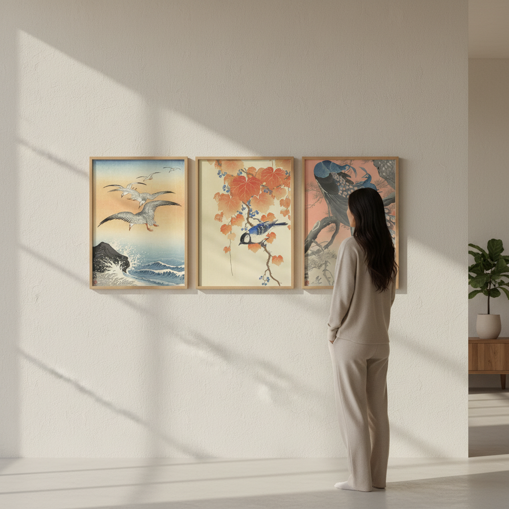 This curated trio celebrates the mastery of Japanese woodblock printing, featuring three distinct compositions that showcase the genre's technical brilliance and aesthetic refinement. The first depicts seagulls in dynamic flight above turbulent waves and rocky outcrops, capturing movement and natural drama with precise linework. The second presents an intimate study of a perched bird amid autumn foliage and berries, demonstrating the artist's sensitivity to seasonal detail and compositional balance. The final print features an ornate peacock rendered with meticulous attention to feather articulation and chromatic depth, set against a naturalistic branch setting. Each print exemplifies the sophisticated colour palette and refined draughtsmanship characteristic of traditional Japanese woodblock art, making this collection an exceptional choice for collectors and enthusiasts of East Asian printmaking.