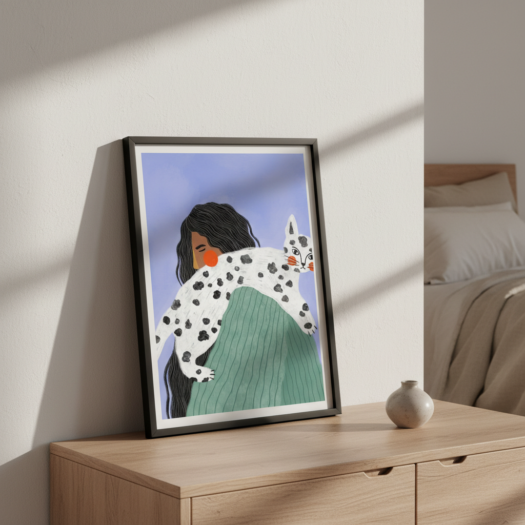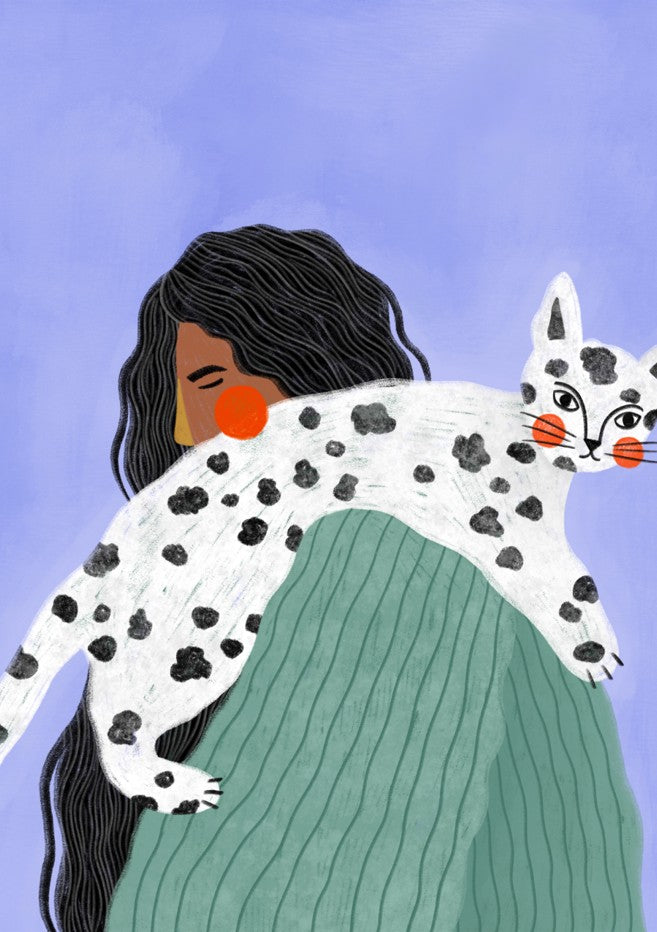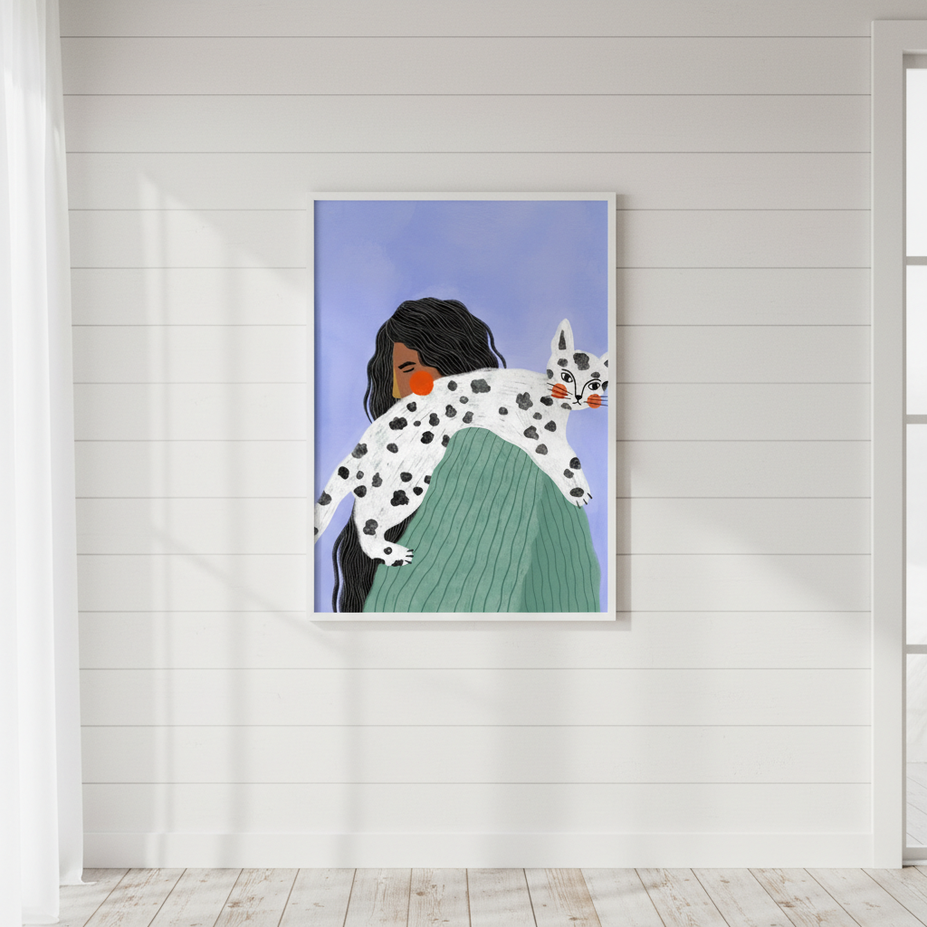 Woman with Dalmatian Dog by Bea Muller This striking illustration captures a joyful moment between a woman and her spotted Dalmatian companion perched on her shoulders. Set against a vibrant purple backdrop, the artwork showcases Bea Muller's distinctive style with bold, expressive linework and dynamic composition. The piece celebrates the bond between pet and owner, making it an ideal choice for dog lovers and those seeking contemporary wall art with personality. Perfect for adding warmth and character to any interior space.