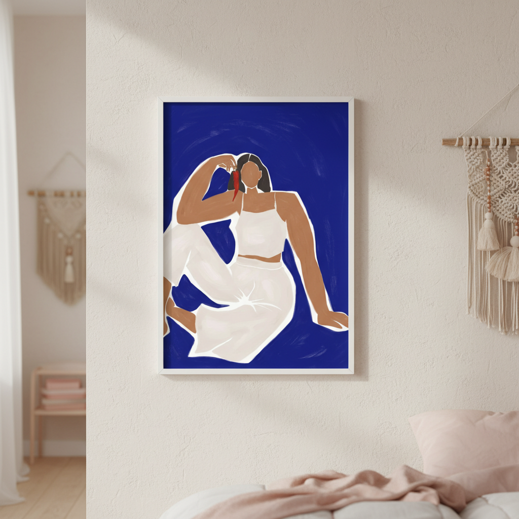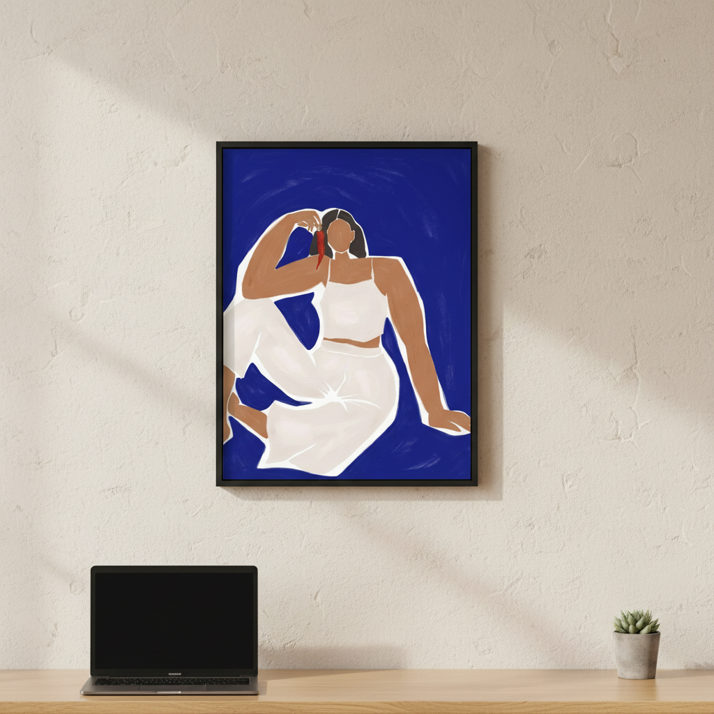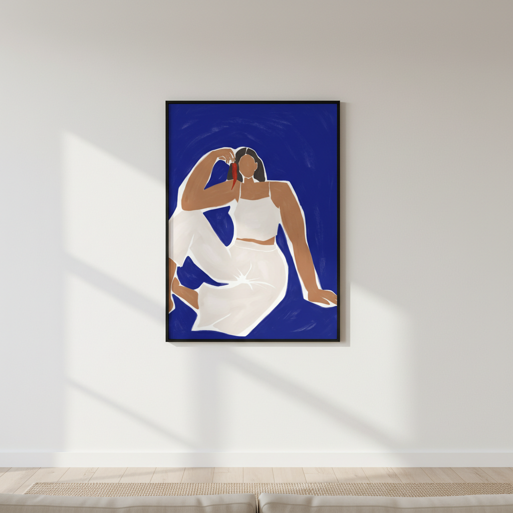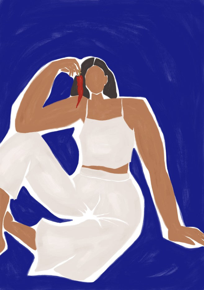 Woman with Chili by Ivy Green Illustrations captures a striking surreal moment where a figure cradles a vibrant red chili pepper against a serene blue backdrop. This evocative artwork blends imaginative storytelling with bold colour contrasts, creating a visually compelling piece that sparks conversation. Perfect for contemporary interiors seeking statement-making wall art, this illustration merges whimsy with sophistication, transforming any space into a gallery-worthy environment.