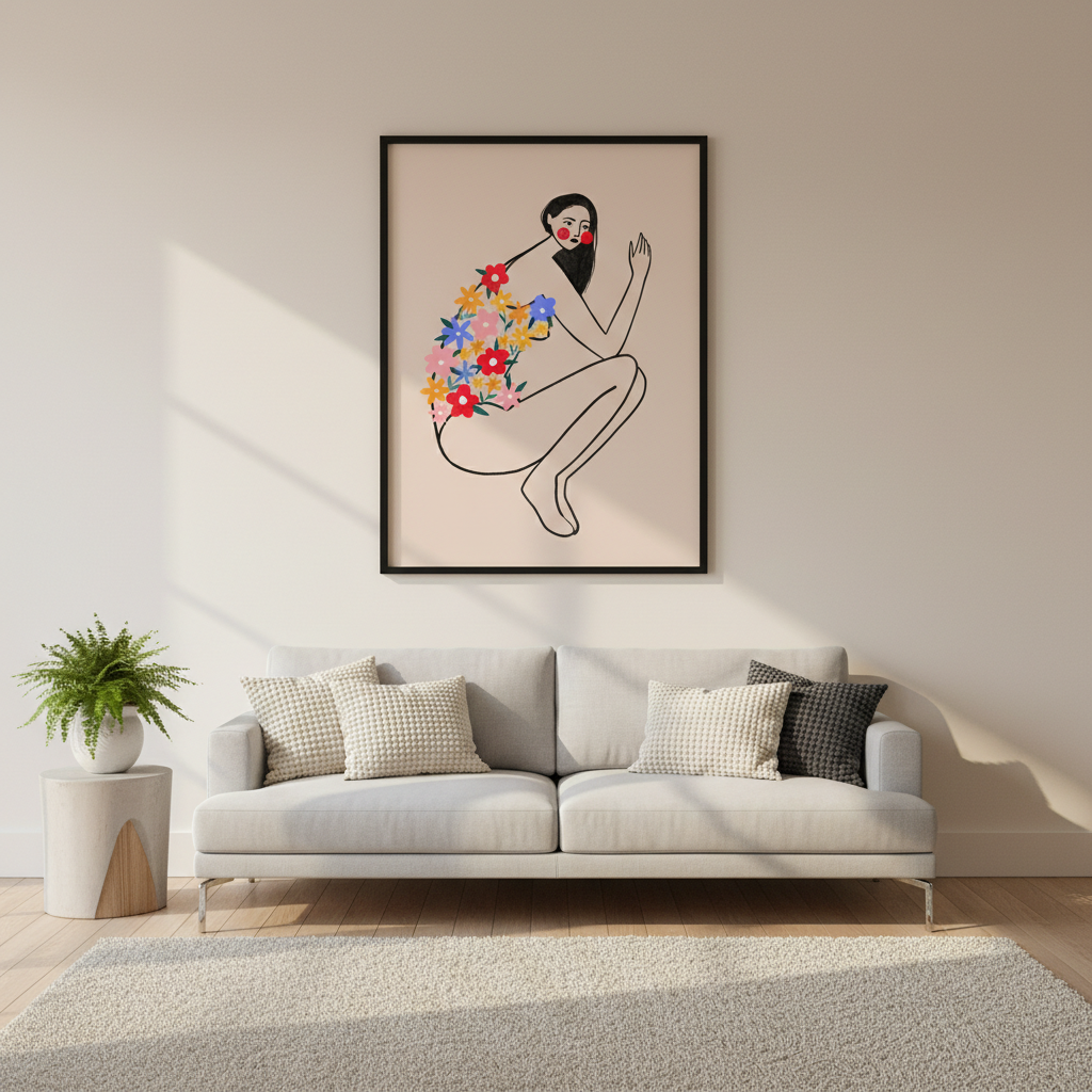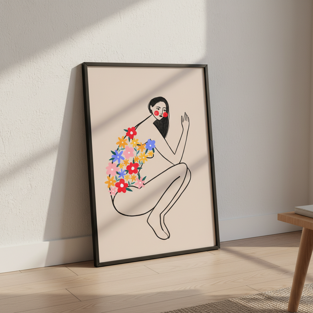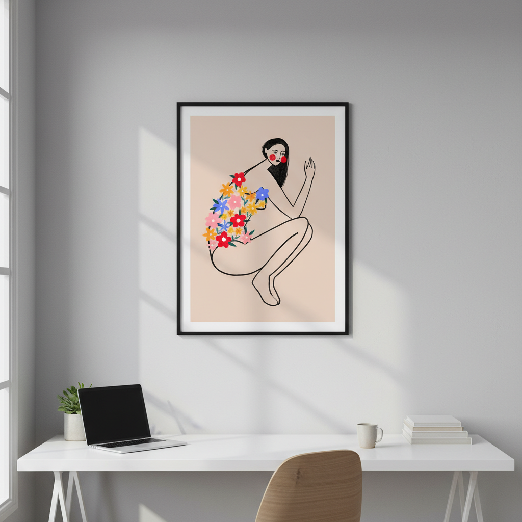 Celebrate contemporary art with this striking illustration featuring a woman adorned in a vibrant floral swimsuit against a serene beige backdrop. Created by artist Bea Muller, this piece combines bold botanical elements with minimalist composition, making it an ideal statement piece for modern interiors. The warm, neutral background allows the intricate floral details to command attention, while the sophisticated colour palette complements both eclectic and refined décor schemes. Perfect for bedrooms, living spaces, or creative studios, this artwork brings artistic flair and visual interest to any room.