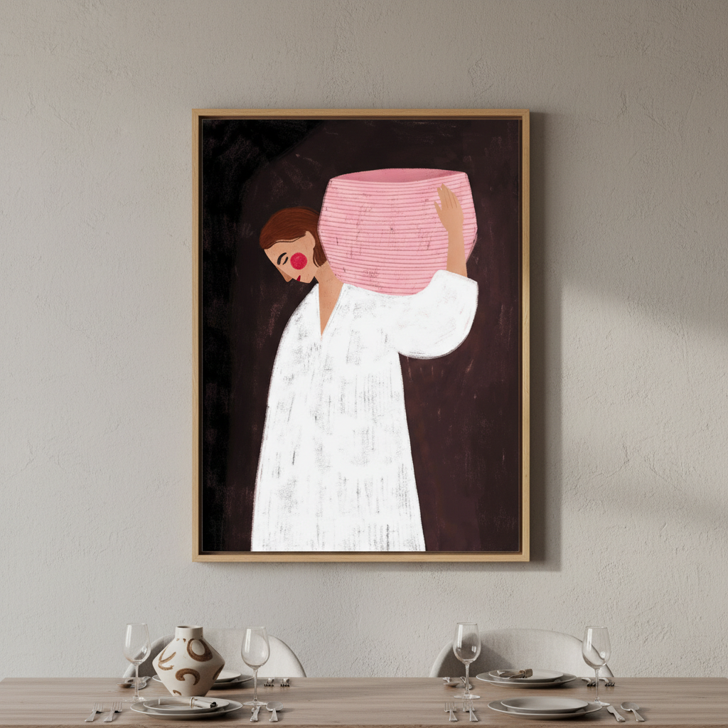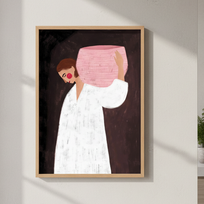 Woman with Pink Basket by Bea Muller captures a striking moment of understated elegance. This illustration features a figure draped in crisp white against a dramatic dark backdrop, holding a beautifully textured pink woven basket. The composition balances minimalist styling with rich detail, showcasing the interplay of light and shadow. Bea Muller's distinctive artistic approach brings sophistication to any space, making this piece ideal for contemporary interiors seeking refined visual interest and artistic depth.