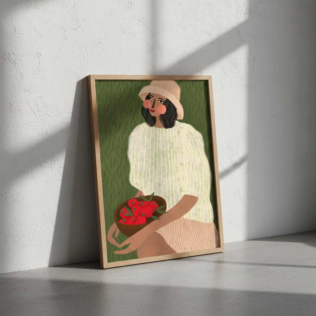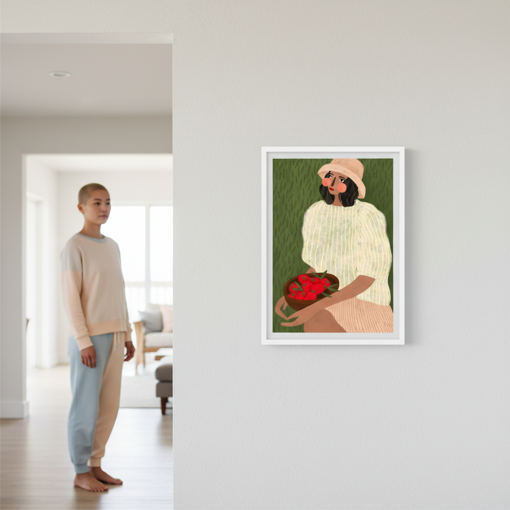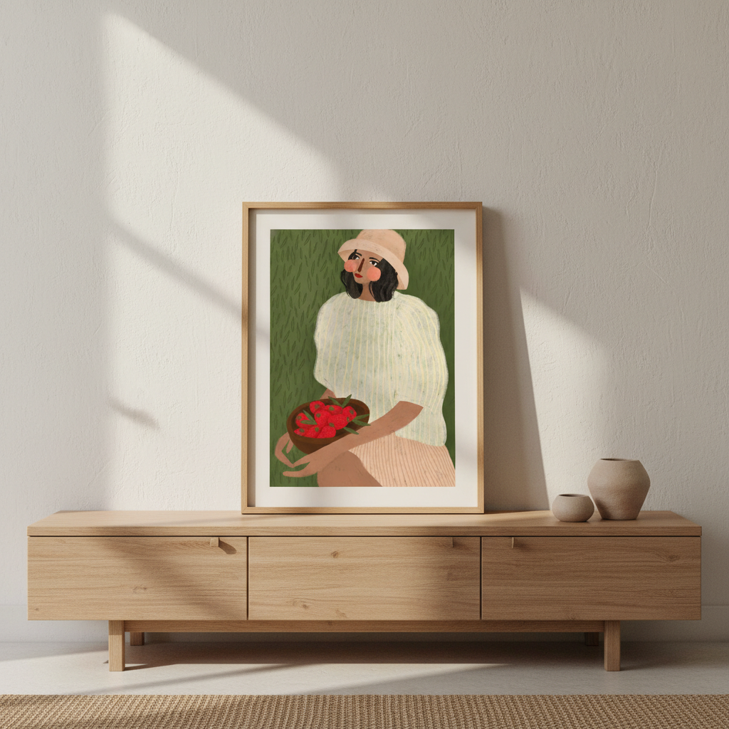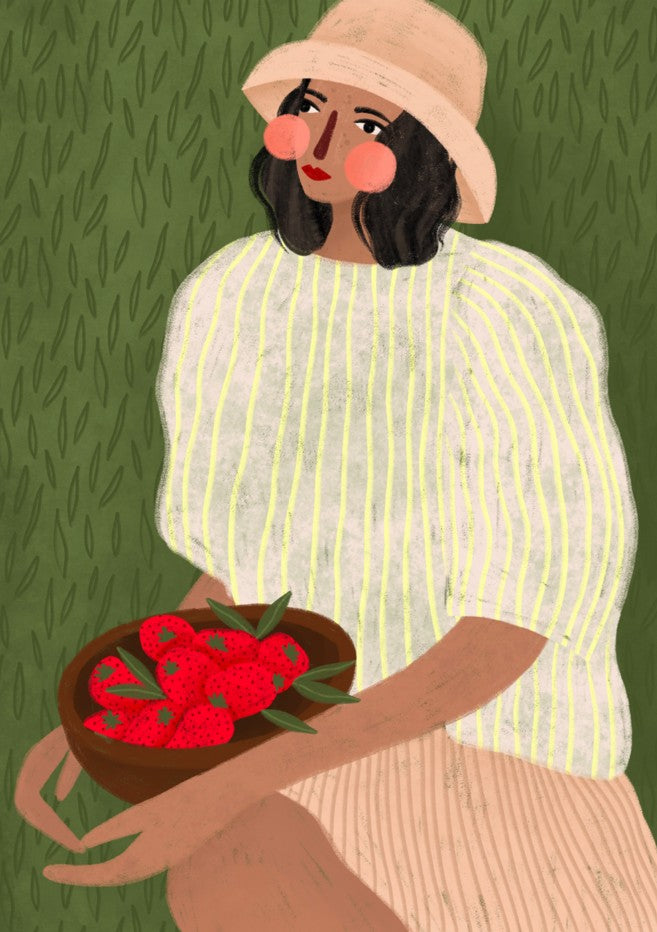 Woman with Strawberries by Bea Muller captures a striking botanical moment with confident artistic vision. This illustration features a figure cradling vibrant red strawberries against a lush green backdrop, creating a harmonious composition that celebrates both nature and human connection. Bea Muller's distinctive style brings warmth and sophistication to this piece, making it an ideal choice for spaces seeking contemporary art with organic appeal. Perfect for kitchens, dining areas, or any room where you want to introduce colour and artistic character.