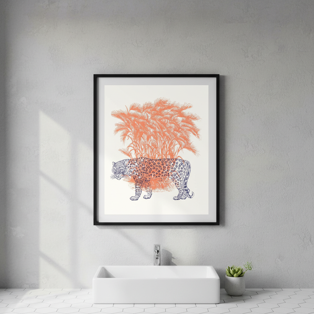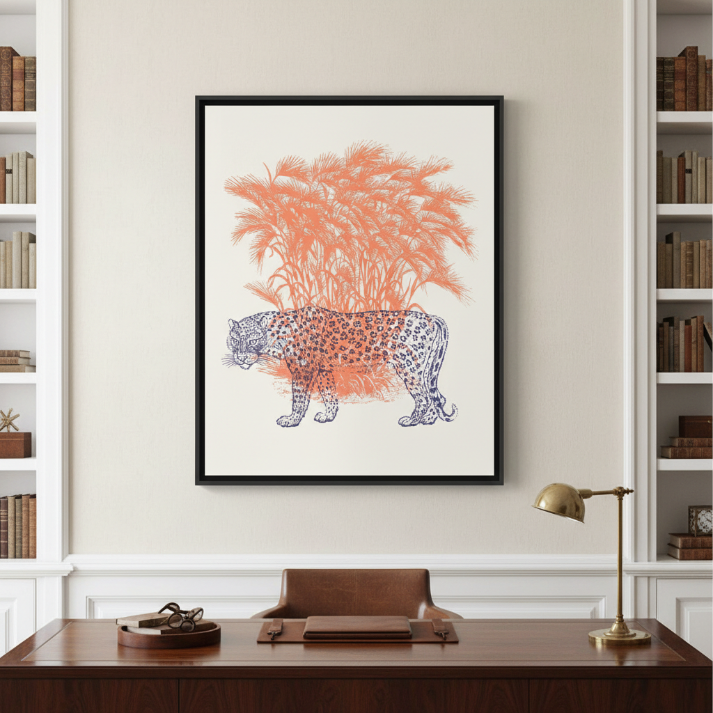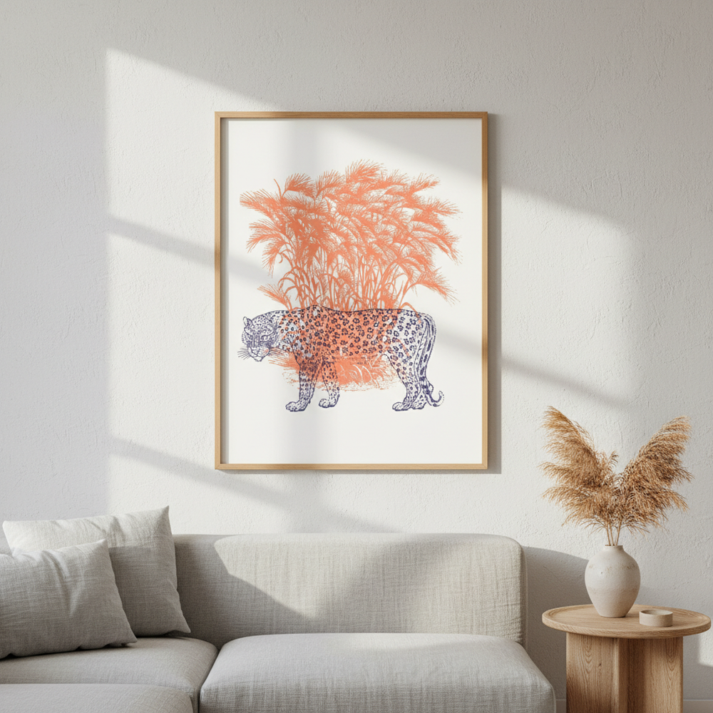 Discover the striking elegance of this leopard illustration, where a majestic feline emerges against a pristine white canvas. Vibrant orange grasses frame the composition, creating dynamic movement and warmth that draws the eye. This sophisticated artwork combines naturalistic detail with contemporary design sensibilities, making it an ideal statement piece for galleries, modern interiors, or collectors seeking wildlife art with refined aesthetic appeal. Perfect for adding visual interest and a touch of untamed beauty to any space.