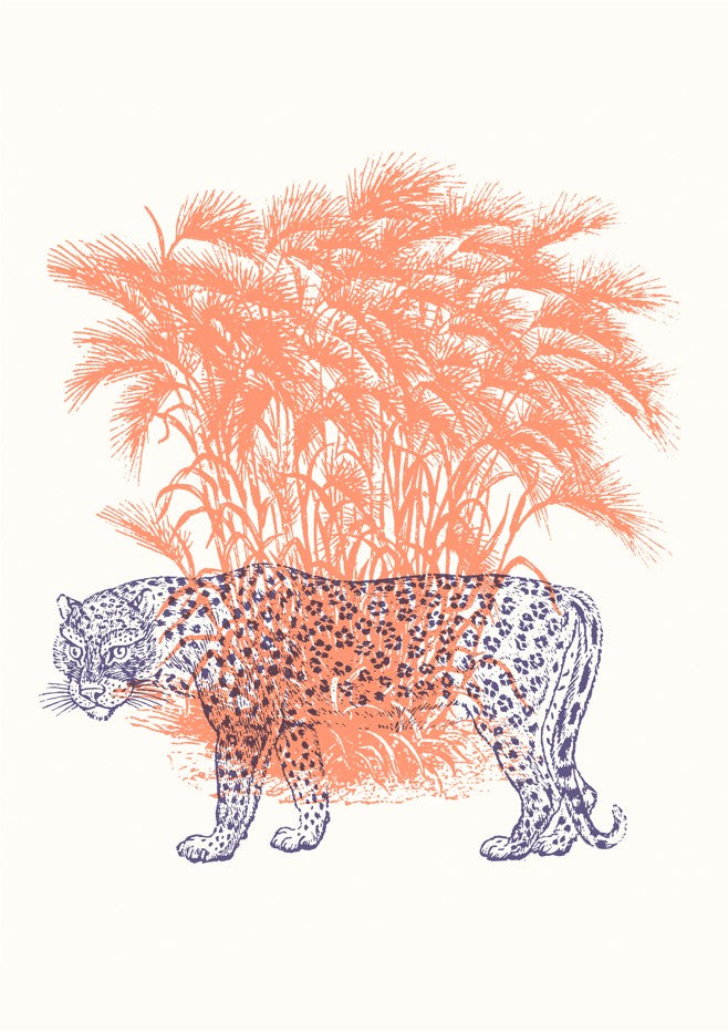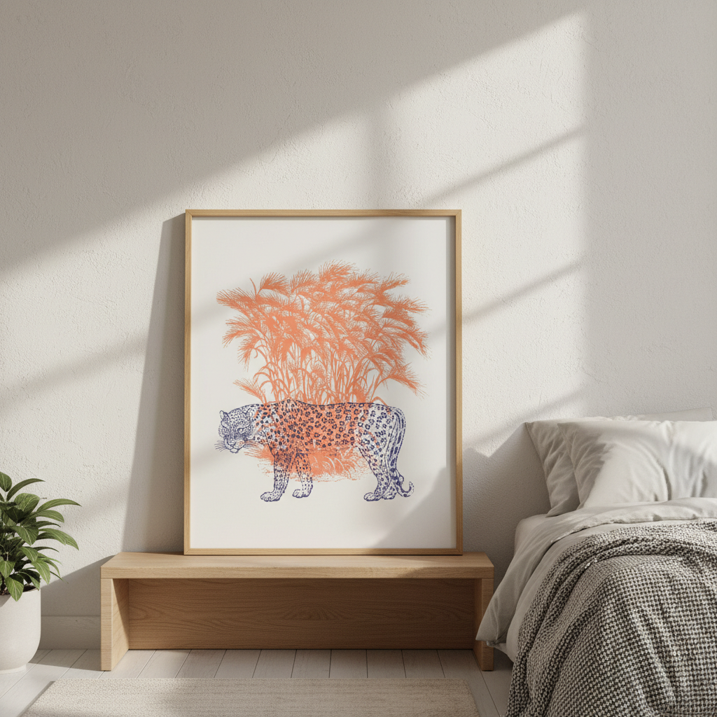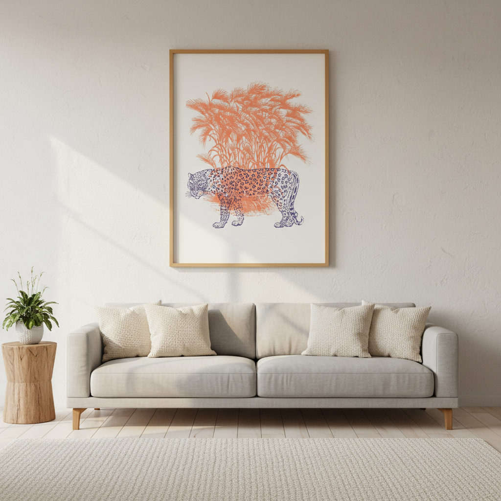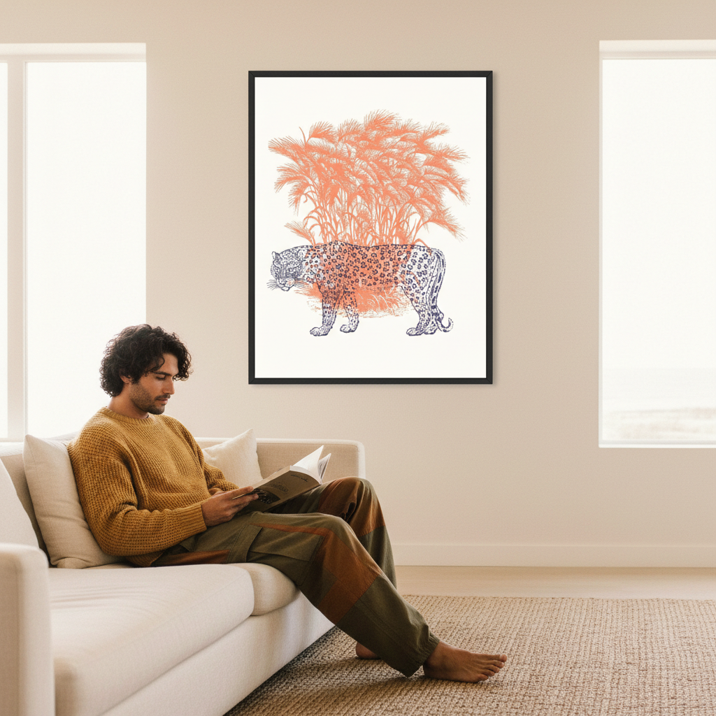 Discover the striking elegance of this leopard illustration, where a majestic feline emerges against a pristine white canvas. Vibrant orange grasses frame the composition, creating dynamic movement and warmth that draws the eye. This sophisticated artwork combines naturalistic detail with contemporary design sensibilities, making it an ideal statement piece for galleries, modern interiors, or collectors seeking wildlife art with refined aesthetic appeal. Perfect for adding visual interest and a touch of untamed beauty to any space.