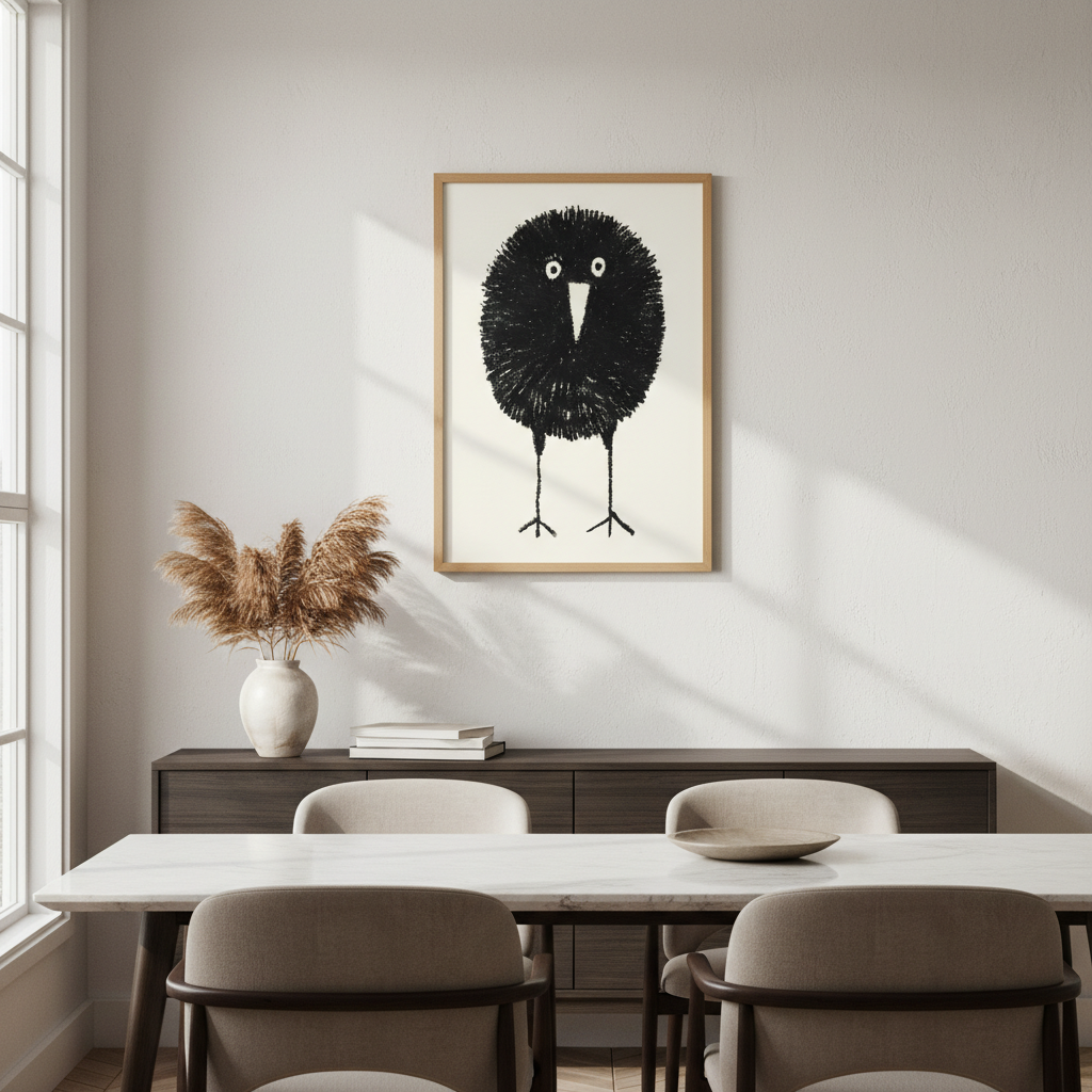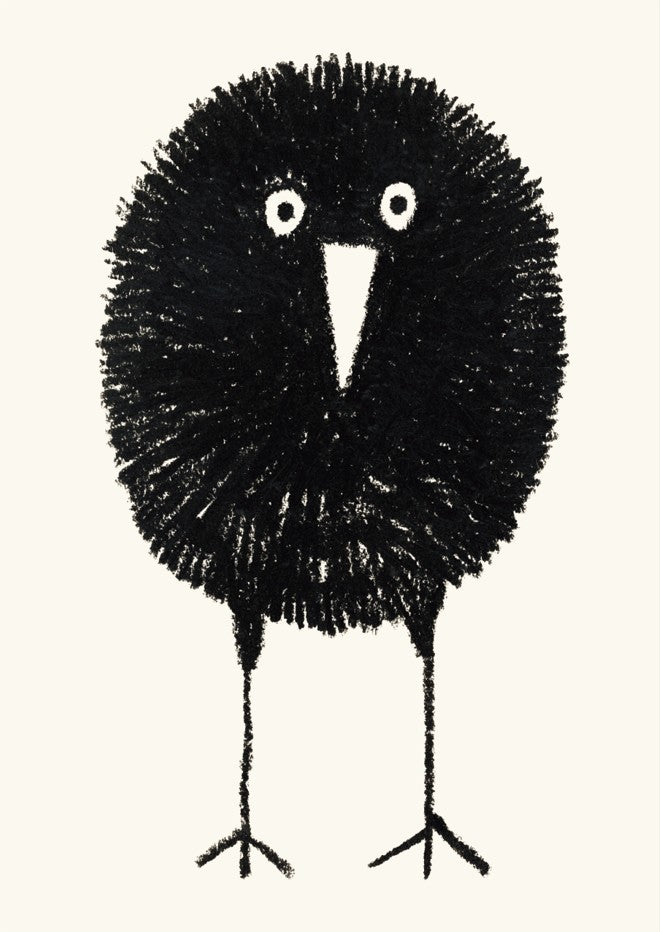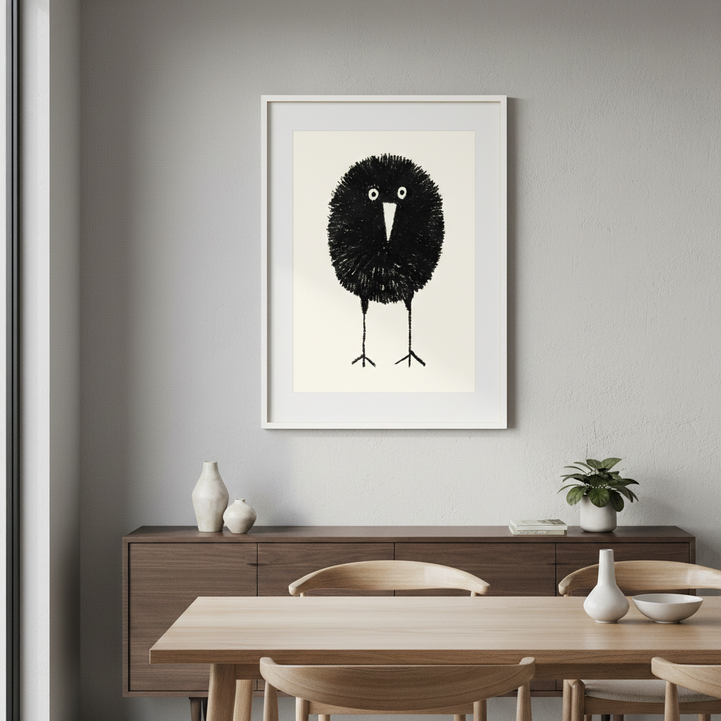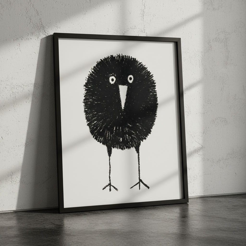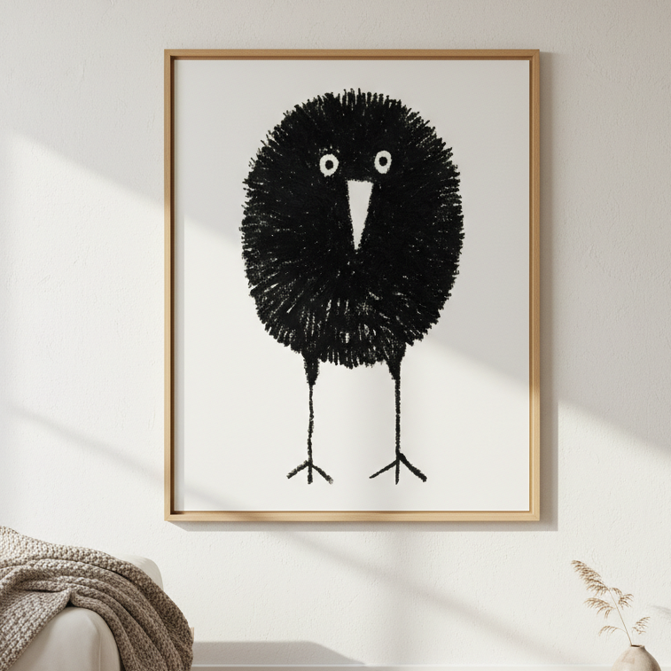 Bobbie by Silvia Visscher is a striking black and white illustration featuring a stylized bird rendered with distinctive proportions—an oversized round head balanced on elongated legs. The minimalist composition against a clean white background creates a contemporary aesthetic that works beautifully as wall art. This piece exemplifies modern illustration techniques, combining geometric simplicity with organic form to produce a captivating focal point for any interior space.
