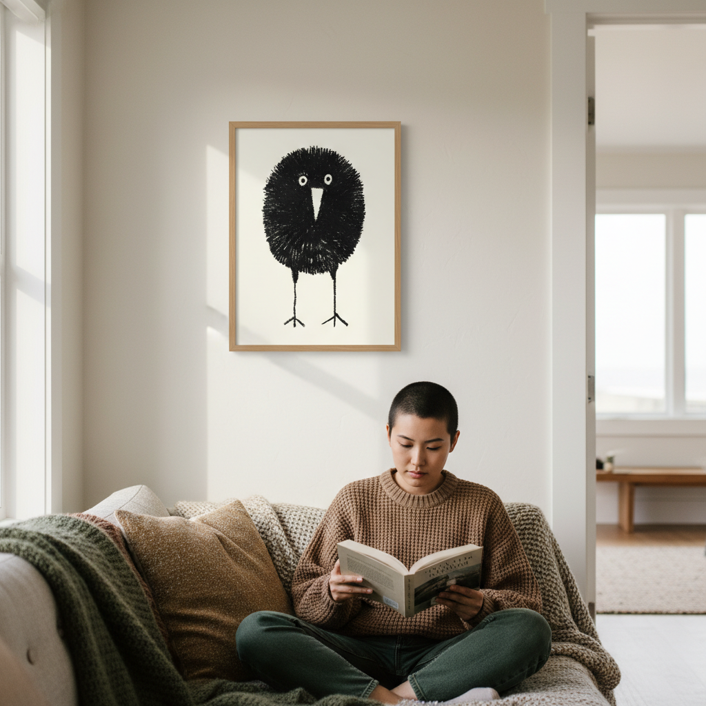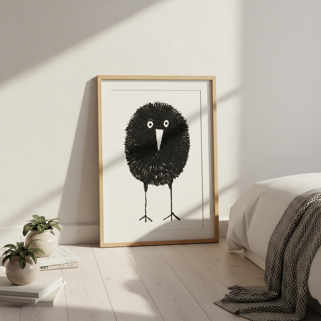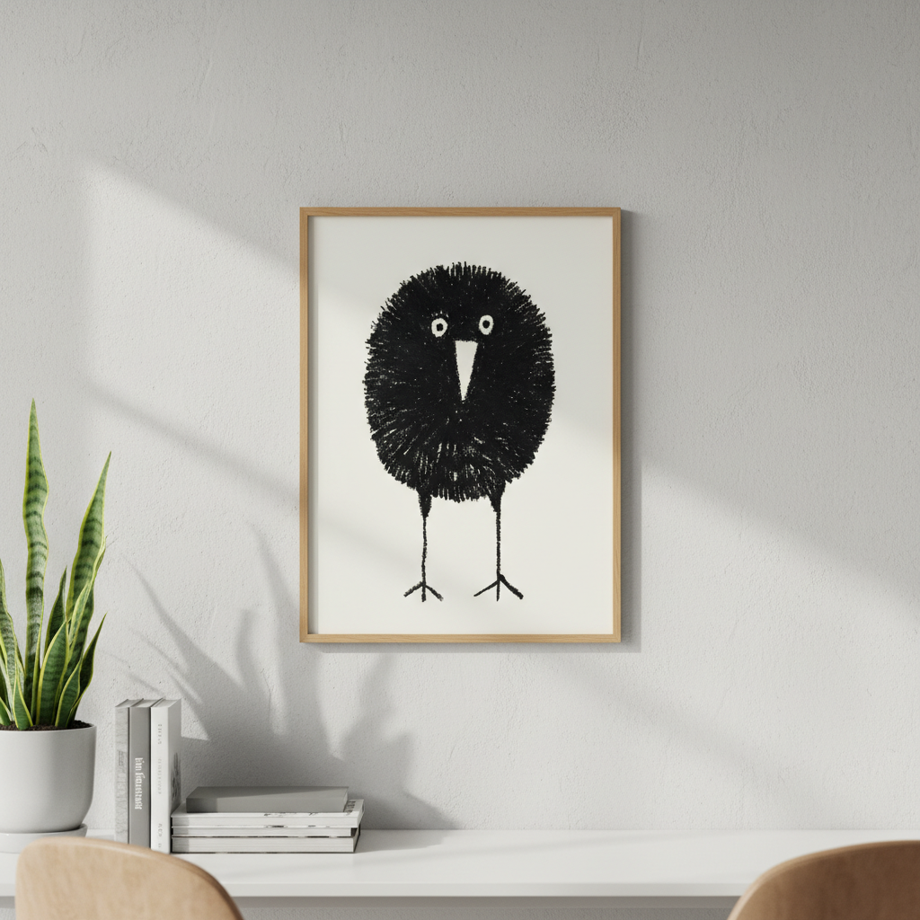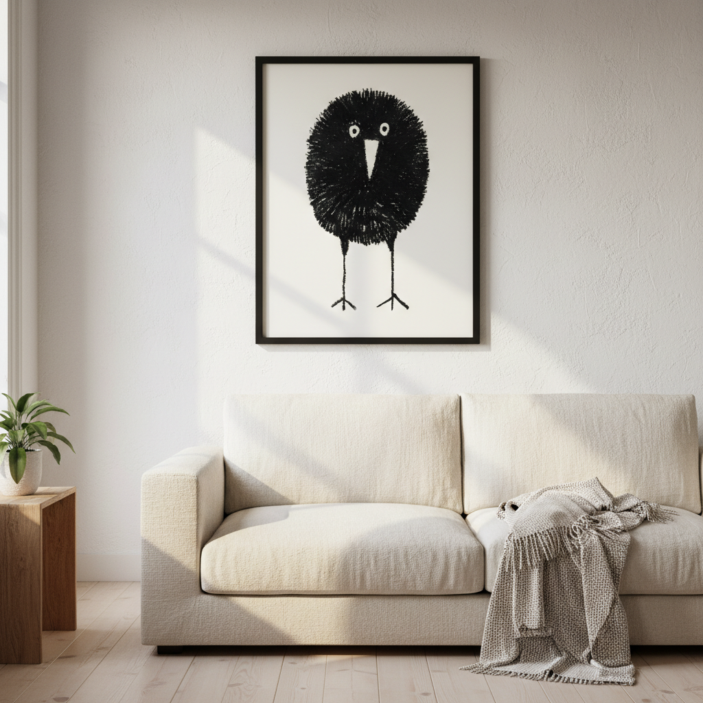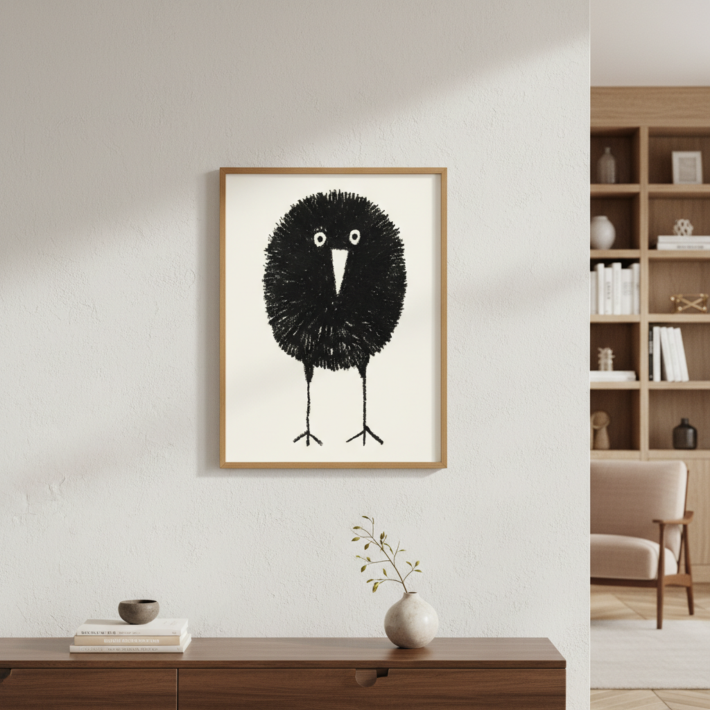 Bobbie by Silvia Visscher is a striking black and white illustration featuring a stylized bird rendered with distinctive proportions—an oversized round head balanced on elongated legs. The minimalist composition against a clean white background creates a contemporary aesthetic that works beautifully as wall art. This piece exemplifies modern illustration techniques, combining geometric simplicity with organic form to produce a captivating focal point for any interior space.