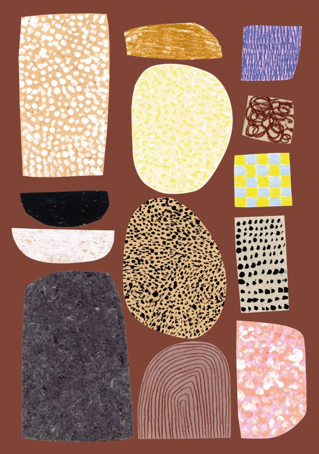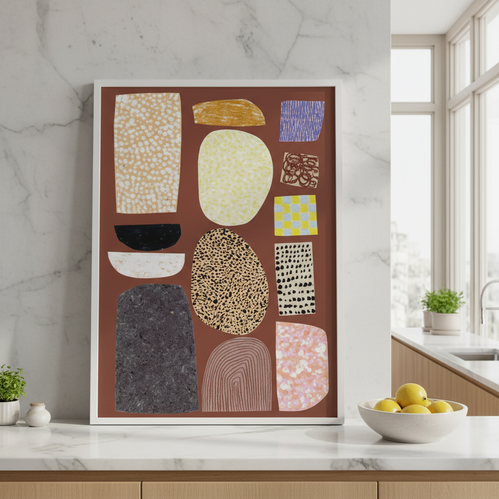 Midnight Harvest by Silvia Visscher presents an intriguing composition of textured geometric forms arranged against a warm brown backdrop. This artwork showcases the artist's sophisticated approach to spatial arrangement and tactile surface treatment. The interplay of varied shapes creates visual depth and invites closer examination of the dimensional qualities throughout the piece. A compelling addition for collectors seeking contemporary work with thoughtful compositional balance and textural complexity.