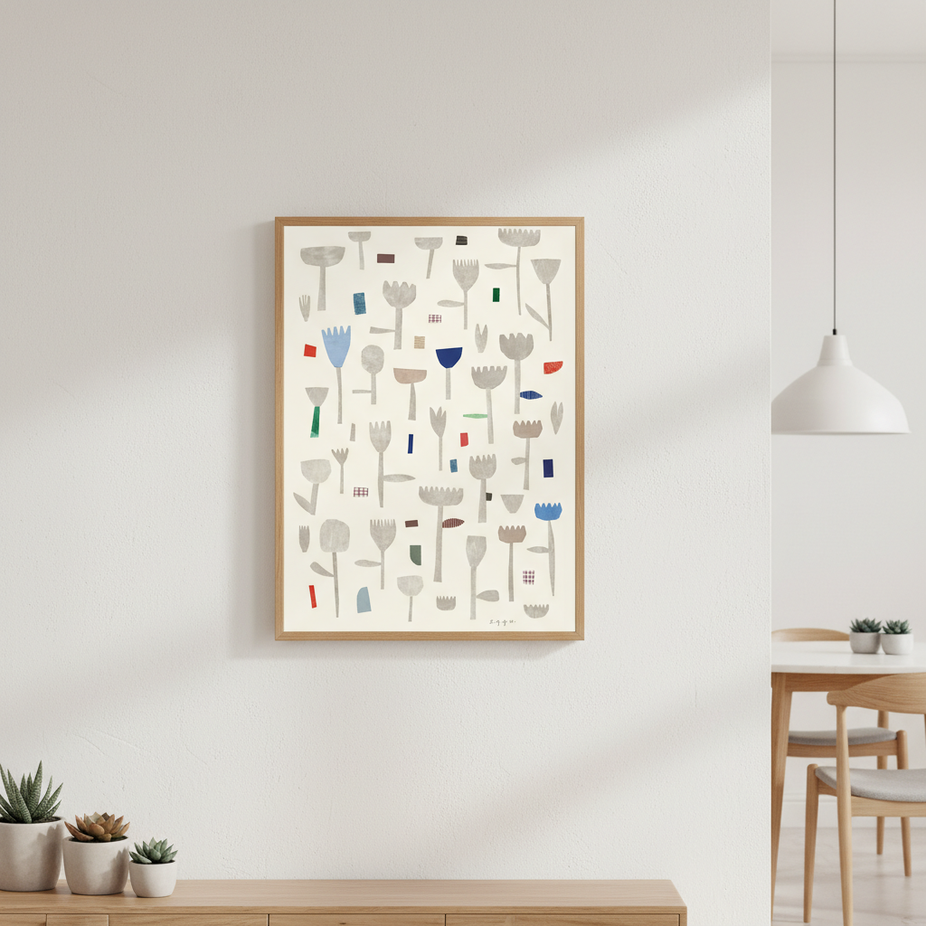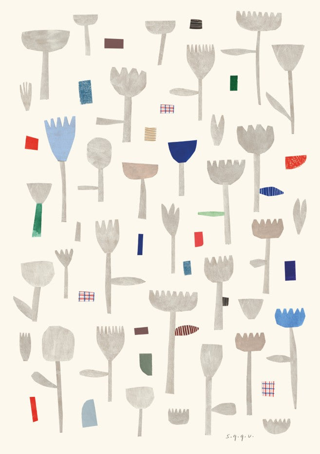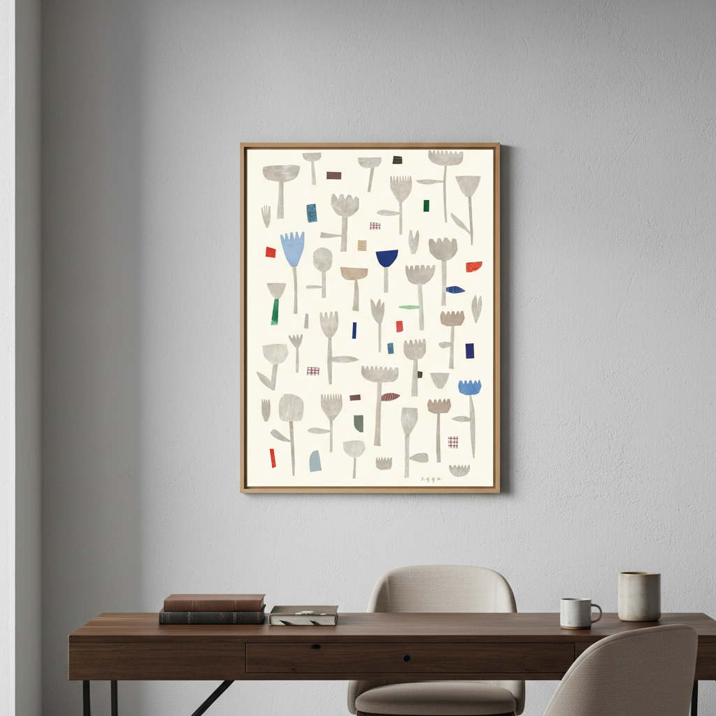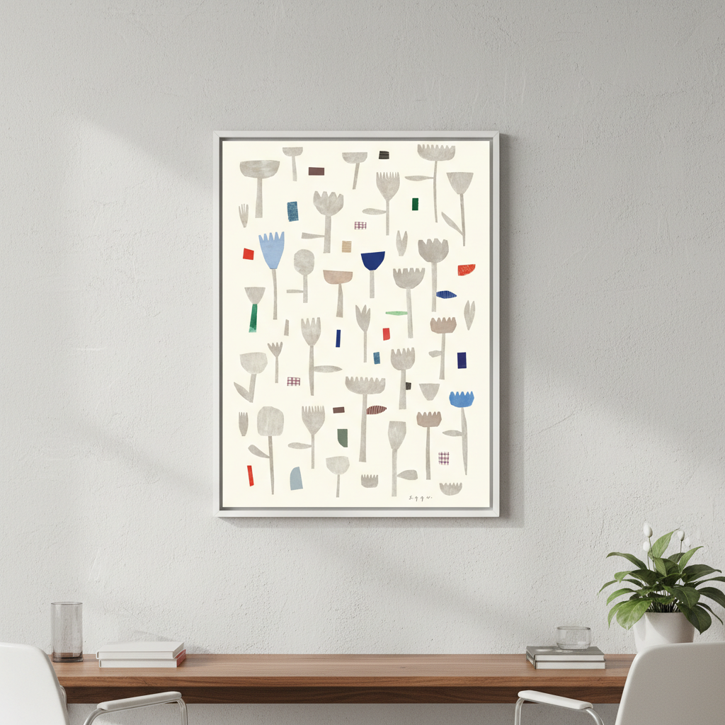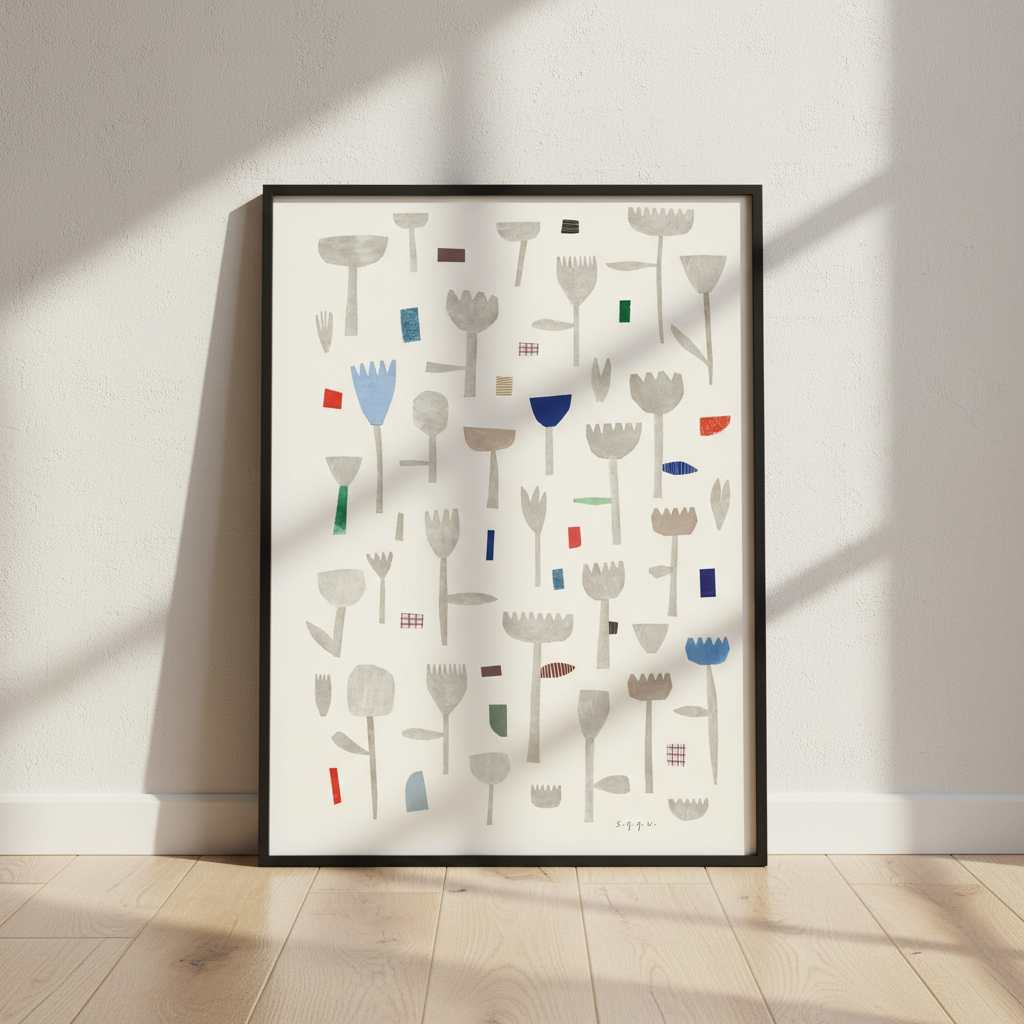 Floral Collage by Silvia Visscher presents an artfully composed design featuring stylized botanical forms interspersed with functional tool imagery, all rendered against a clean white backdrop. This sophisticated pattern balances organic and utilitarian elements, creating visual interest through thoughtful juxtaposition. The composition demonstrates skilled artistic restraint, allowing each element breathing room while maintaining cohesive design harmony. Ideal for those seeking wall art that bridges the gap between nature-inspired aesthetics and contemporary design sensibilities.
