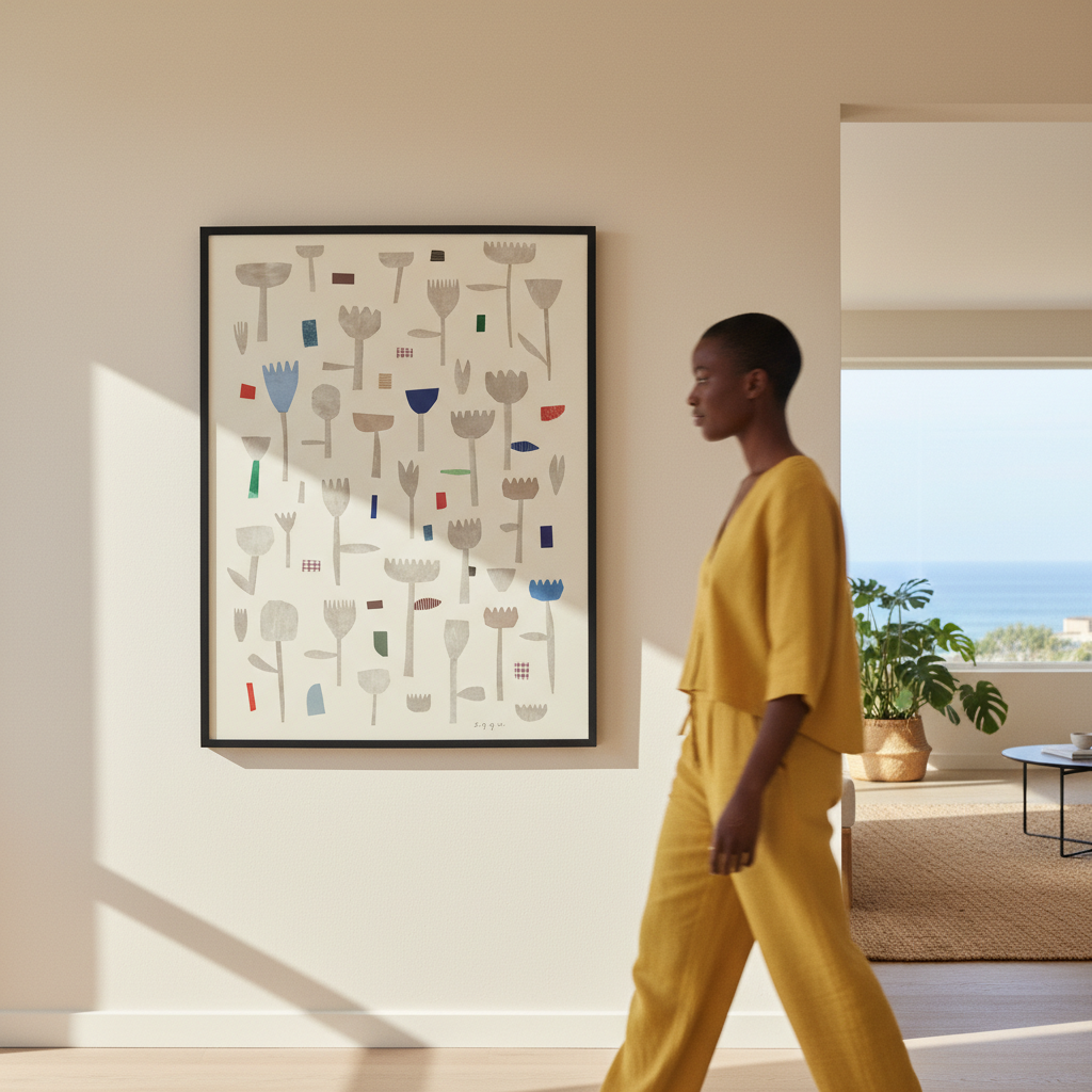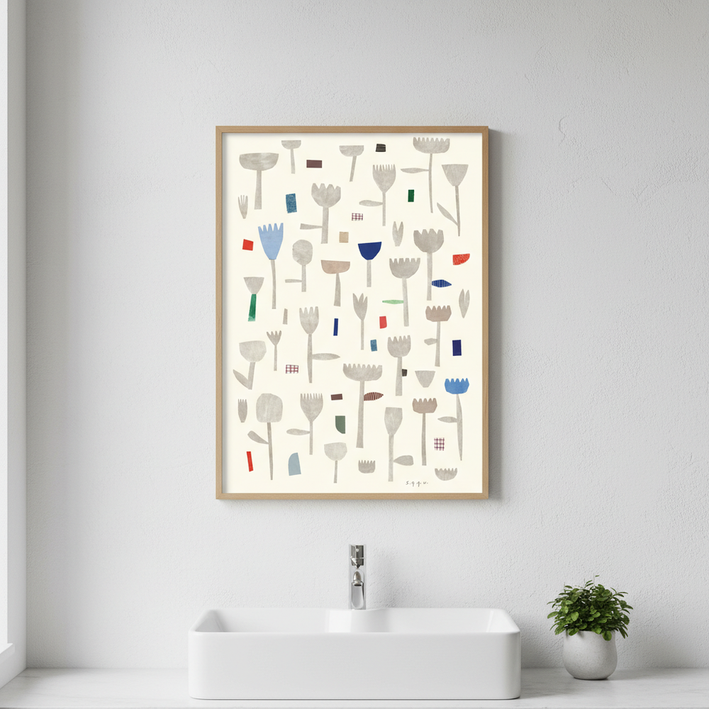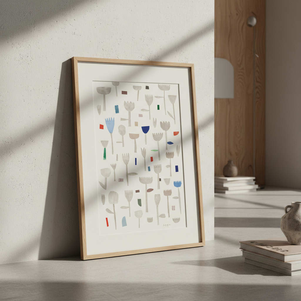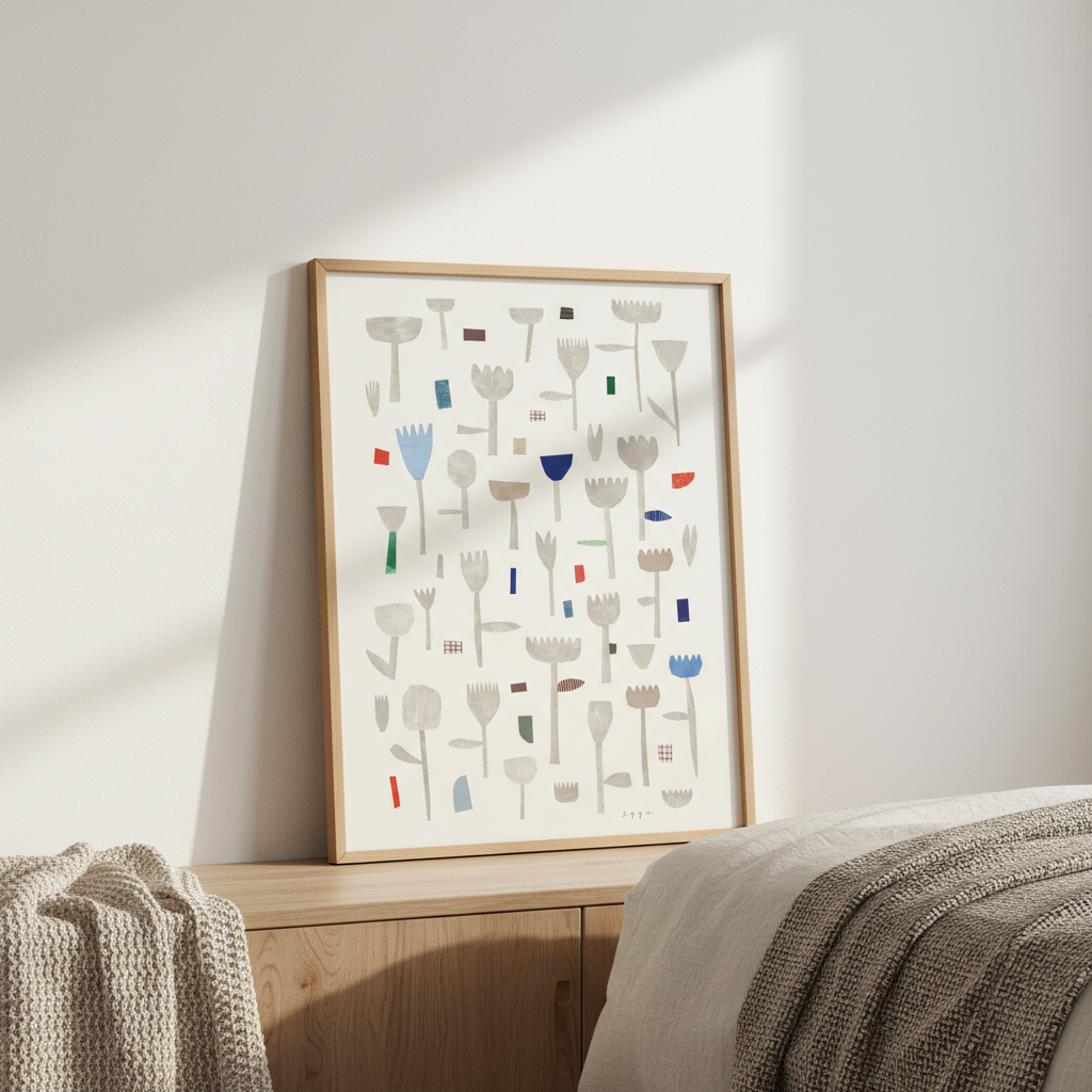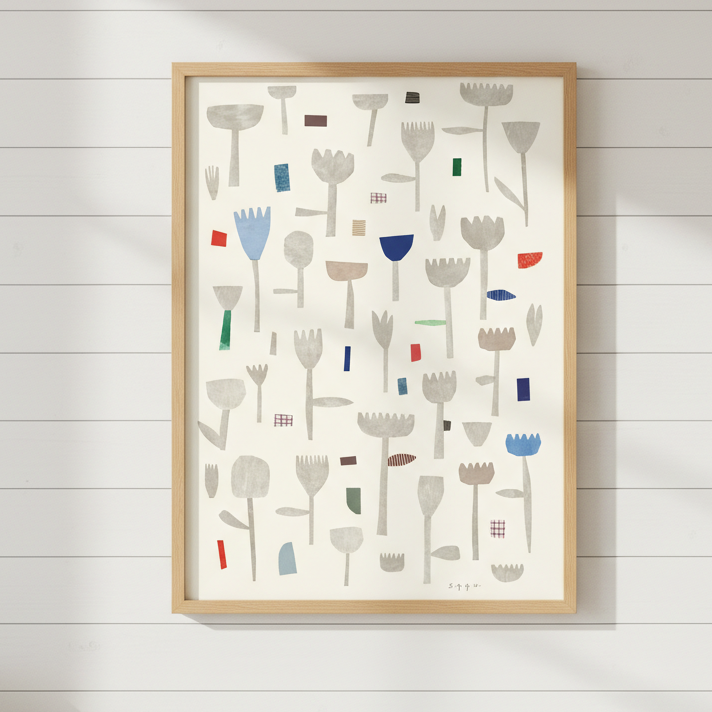 Floral Collage by Silvia Visscher presents an artfully composed design featuring stylized botanical forms interspersed with functional tool imagery, all rendered against a clean white backdrop. This sophisticated pattern balances organic and utilitarian elements, creating visual interest through thoughtful juxtaposition. The composition demonstrates skilled artistic restraint, allowing each element breathing room while maintaining cohesive design harmony. Ideal for those seeking wall art that bridges the gap between nature-inspired aesthetics and contemporary design sensibilities.