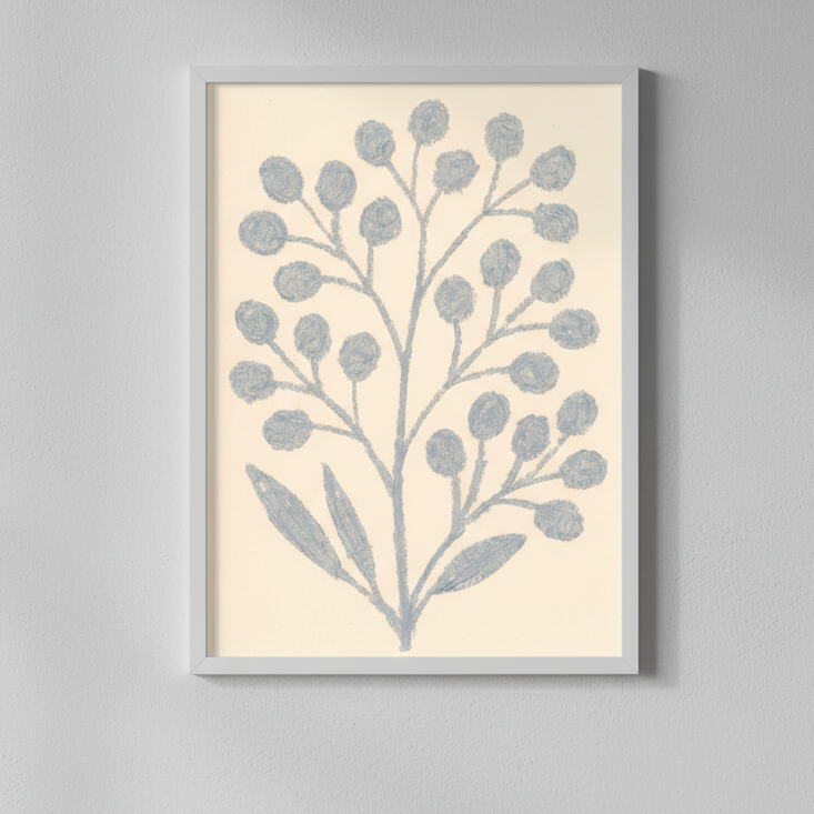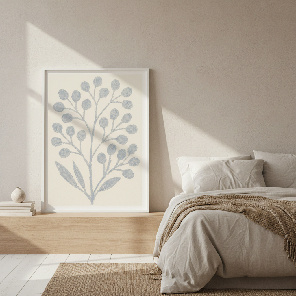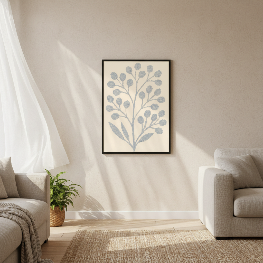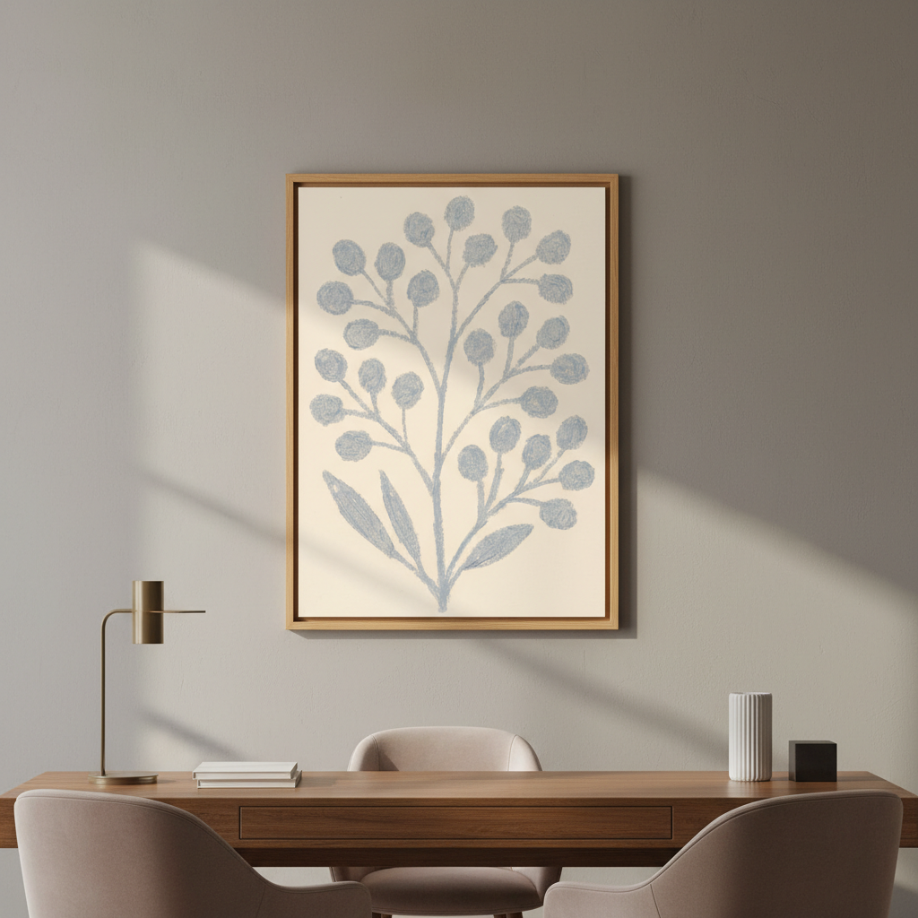Bring organic elegance to your space with this botanical wall art featuring delicate branches adorned with berries rendered in sophisticated blue tones against a warm beige backdrop. The intricate linework captures the natural beauty of flora with artistic precision, creating a refined focal point that complements both contemporary and traditional interiors. Perfect for adding understated sophistication to living rooms, bedrooms, or studies, this piece balances visual interest with calming, nature-inspired aesthetics.