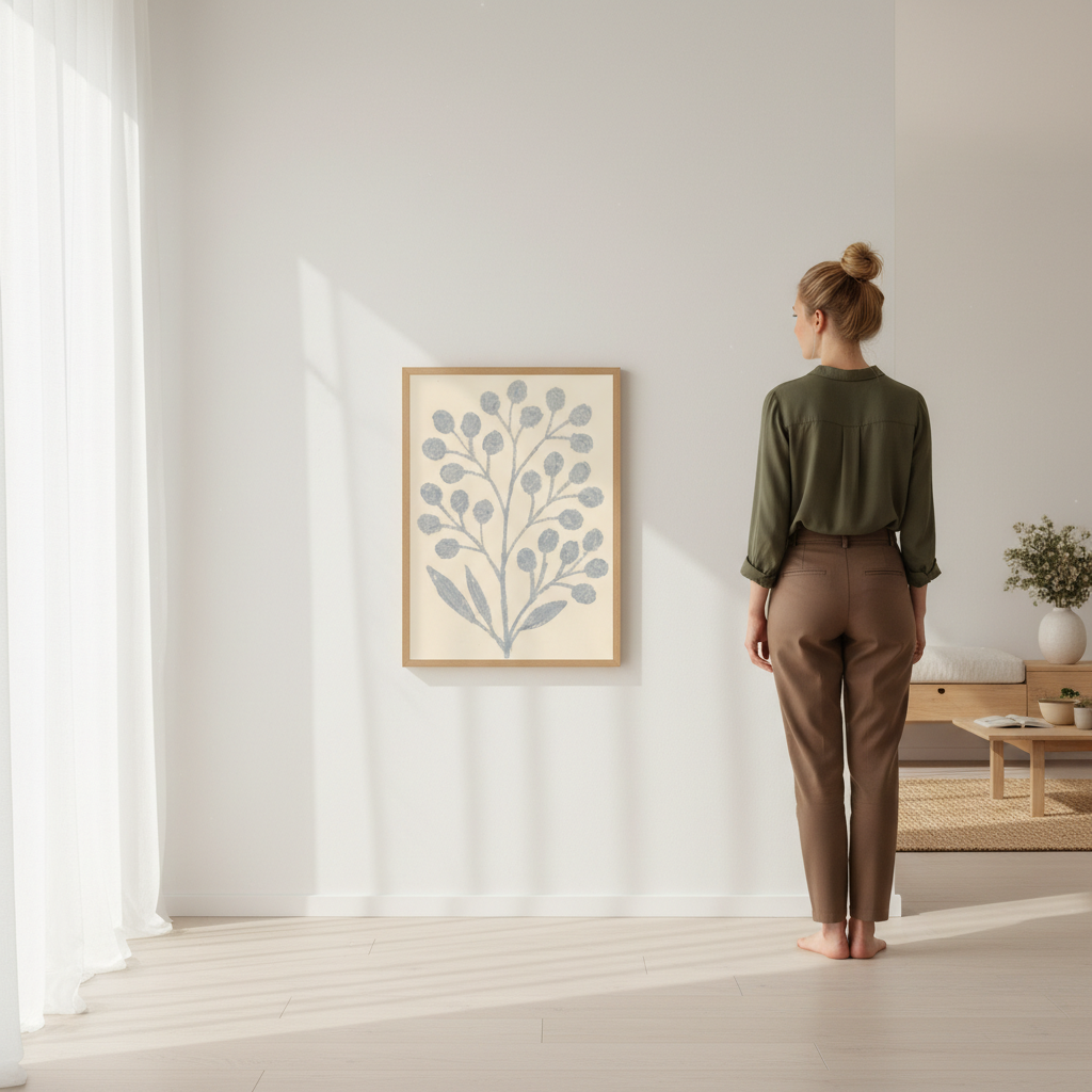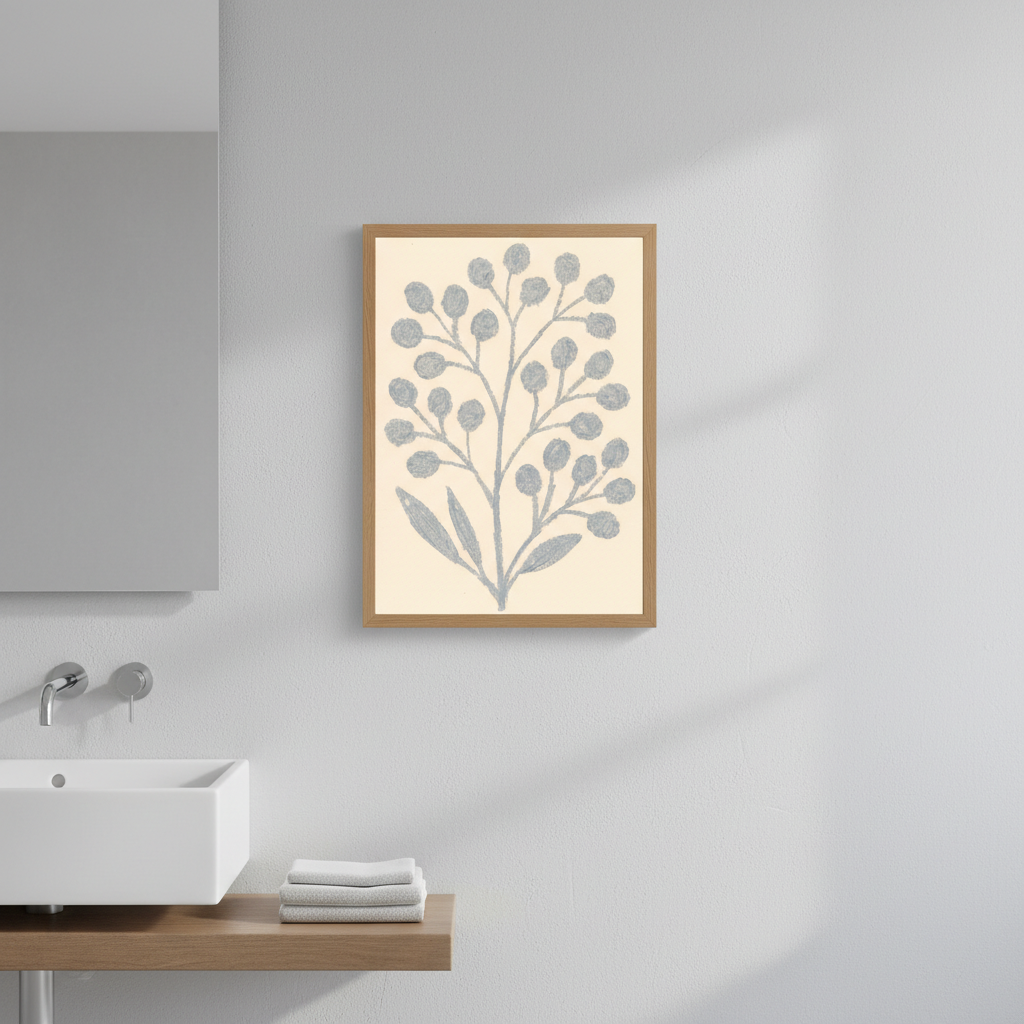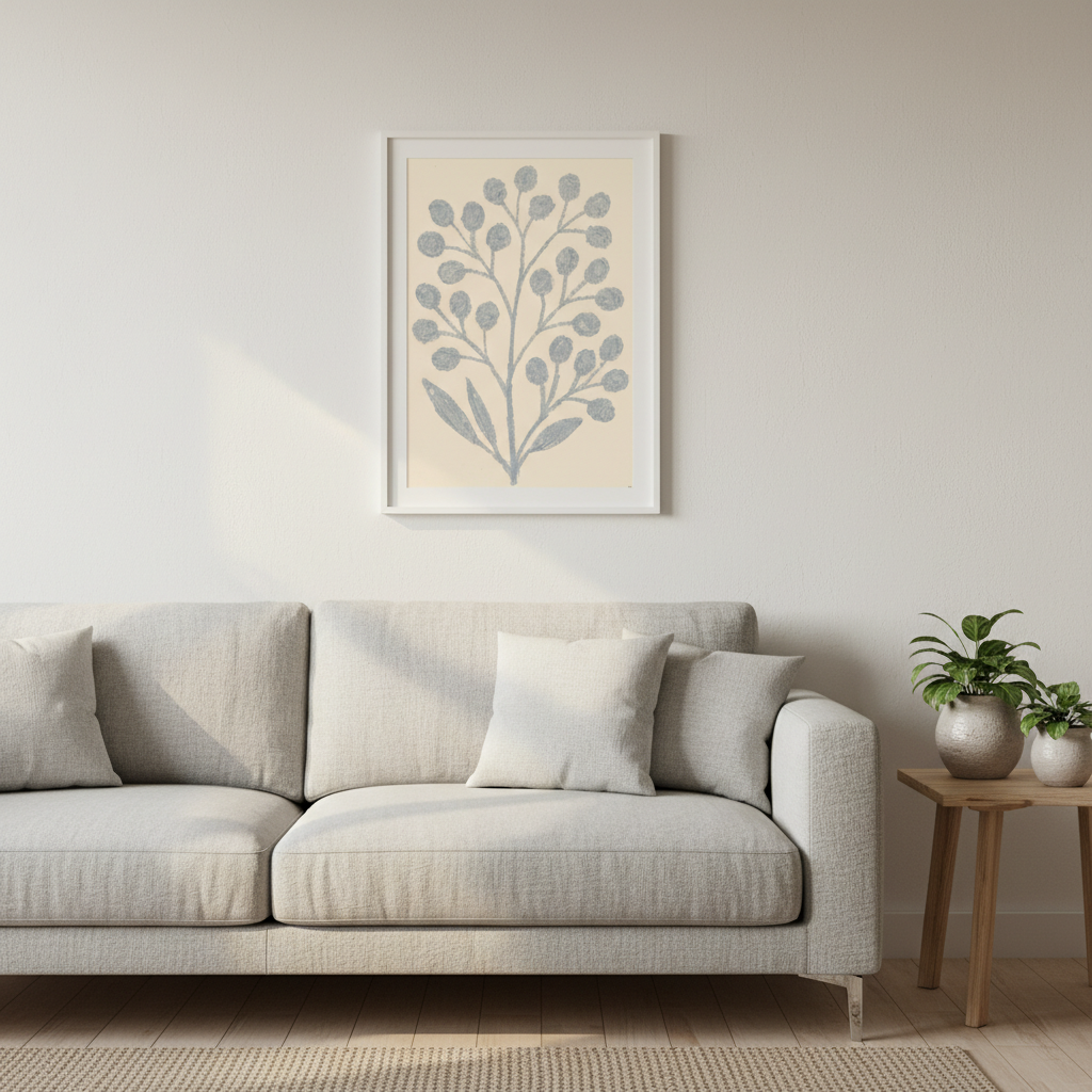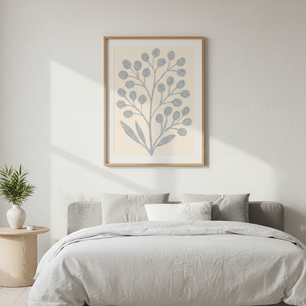 Bring organic elegance to your space with this botanical wall art featuring delicate branches adorned with berries rendered in sophisticated blue tones against a warm beige backdrop. The intricate linework captures the natural beauty of flora with artistic precision, creating a refined focal point that complements both contemporary and traditional interiors. Perfect for adding understated sophistication to living rooms, bedrooms, or studies, this piece balances visual interest with calming, nature-inspired aesthetics.