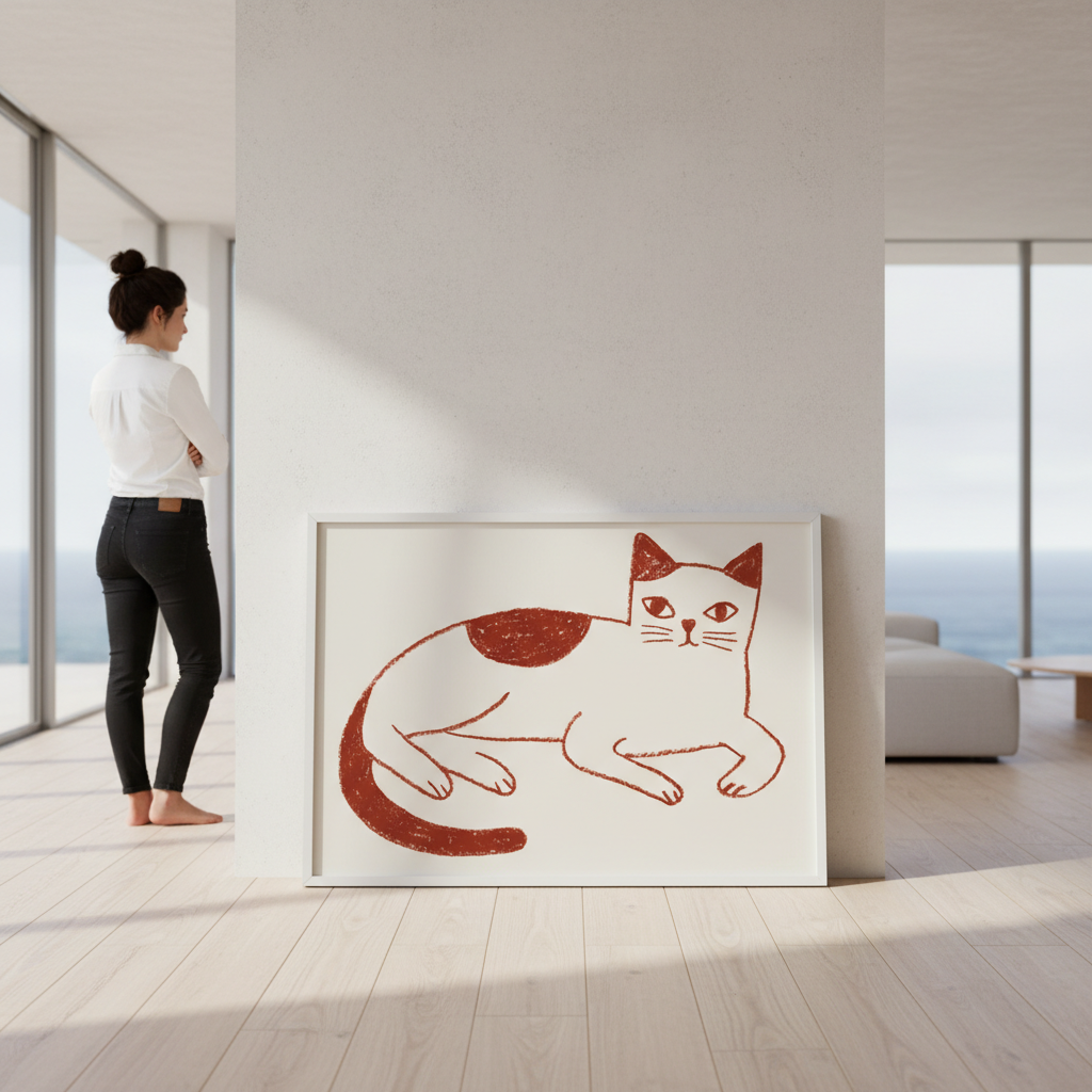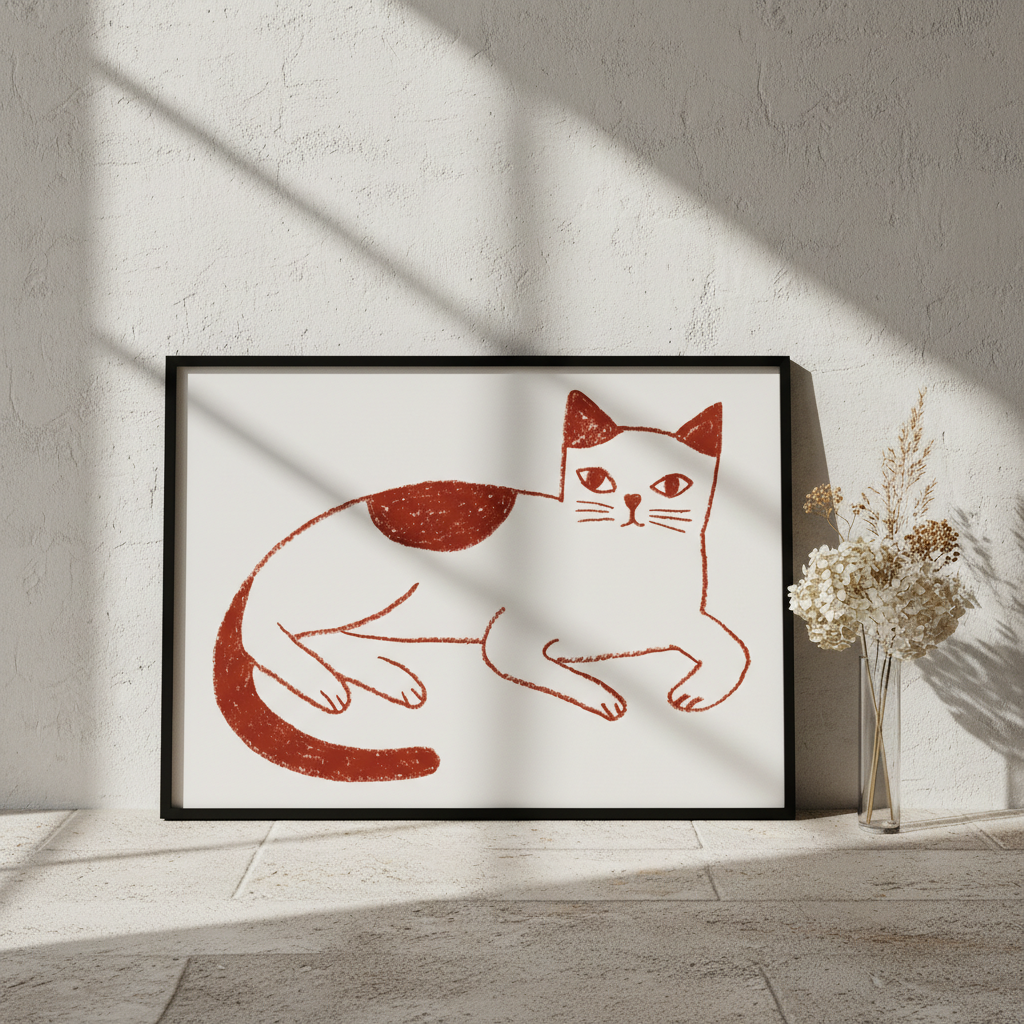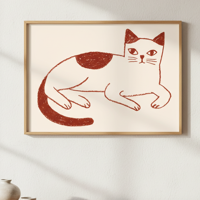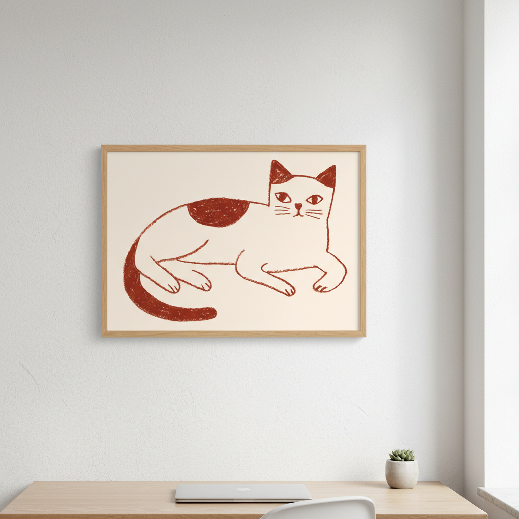 Joep by Silvia Visscher captures the charm of feline companionship through thoughtful illustration. This artwork features a distinctive cat rendered with a warm brown spot against a soft beige backdrop, creating a serene and inviting aesthetic. The composition balances simplicity with character, making it an ideal choice for spaces seeking understated elegance. Perfect for cat enthusiasts and art collectors who appreciate contemporary illustration with personality, this piece brings a gentle focal point to any room while maintaining sophisticated restraint in its colour palette and design approach.