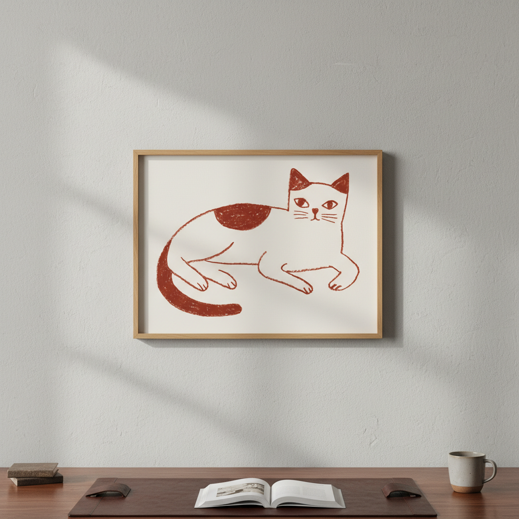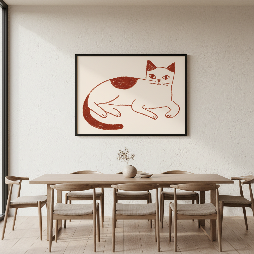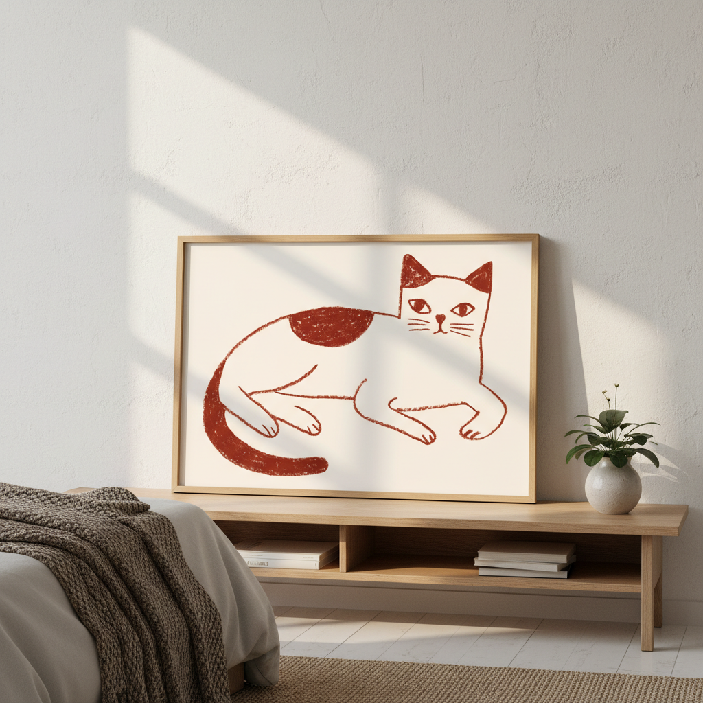 Joep by Silvia Visscher captures the charm of feline companionship through thoughtful illustration. This artwork features a distinctive cat rendered with a warm brown spot against a soft beige backdrop, creating a serene and inviting aesthetic. The composition balances simplicity with character, making it an ideal choice for spaces seeking understated elegance. Perfect for cat enthusiasts and art collectors who appreciate contemporary illustration with personality, this piece brings a gentle focal point to any room while maintaining sophisticated restraint in its colour palette and design approach.