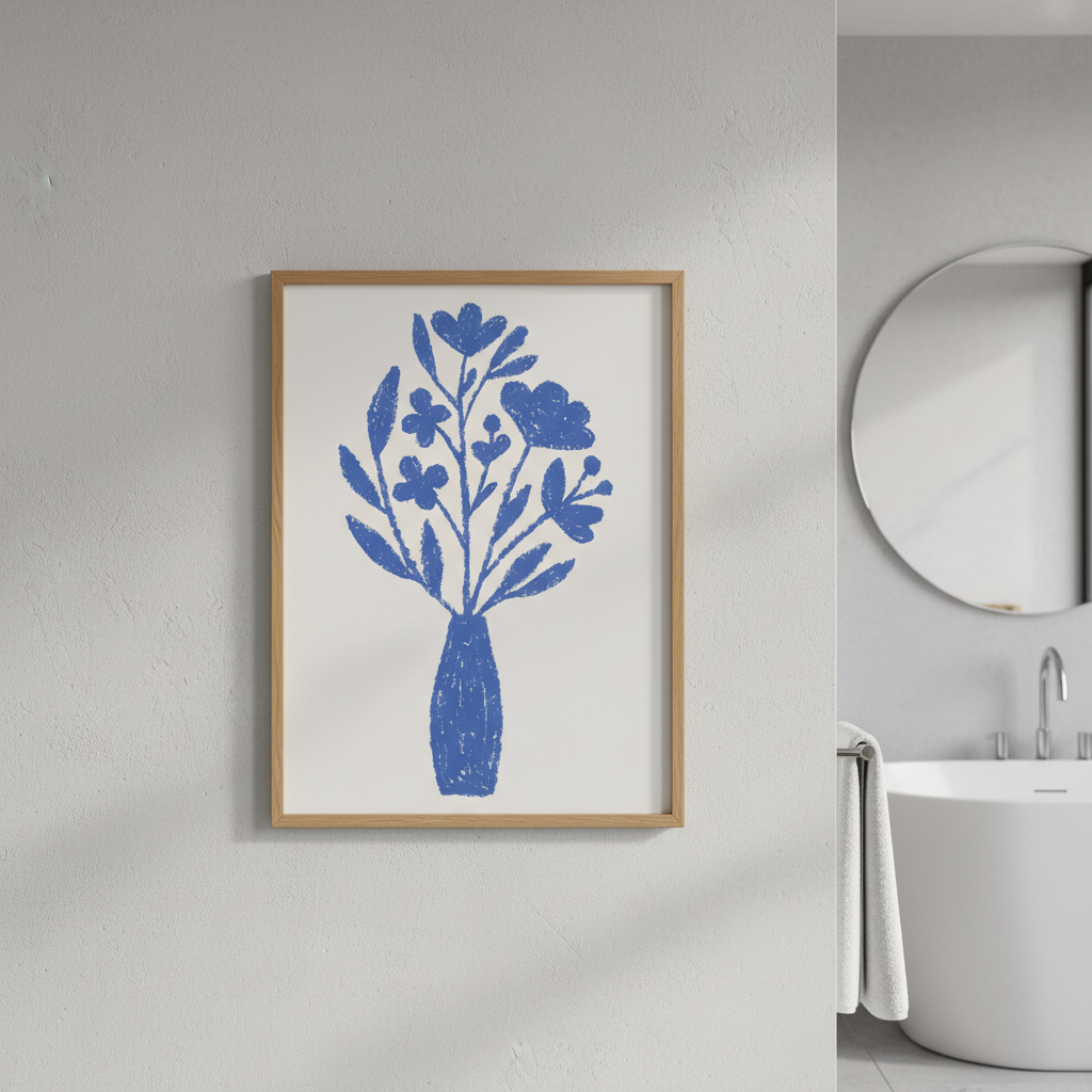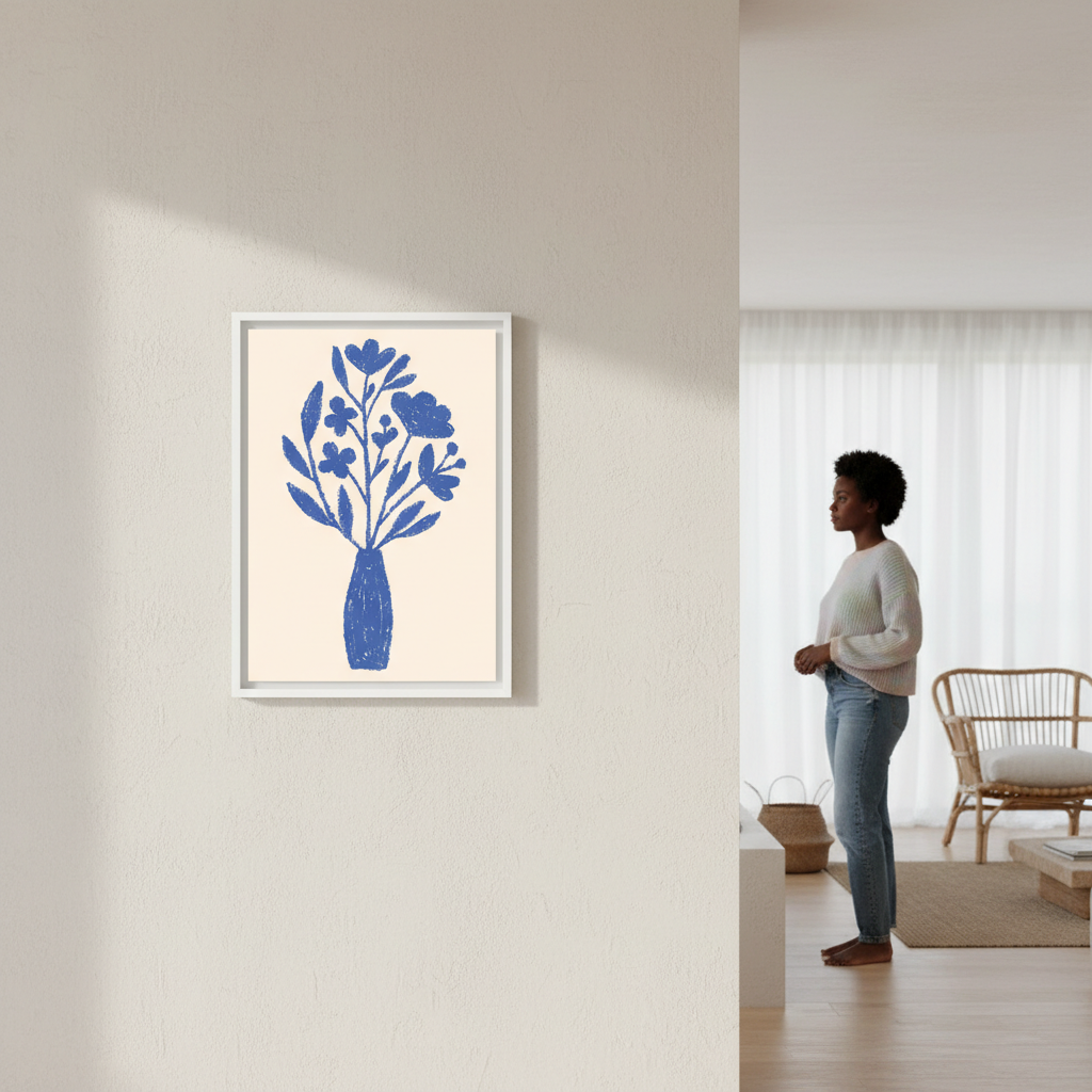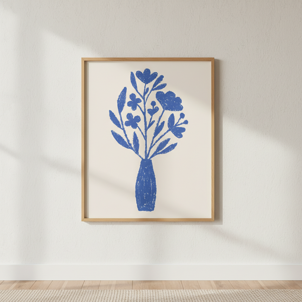 Vase in Bloom by Silvia Visscher captures the serene elegance of a blue floral arrangement set against a warm, neutral backdrop. This striking artwork showcases delicate botanical forms rendered in cool tones, creating a sophisticated focal point for any interior. The composition balances vibrant florals with a calming beige background, making it an ideal choice for those seeking to introduce colour and botanical interest without overwhelming their space. Perfect for adding refined, gallery-quality appeal to living areas, bedrooms, or studies.