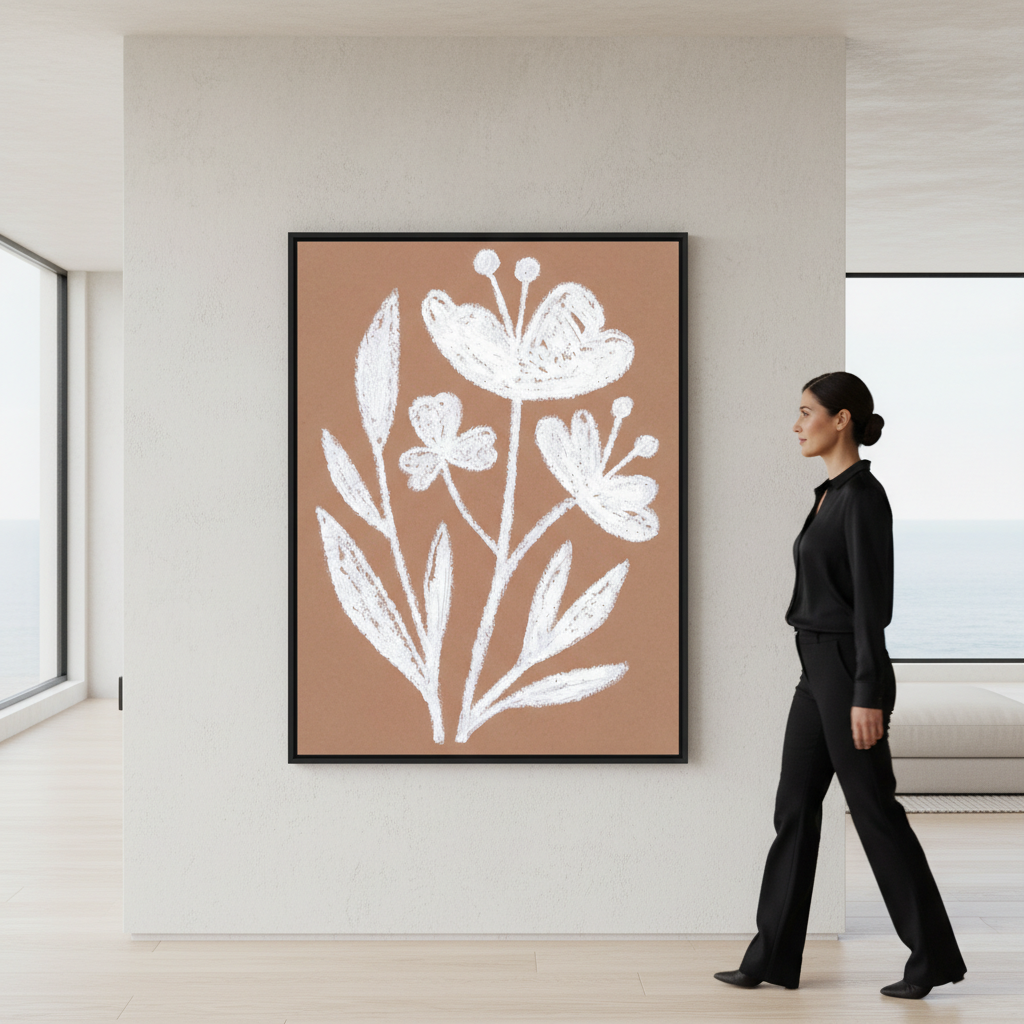 White Flowers by Silvia Visscher presents an elegant botanical composition featuring delicate white florals rendered in fine detail against a warm brown backdrop. This sophisticated illustration balances minimalist aesthetics with naturalistic precision, creating a versatile piece suitable for contemporary and traditional interiors alike. The neutral colour palette ensures seamless integration with existing décor whilst the botanical subject matter adds organic refinement to any space. Ideal for those seeking understated elegance with artistic depth.