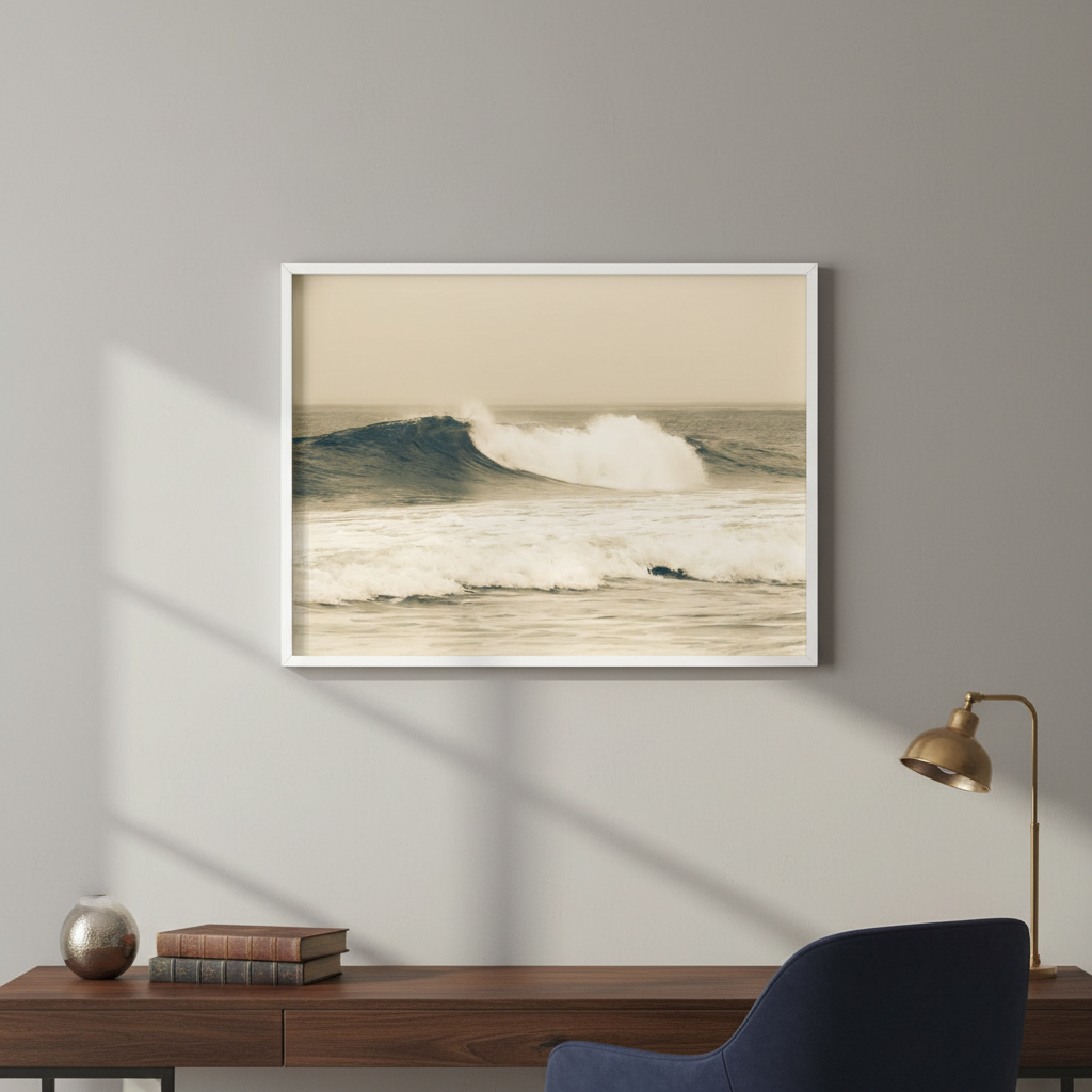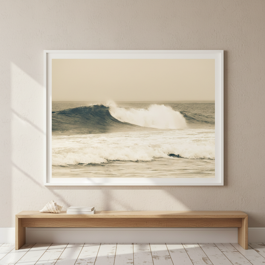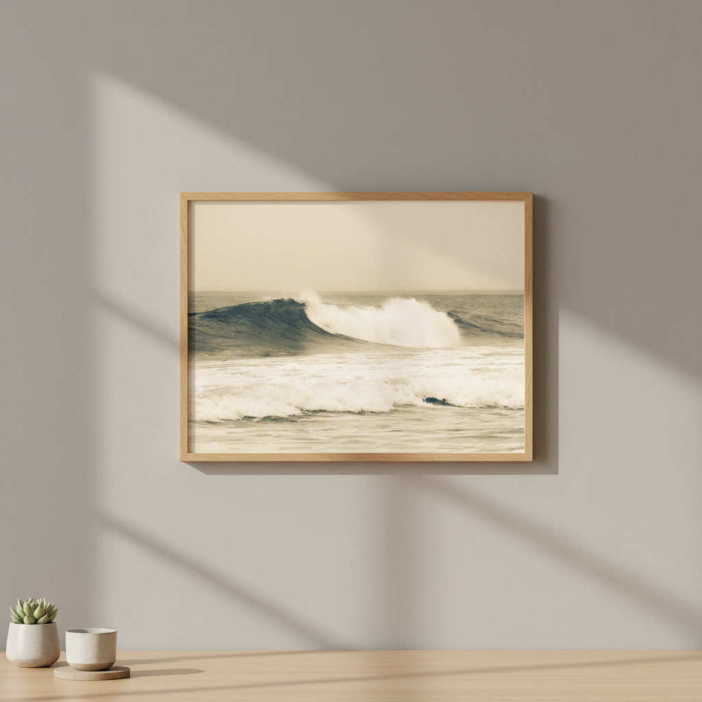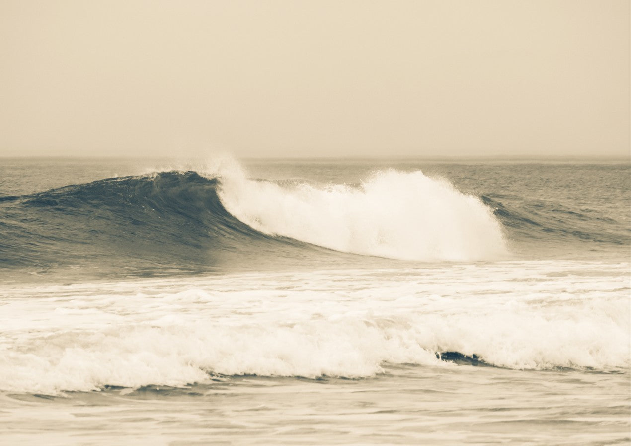 Capture the raw power of nature with this stunning large wave photograph, rendered in warm sepia tones that evoke timeless coastal beauty. This dynamic ocean scene brings movement and drama to any space.
