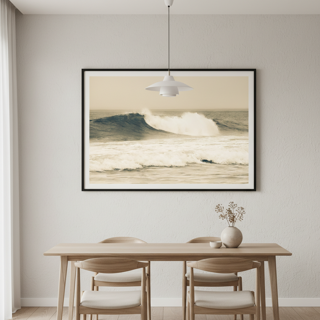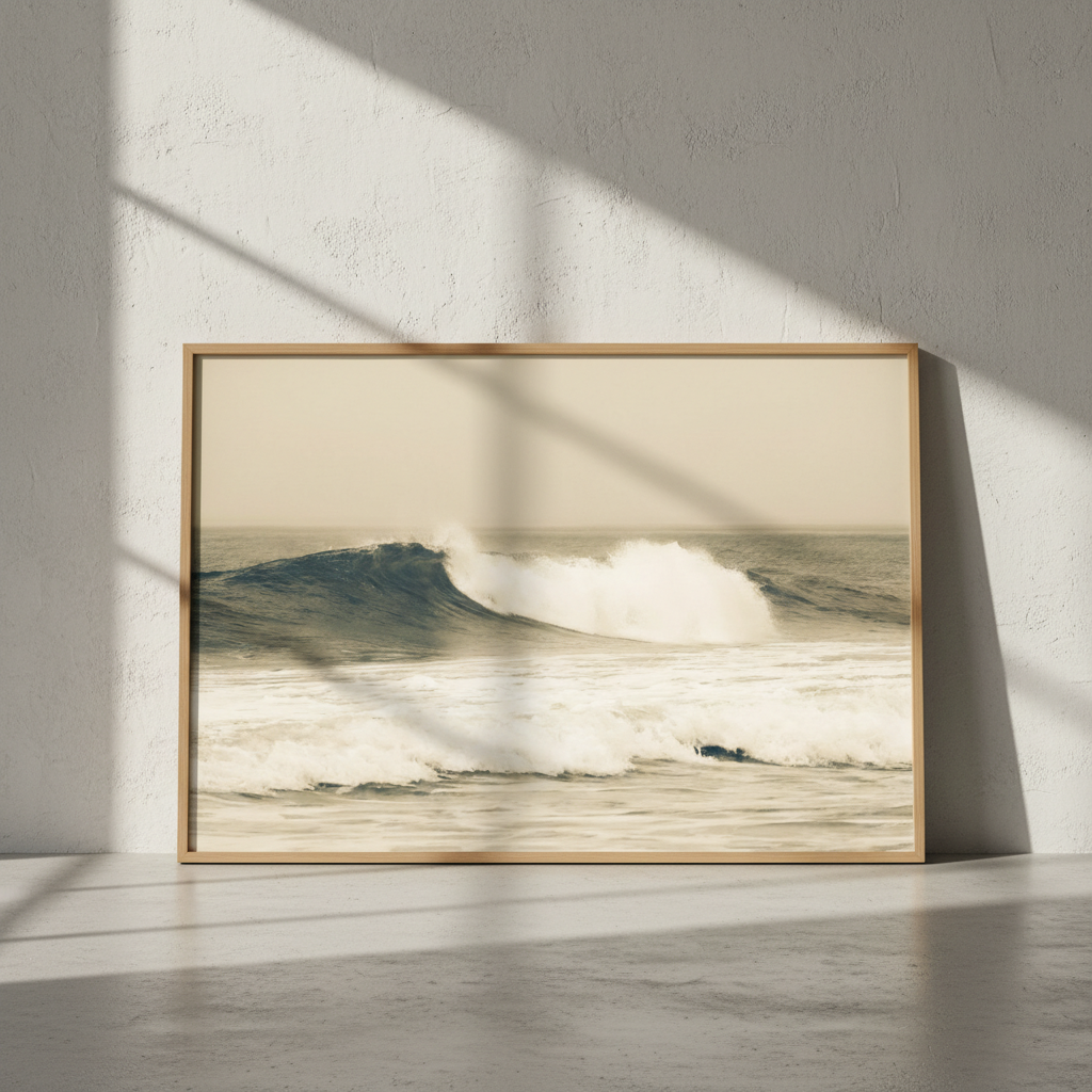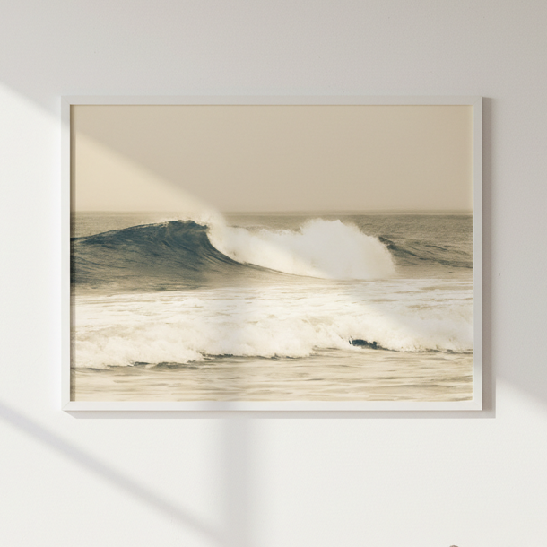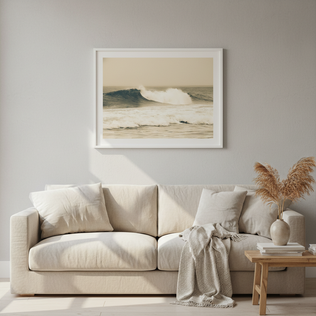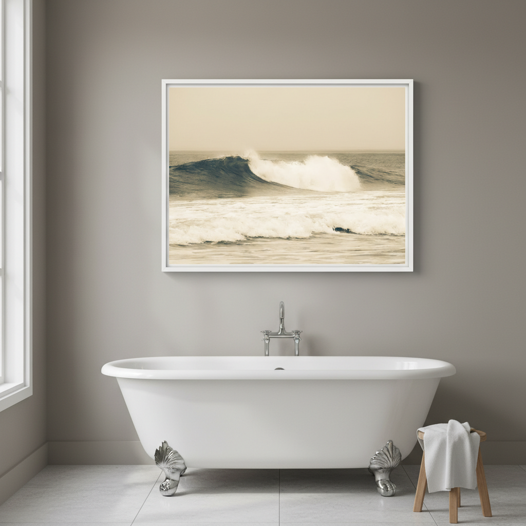 Capture the raw power of nature with this stunning large wave photograph, rendered in warm sepia tones that evoke timeless coastal beauty. This dynamic ocean scene brings movement and drama to any space.
