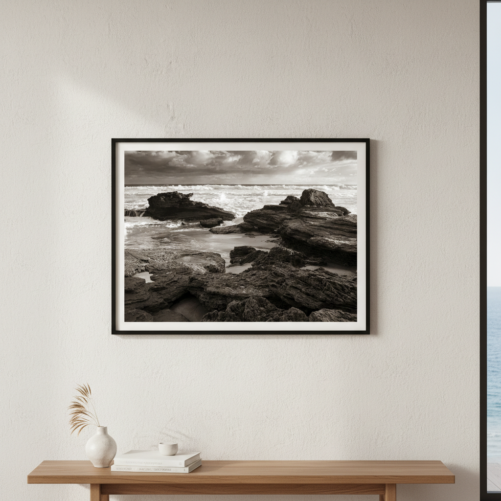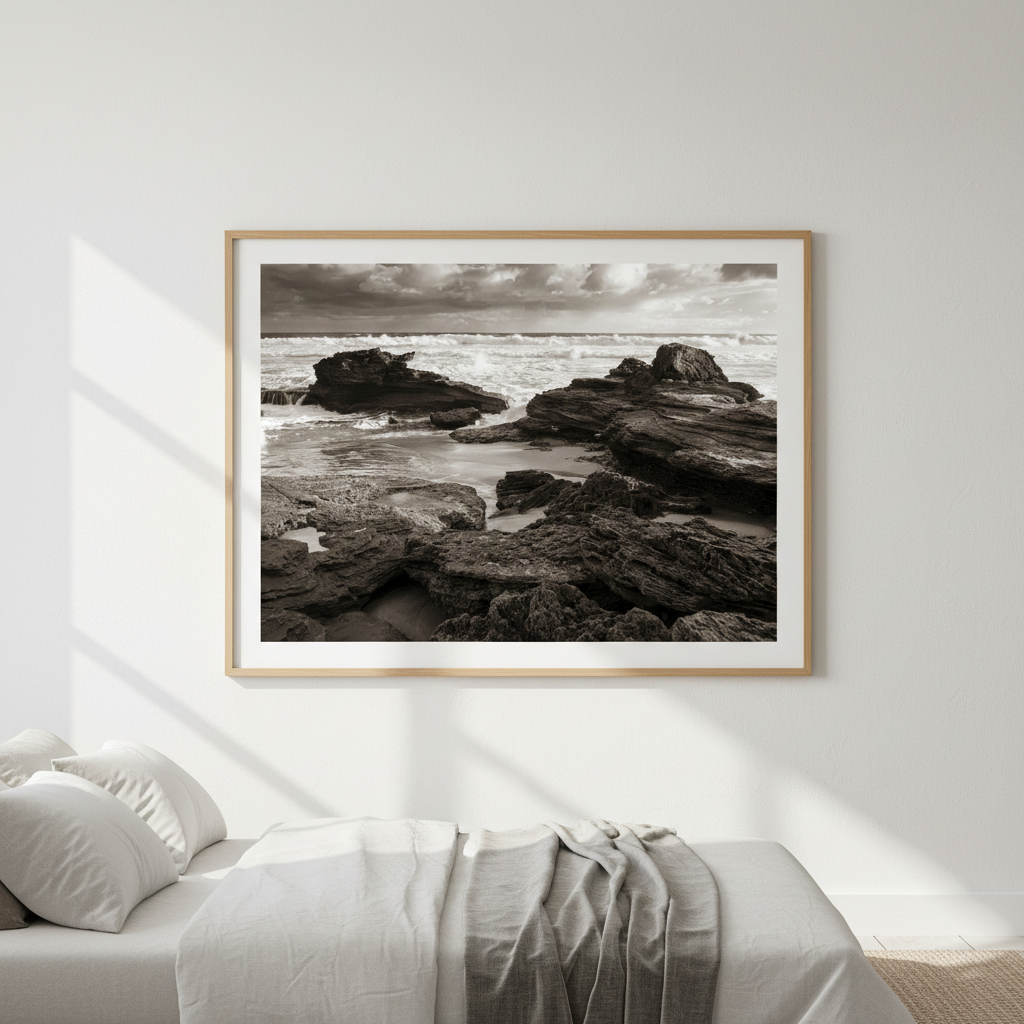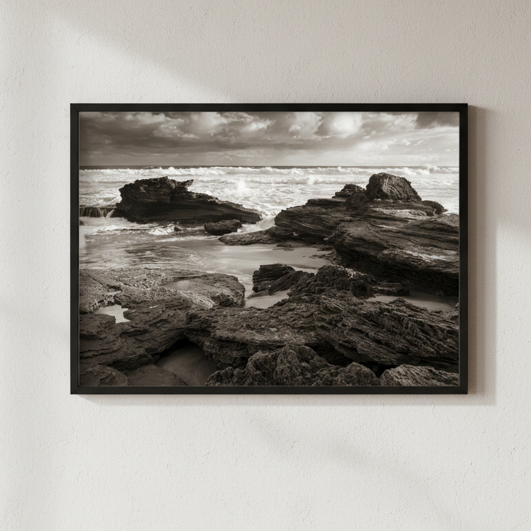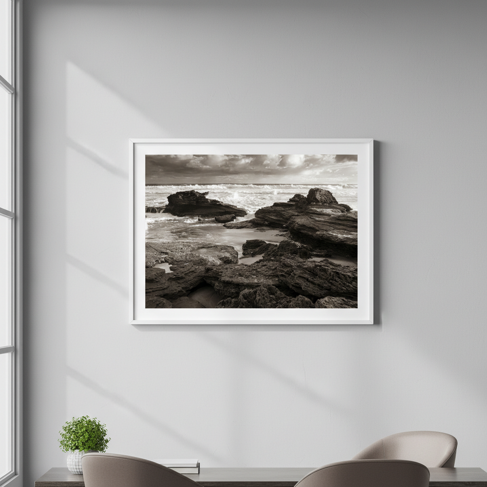 Capture the raw power of nature with this striking black and white photograph of a rocky coastline, where dramatic waves crash against weathered stone. Steven Scott's "Edge of the Storm" showcases the timeless beauty of coastal landscapes through masterful composition and contrast.