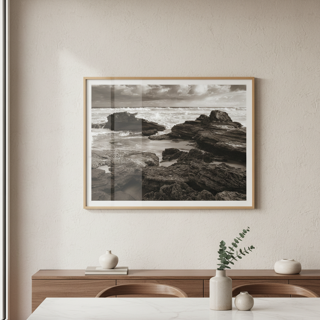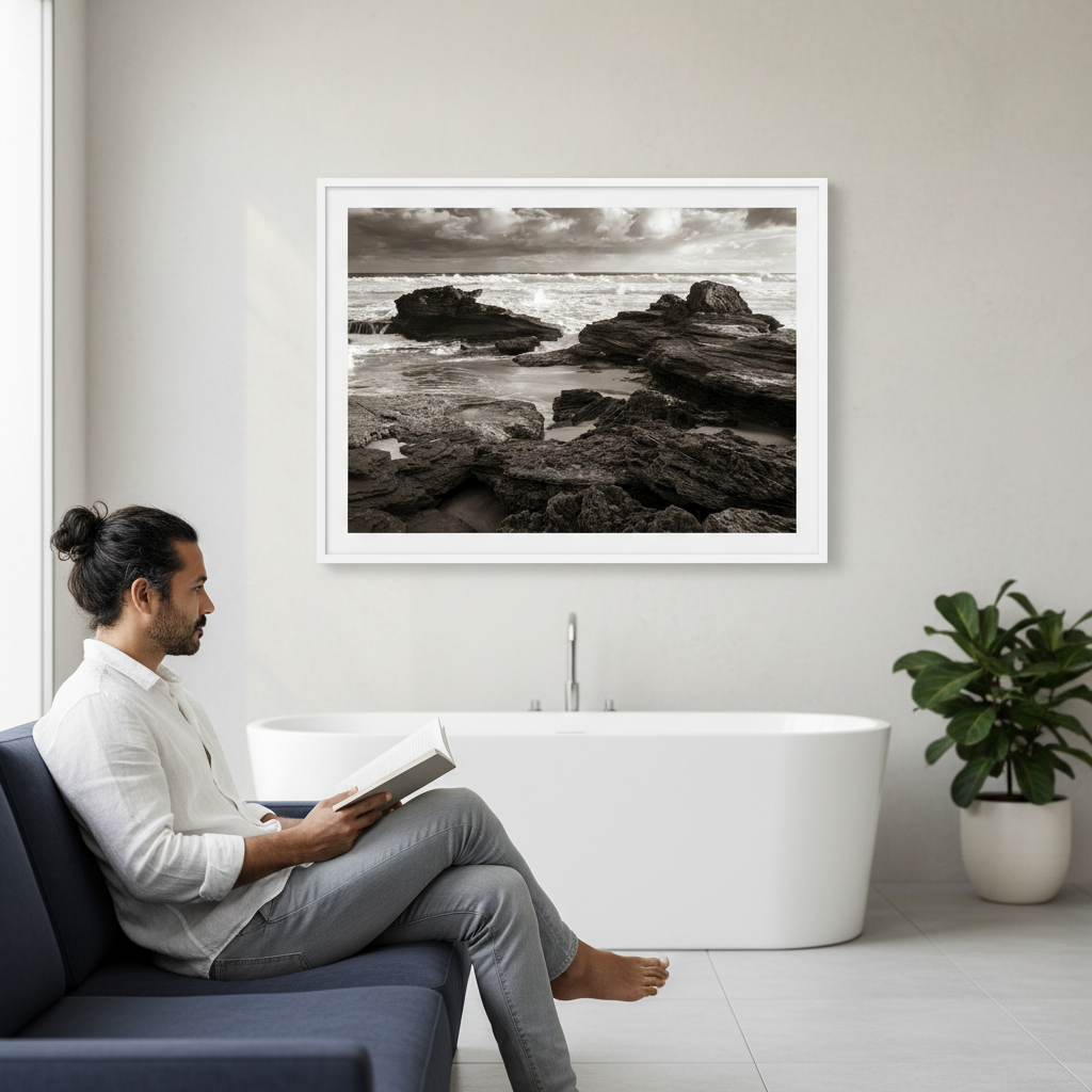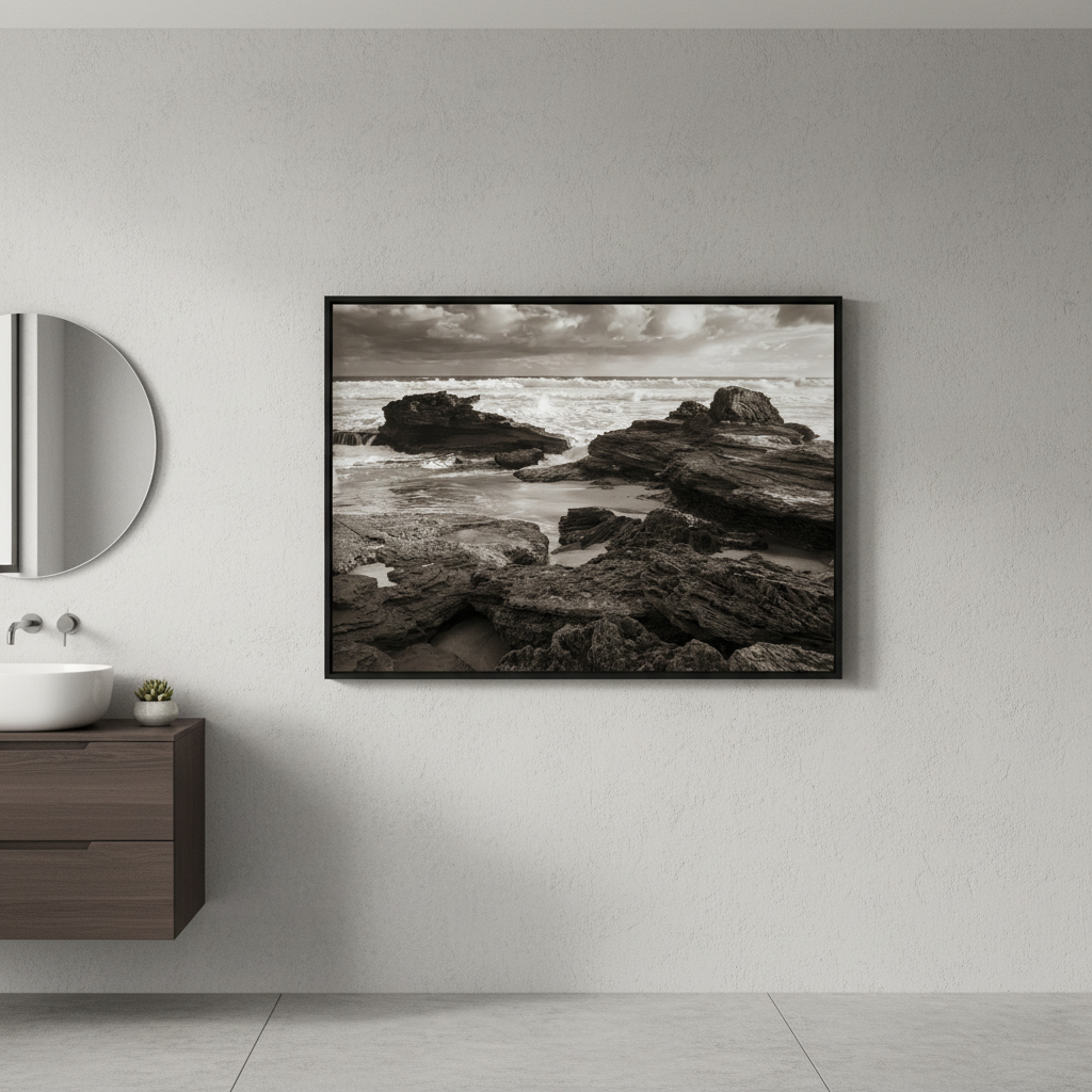 Capture the raw power of nature with this striking black and white photograph of a rocky coastline, where dramatic waves crash against weathered stone. Steven Scott's "Edge of the Storm" showcases the timeless beauty of coastal landscapes through masterful composition and contrast.