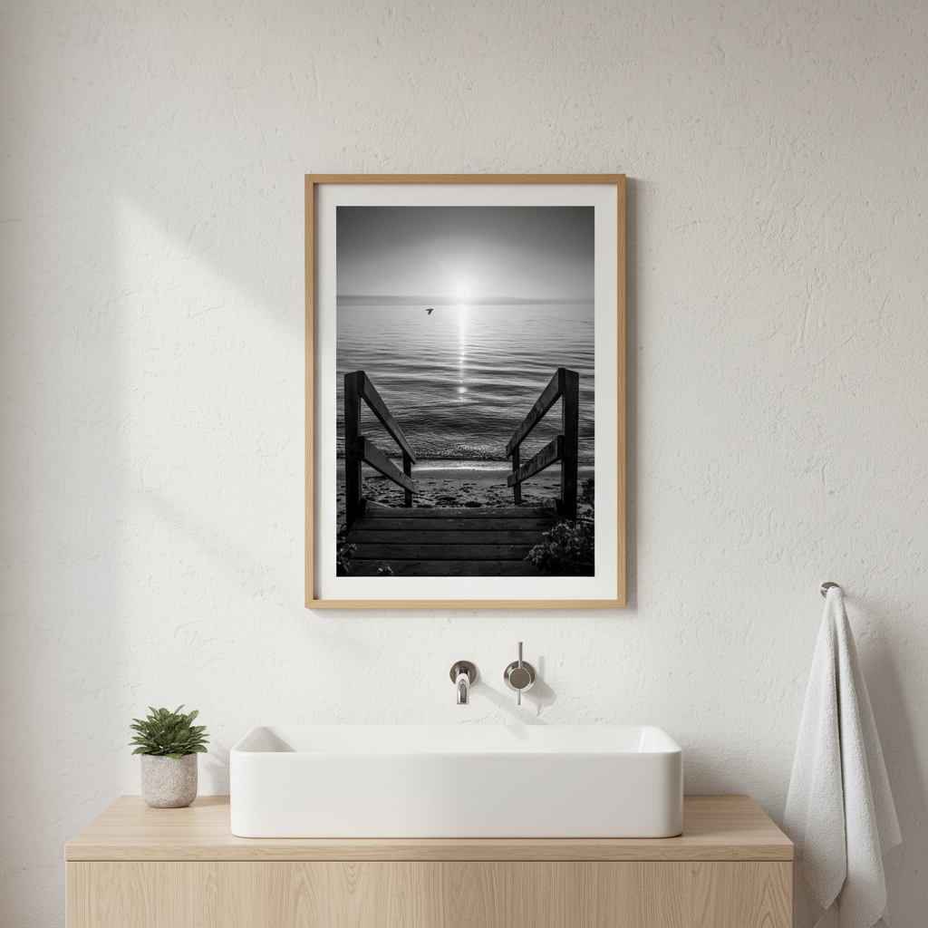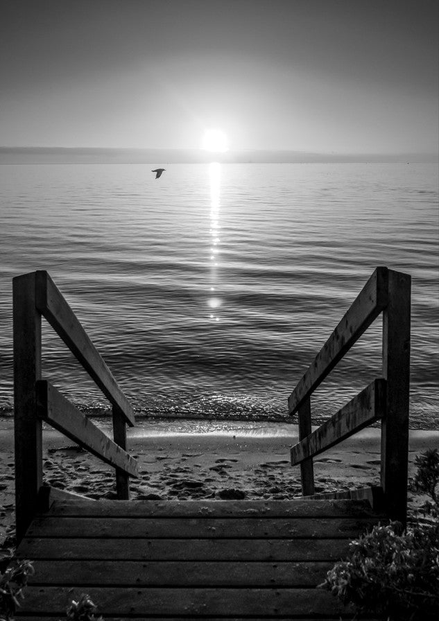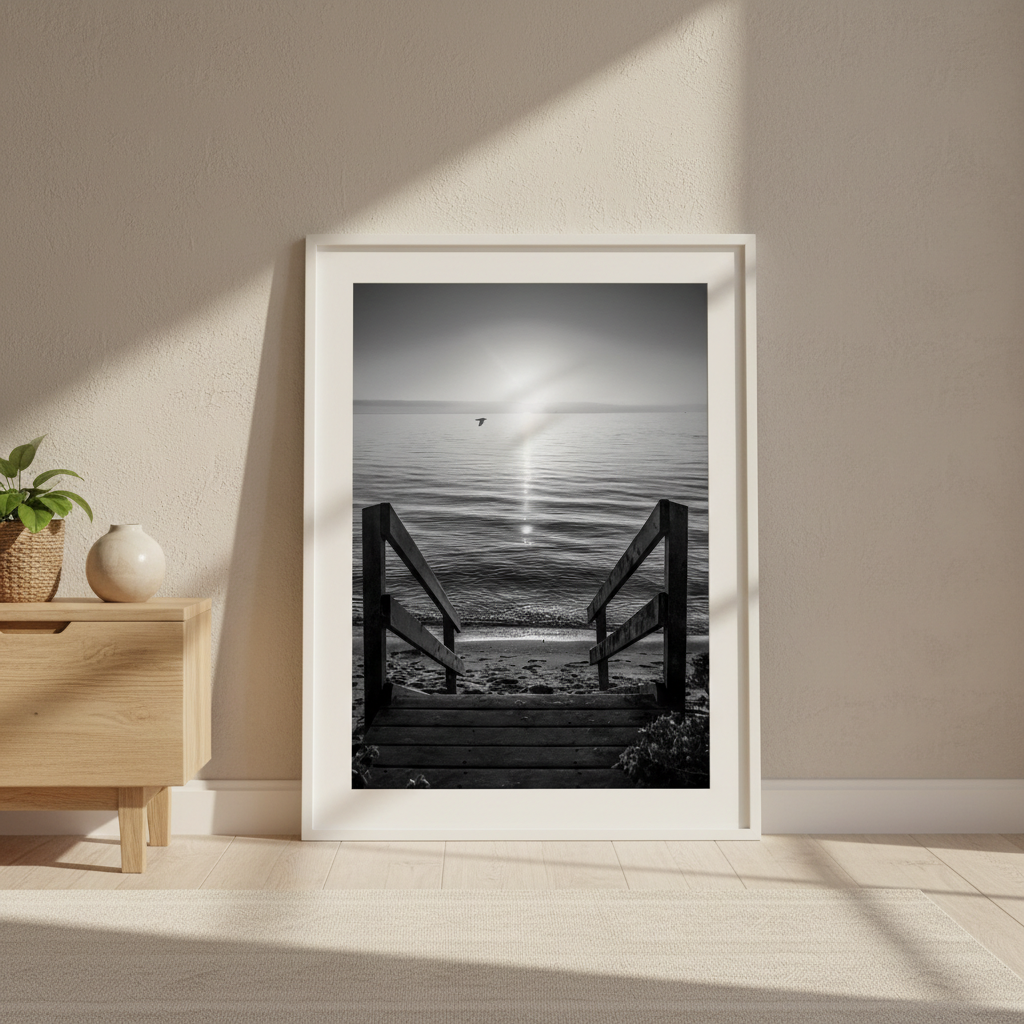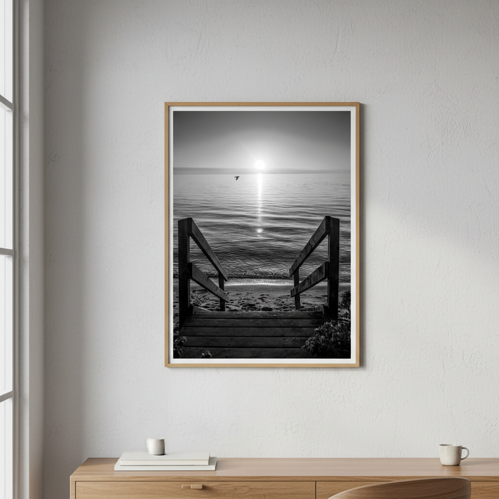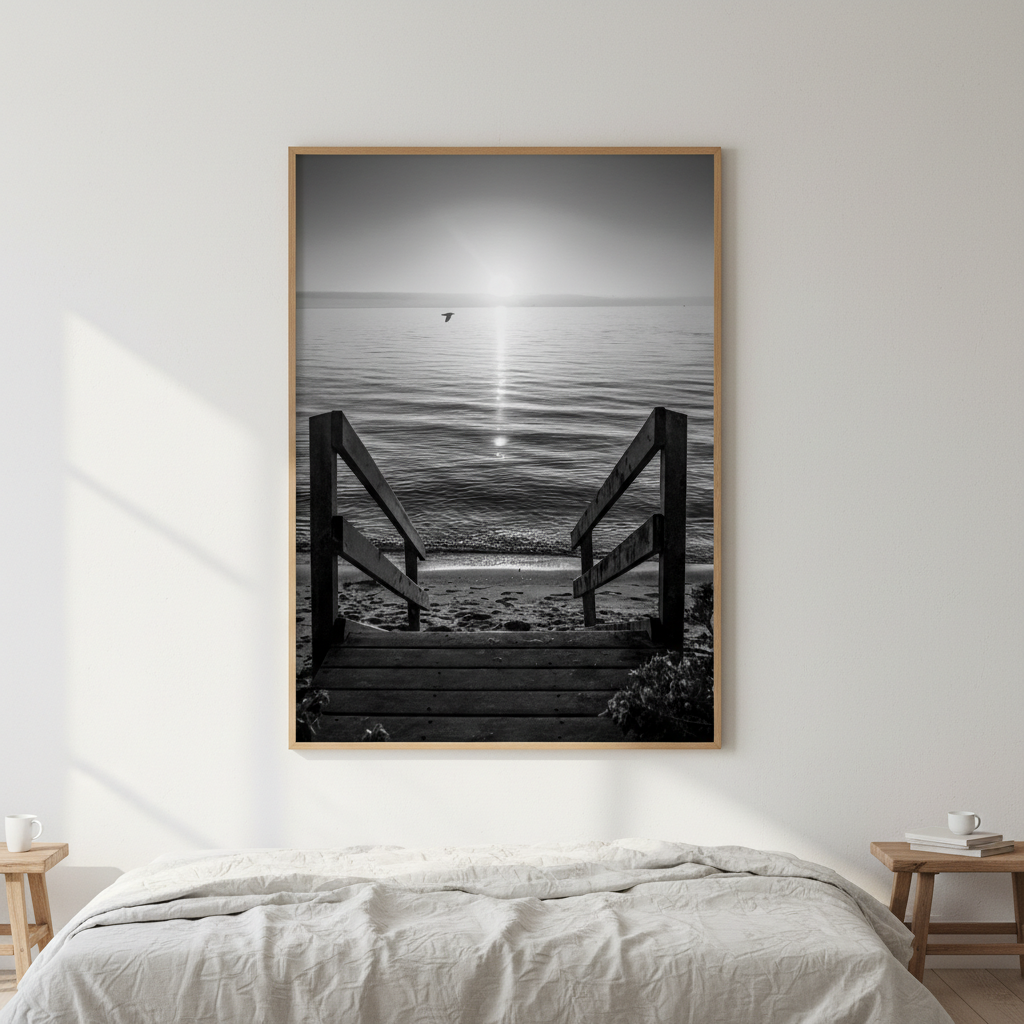 Transport yourself to tranquility with this stunning black and white photograph capturing a wooden walkway stretching toward a sunlit beach horizon. This evocative artwork draws the viewer's eye along the weathered timber path, creating a sense of journey and peaceful escape.