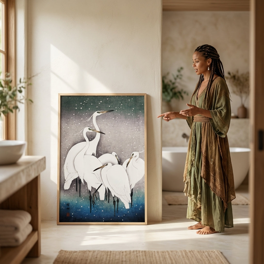 Discover the serene beauty of this exquisite Japanese woodblock print, capturing elegant egrets amidst a pristine snowy landscape. Created in 1925, this masterwork exemplifies the refined artistic tradition of ukiyo-e, showcasing delicate brushwork and sophisticated composition. The monochromatic palette emphasizes the graceful forms of the birds against the winter scenery, creating a contemplative mood that transports viewers to a tranquil moment in nature. Perfect for collectors of fine art and those seeking to infuse their space with timeless Japanese aesthetics and cultural heritage.