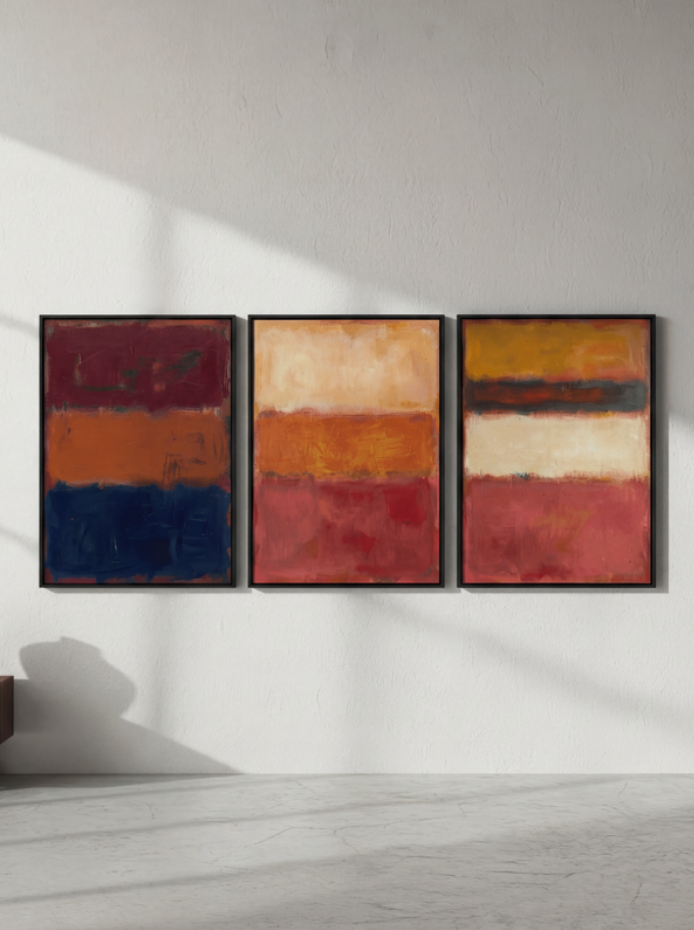 Inspired by the colour field paintings of Mark Rothko, this striking trio captures the essence of abstract expressionism through layered, luminous hues. Each canvas features bold blocks of colour that interact and shift, creating emotional depth and visual movement. Perfect for contemporary interiors, the three matching prints work together to command attention while maintaining sophisticated restraint. Ideal for creating a gallery-style feature wall that celebrates modern art without overwhelming the space.