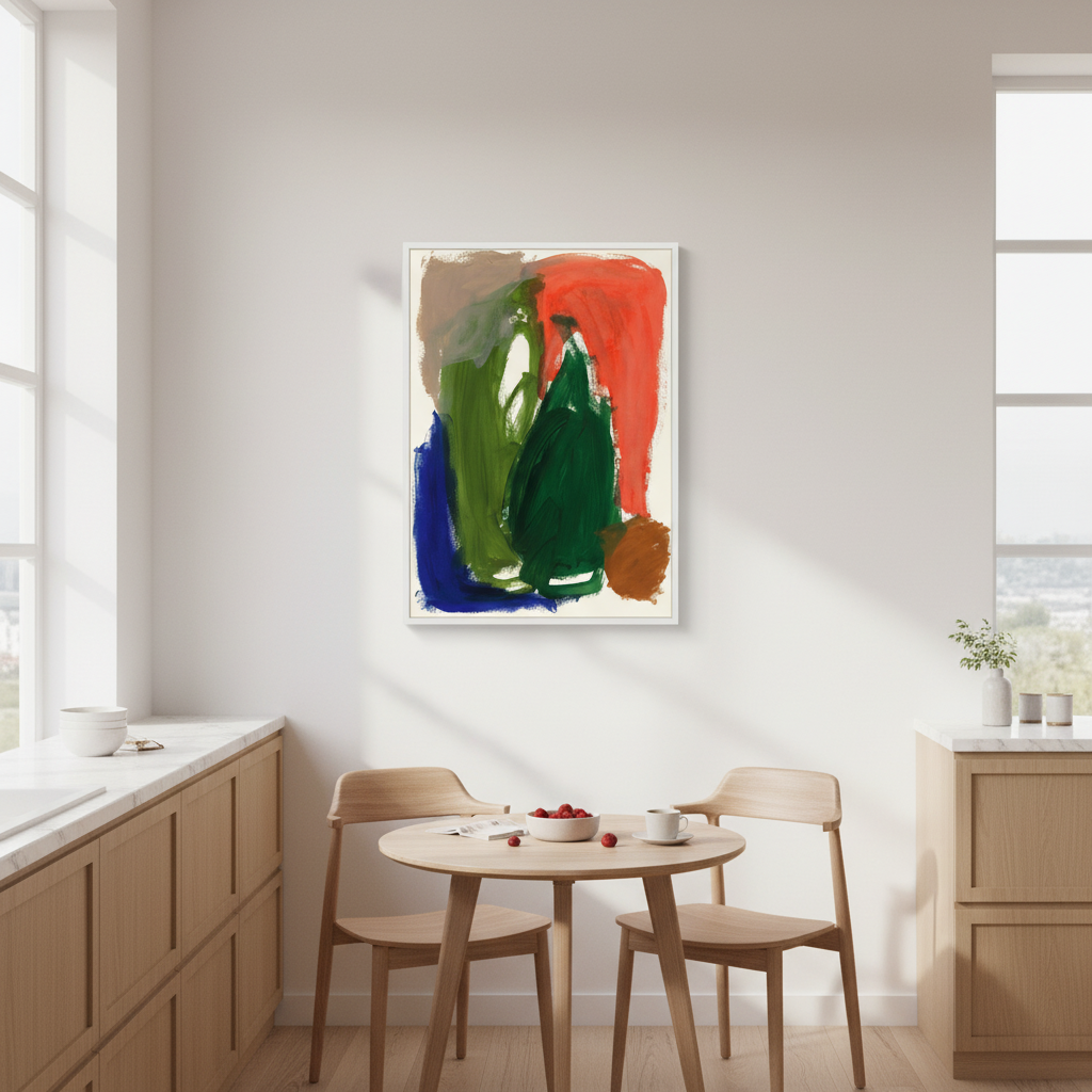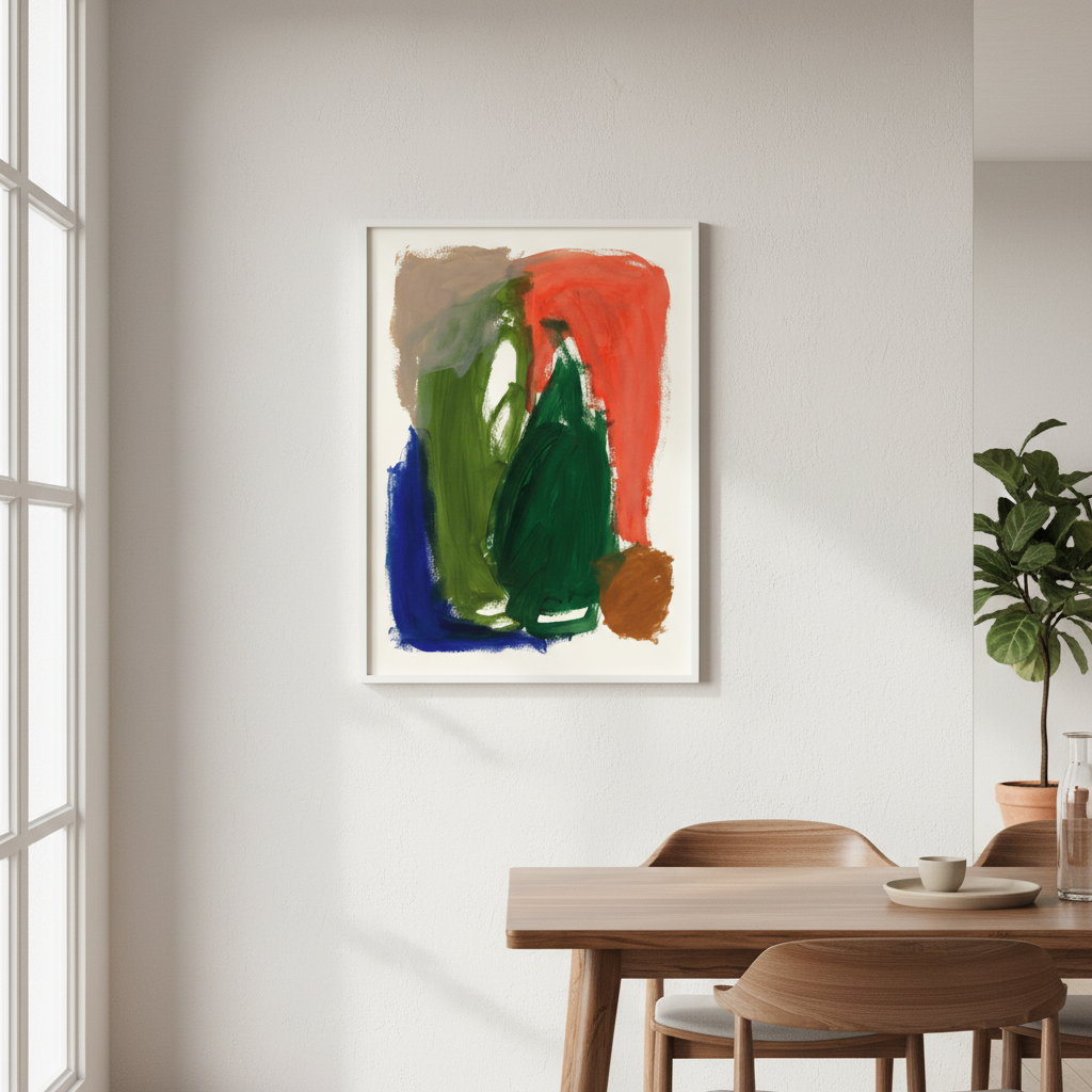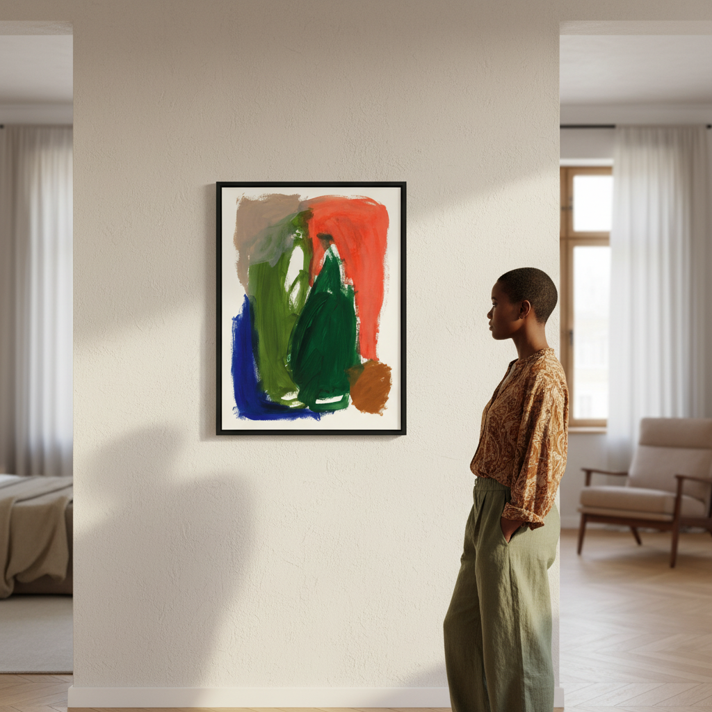 Gaia by Berit Mongensen Lopez presents a compelling exploration of form and colour through abstract composition. Vibrant green geometric shapes dance across a richly layered multicoloured background, creating dynamic visual tension and movement. This contemporary piece invites contemplation whilst commanding attention in any interior space. The interplay between the bold green elements and the complex background palette demonstrates sophisticated colour theory and compositional balance. An ideal choice for collectors seeking meaningful abstract art that sparks conversation and elevates modern décor.