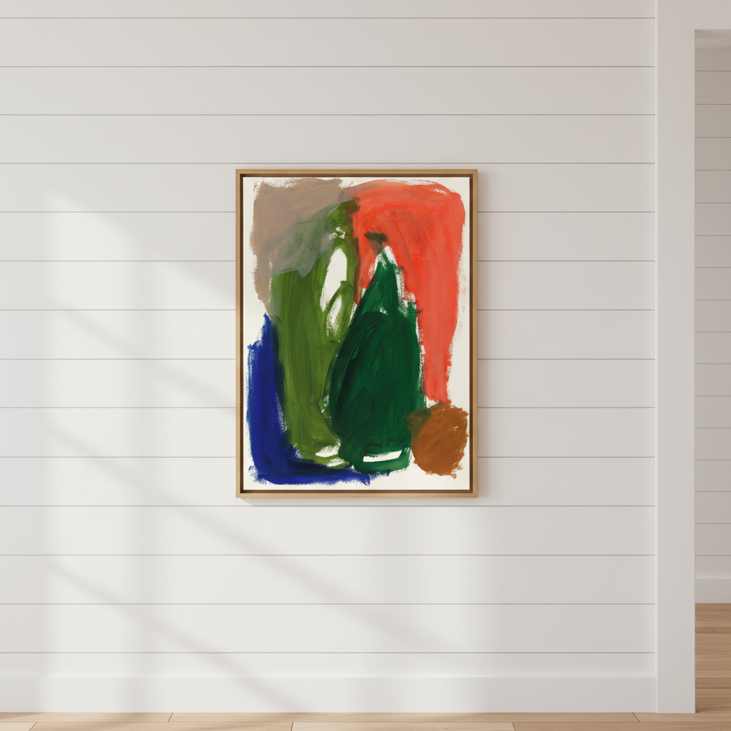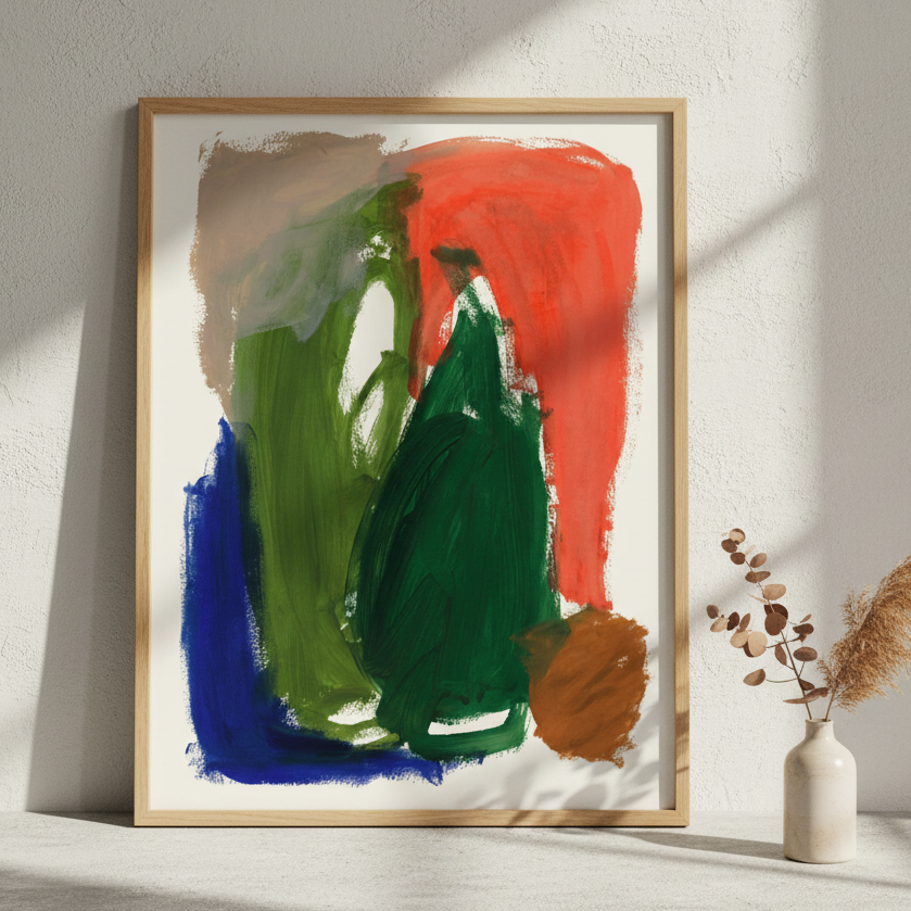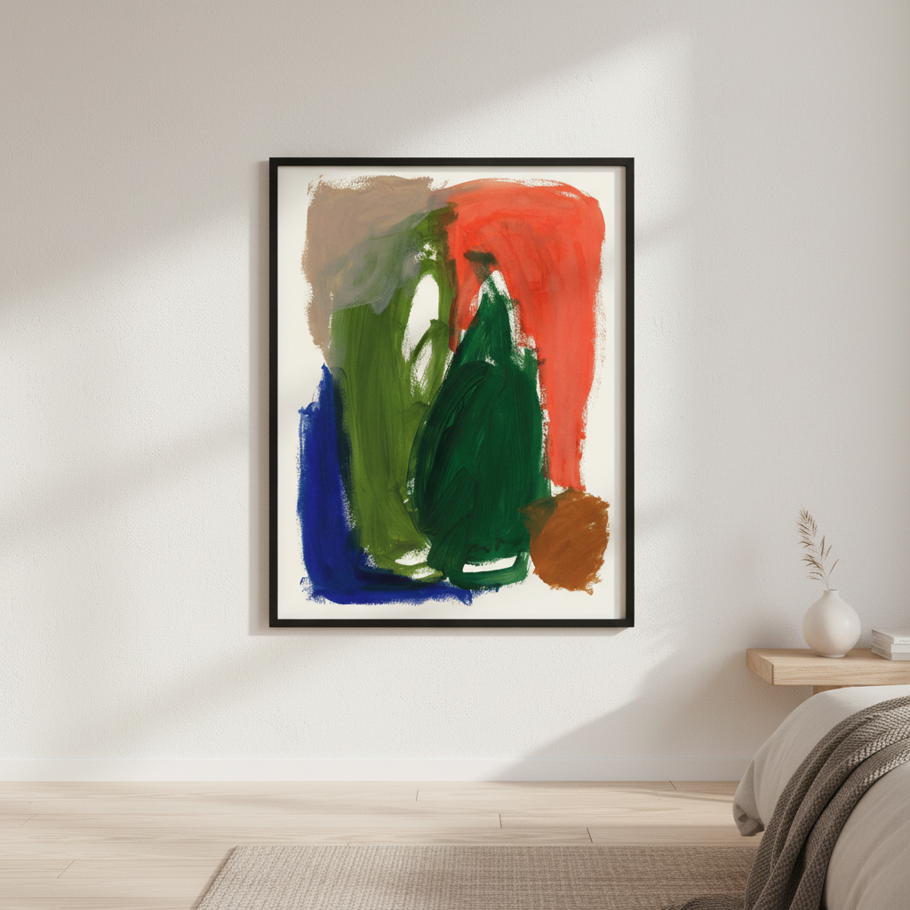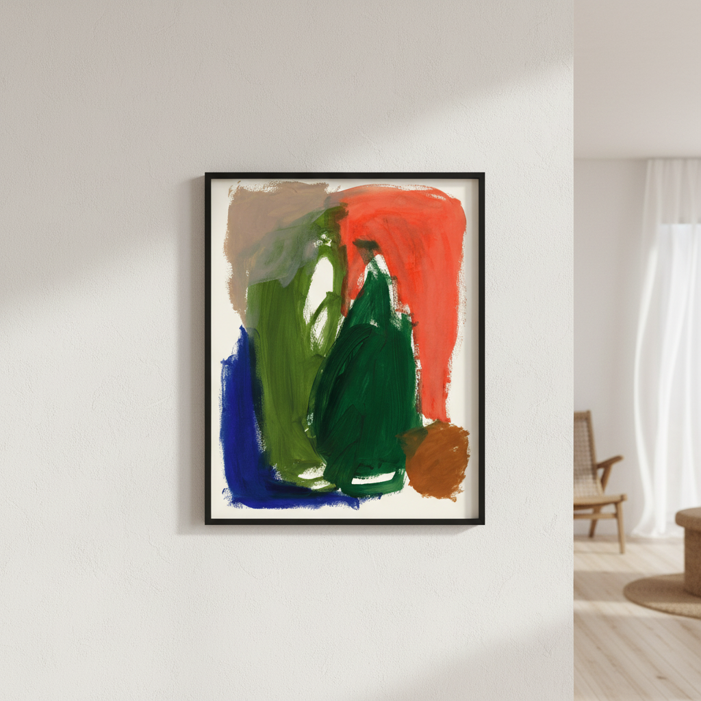 Gaia by Berit Mongensen Lopez presents a compelling exploration of form and colour through abstract composition. Vibrant green geometric shapes dance across a richly layered multicoloured background, creating dynamic visual tension and movement. This contemporary piece invites contemplation whilst commanding attention in any interior space. The interplay between the bold green elements and the complex background palette demonstrates sophisticated colour theory and compositional balance. An ideal choice for collectors seeking meaningful abstract art that sparks conversation and elevates modern décor.
