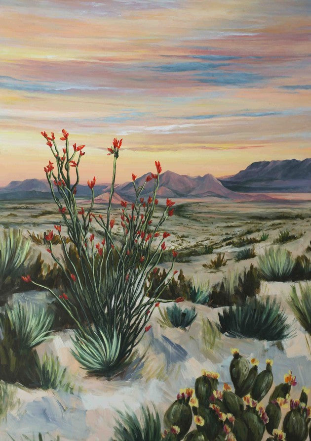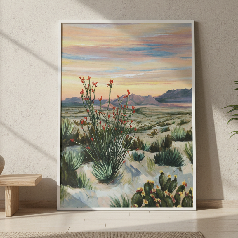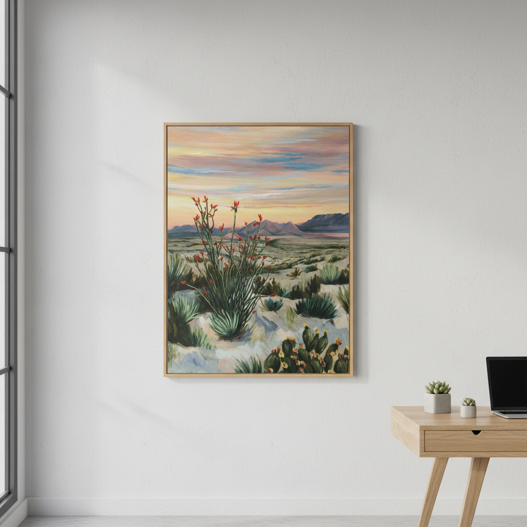 Capture the raw beauty of the desert with Grande Vista by Meredith O'Neal. This striking artwork showcases a sweeping landscape where vibrant cacti and wildflowers flourish against a dramatic sunset sky. The composition balances warm golden hues with deep shadows, creating depth and movement across the canvas. Perfect for those seeking to bring warmth and natural elegance into their space, this piece celebrates the resilience and colour found in arid environments. An ideal statement work for contemporary and southwestern-inspired interiors.