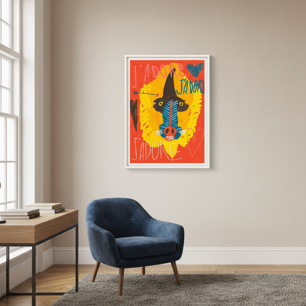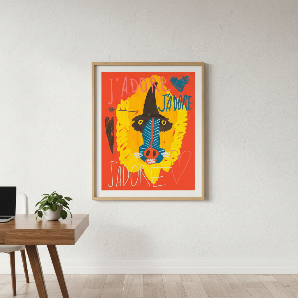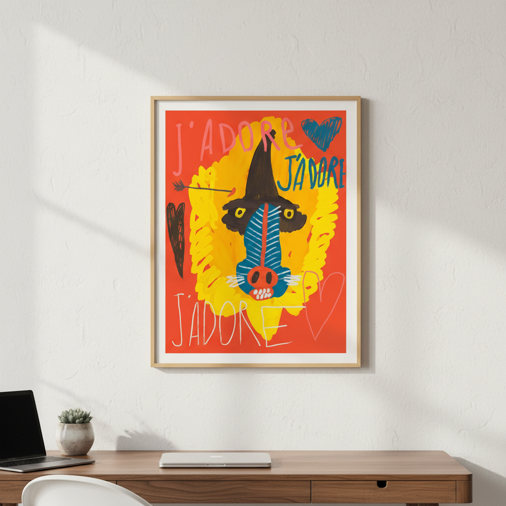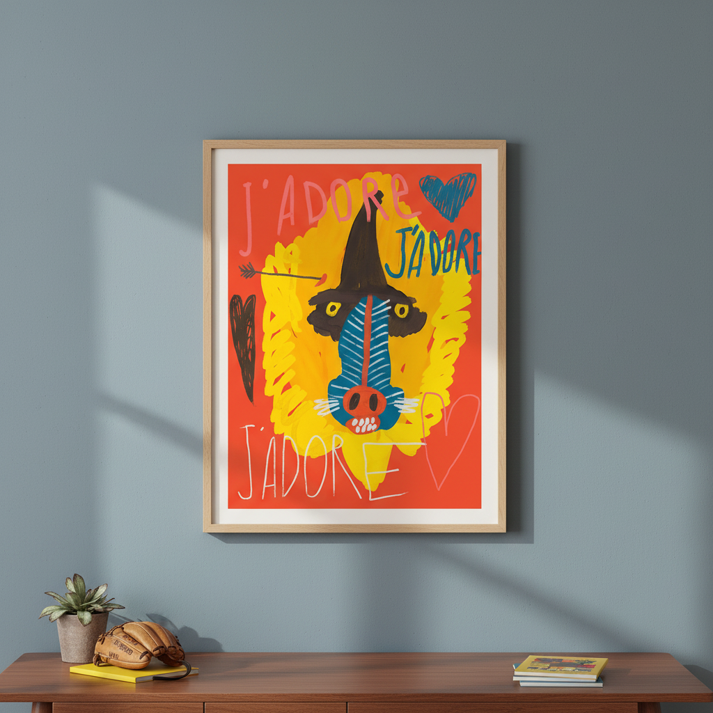 Celebrate French elegance with this striking wall art featuring a whimsical cat-like creature rendered in vibrant hues against a bold red backdrop. The iconic "J'Adore" text adds a touch of Parisian sophistication to any space. Artist Nastasiia Samokhina's distinctive illustration style brings playful charm and contemporary flair, making this piece a conversation starter for modern interiors. Perfect for adding personality and colour to bedrooms, living areas, or creative spaces.