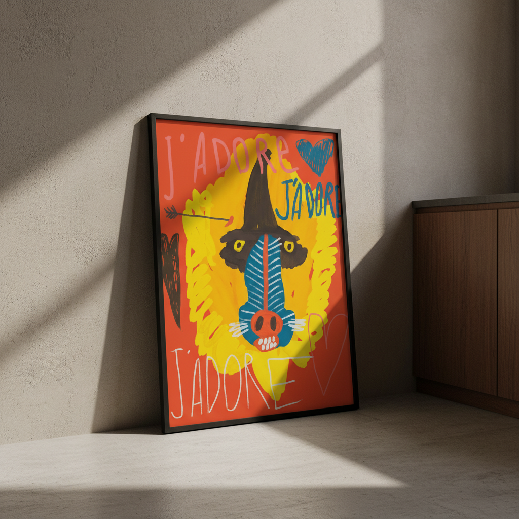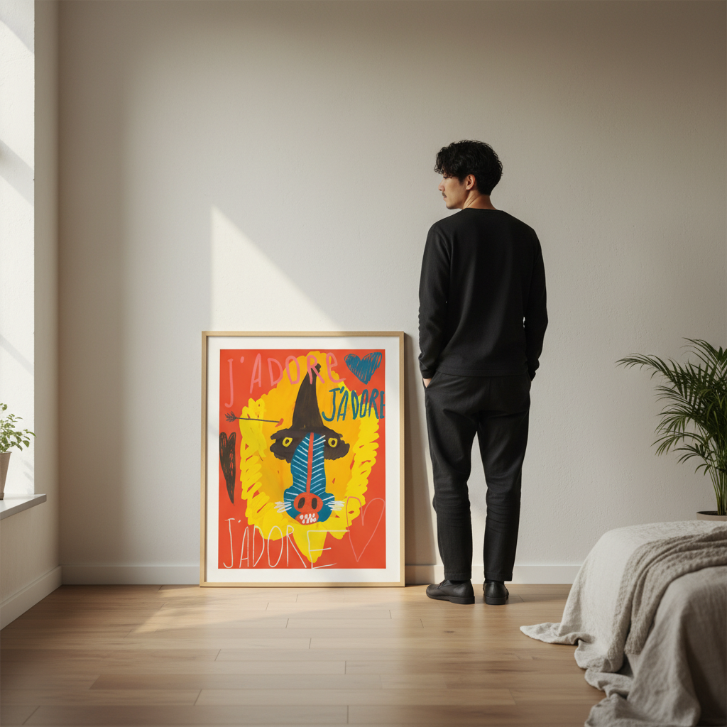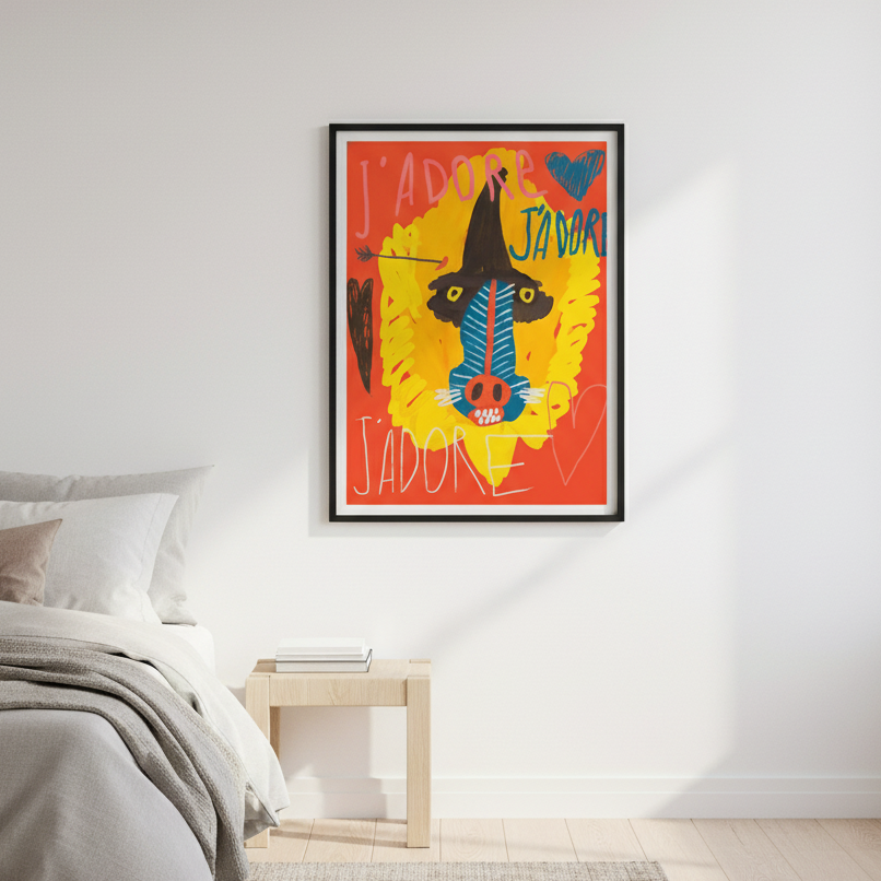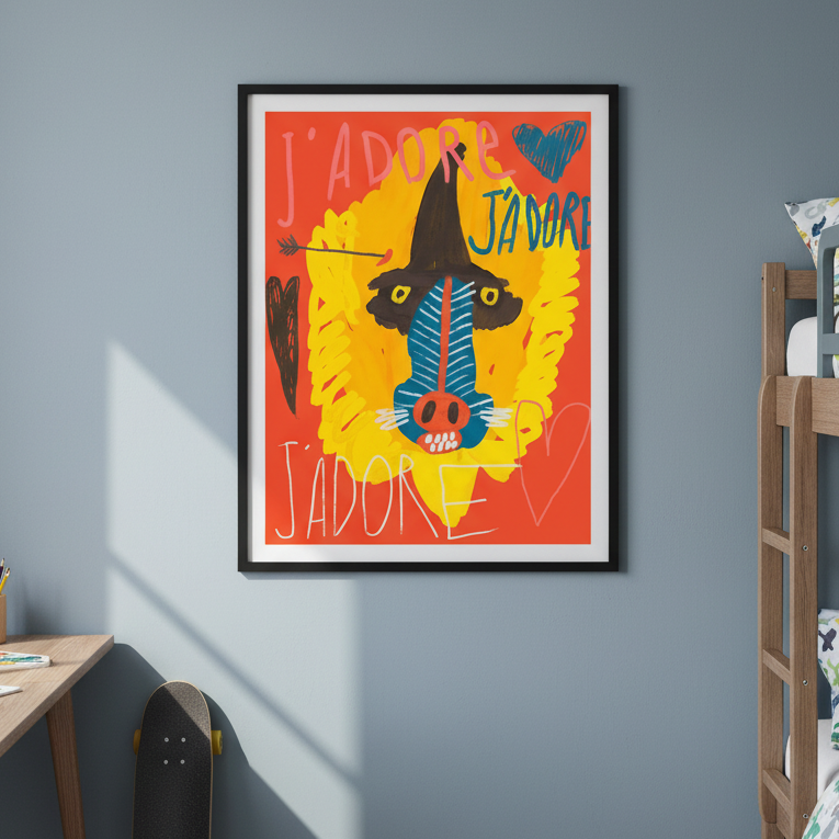 Celebrate French elegance with this striking wall art featuring a whimsical cat-like creature rendered in vibrant hues against a bold red backdrop. The iconic "J'Adore" text adds a touch of Parisian sophistication to any space. Artist Nastasiia Samokhina's distinctive illustration style brings playful charm and contemporary flair, making this piece a conversation starter for modern interiors. Perfect for adding personality and colour to bedrooms, living areas, or creative spaces.
