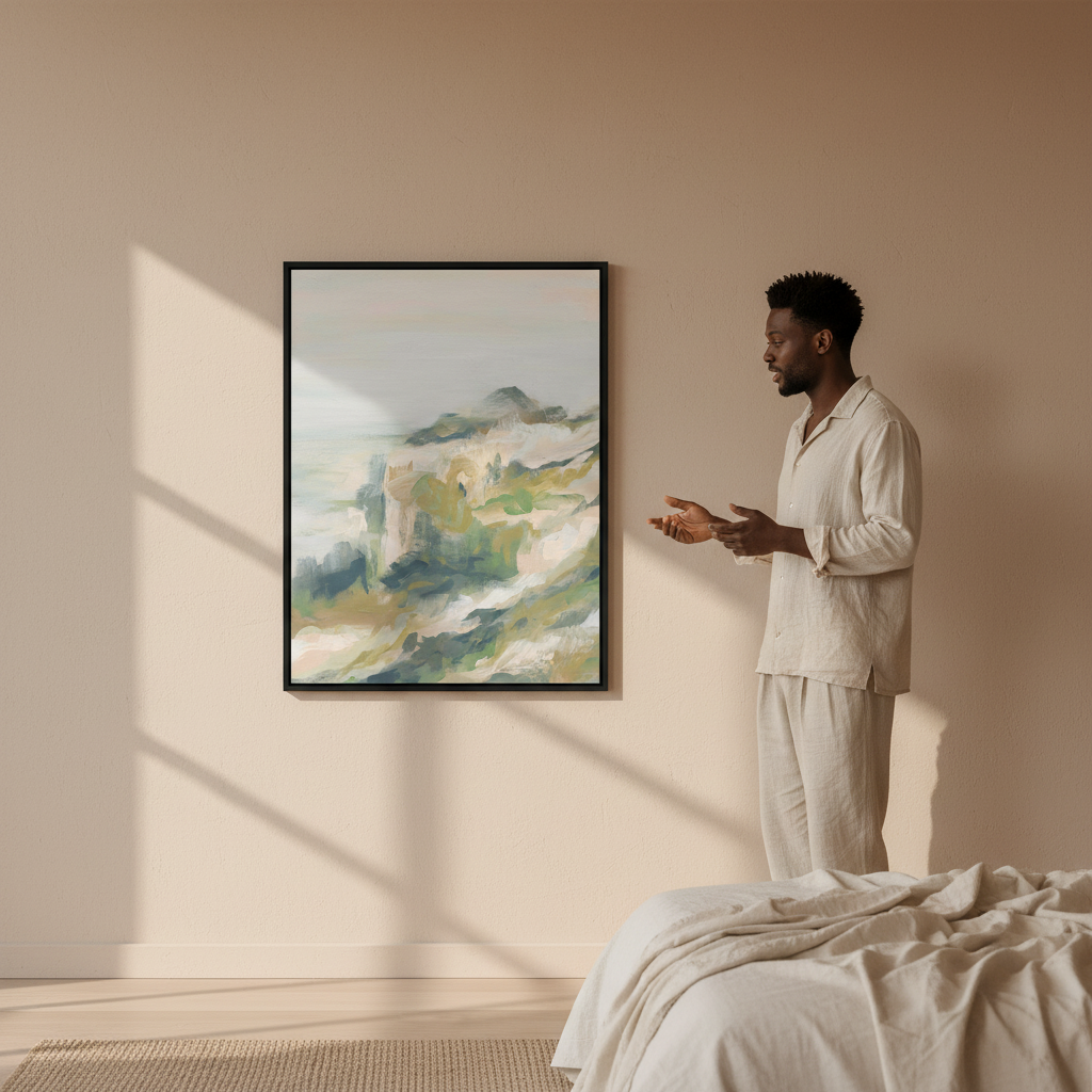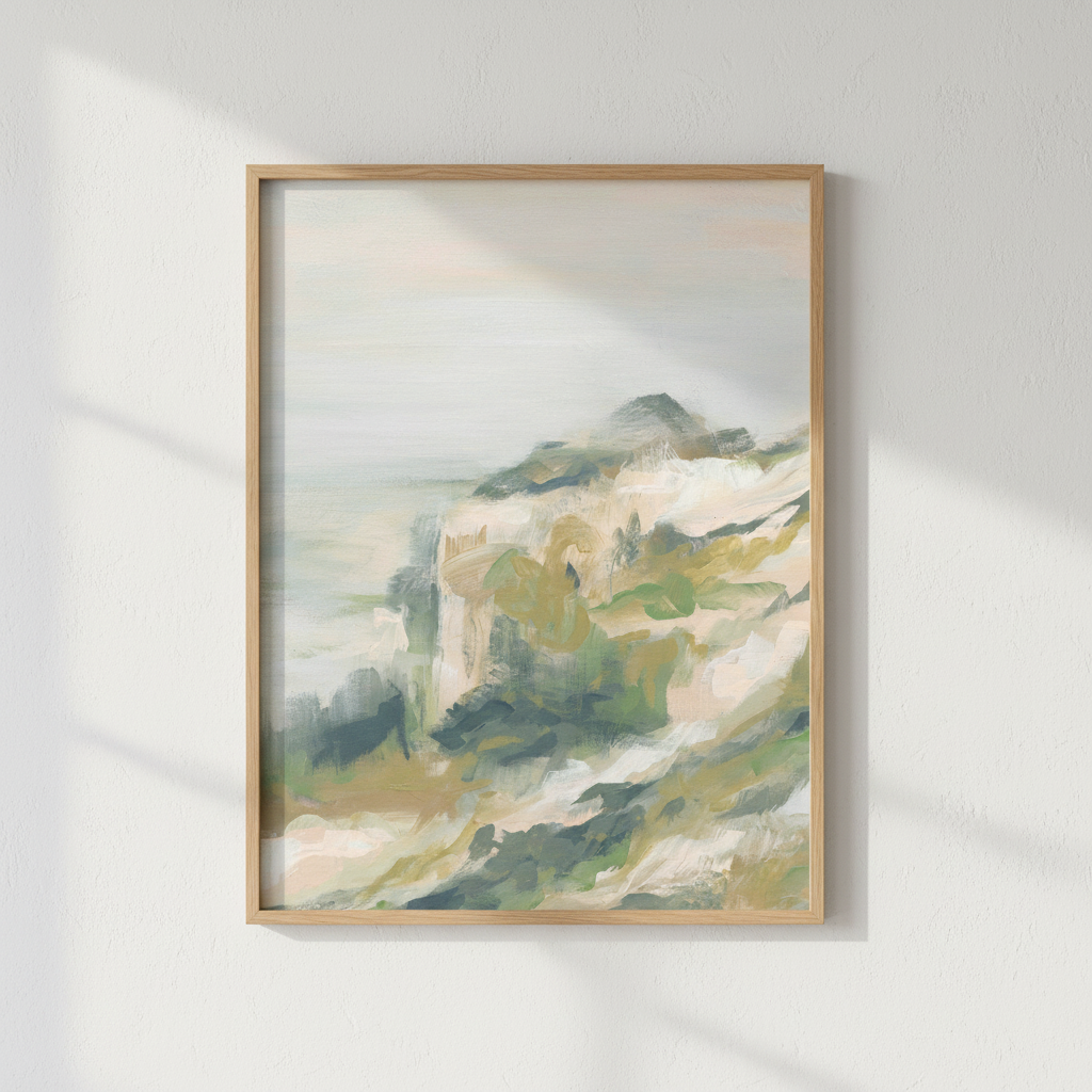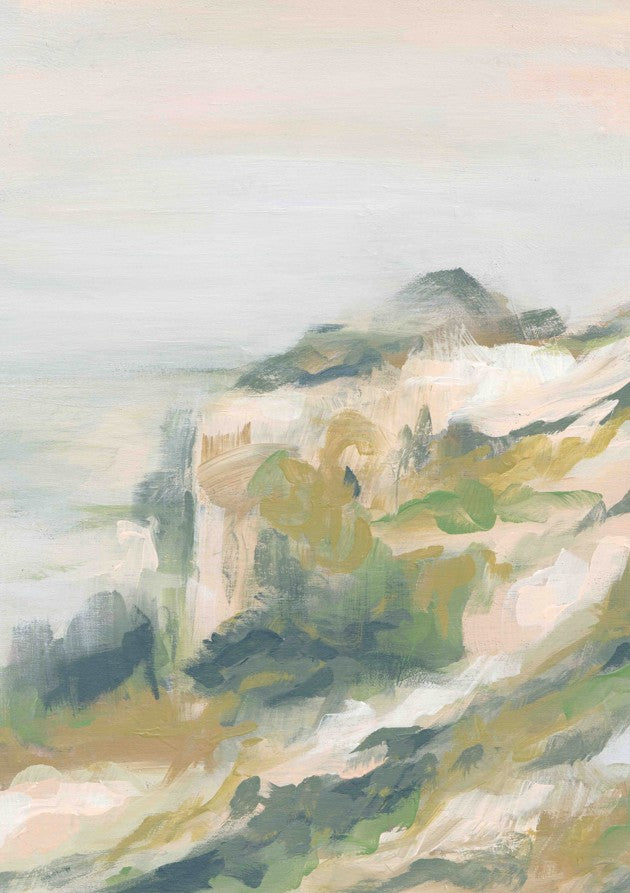 Muted Shoreline captures the serene essence of coastal landscapes through delicate watercolor technique. Soft, layered washes of muted blues, greys, and warm earth tones create atmospheric depth, inviting contemplation of the meeting point between land and sea. Meredith O'Neal's restrained palette and fluid brushwork convey tranquility without sacrificing visual interest. This abstract interpretation emphasizes mood and light over literal detail, making it an ideal choice for spaces seeking understated sophistication and calming visual presence.