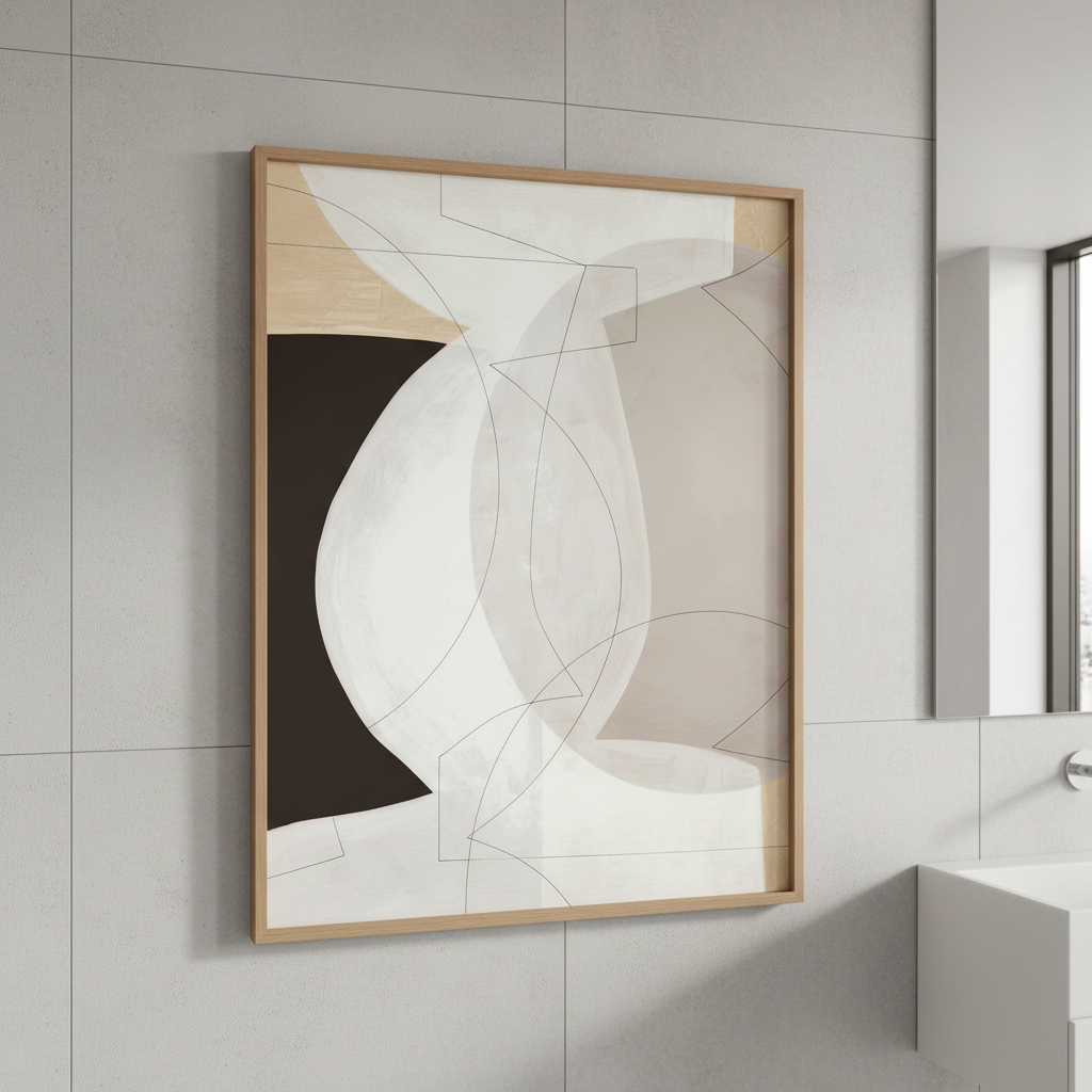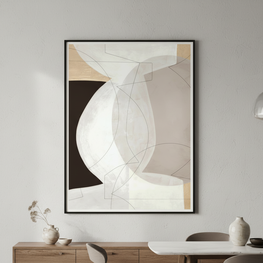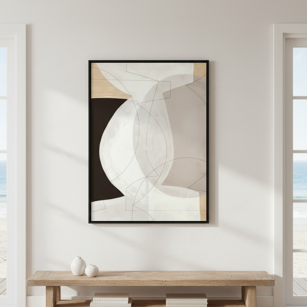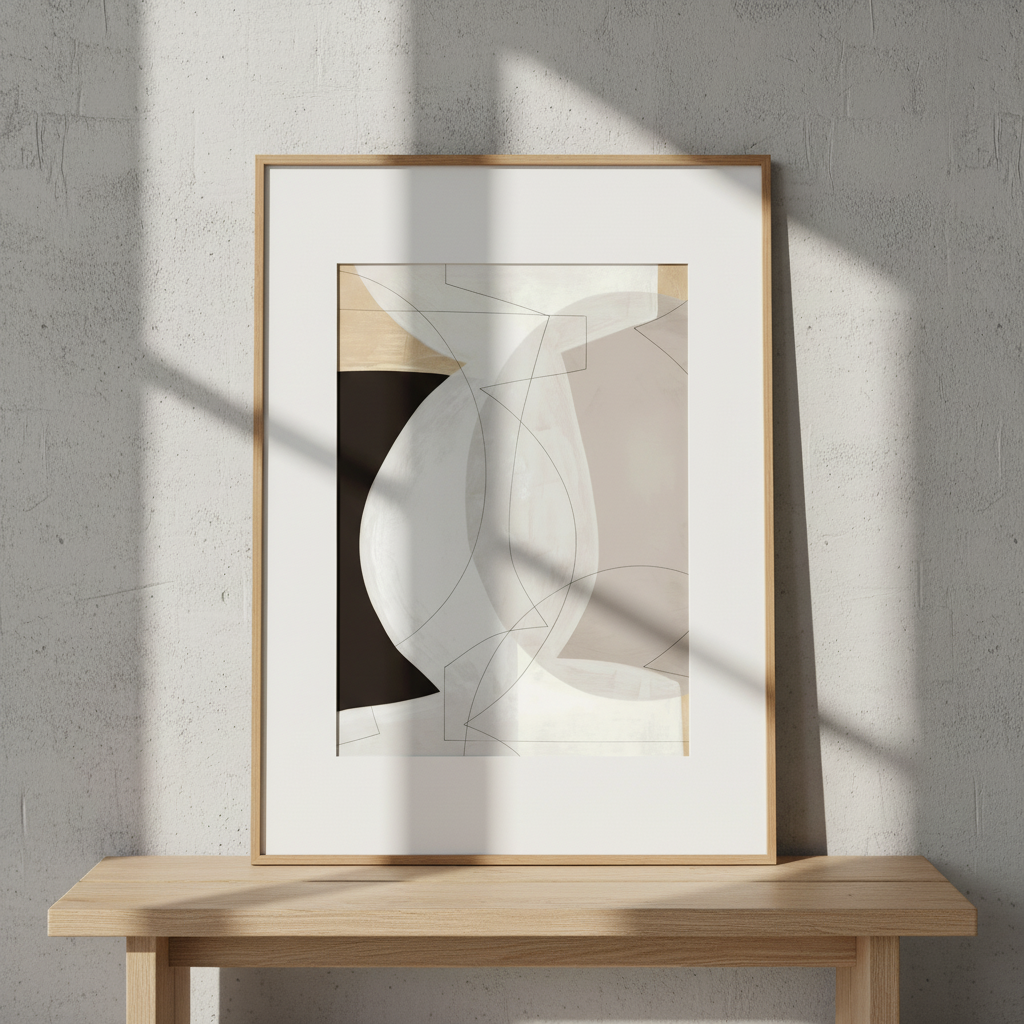 Sculpture by Berit Mongensen Lopez presents a sophisticated exploration of form through abstract geometric composition. This striking artwork features carefully balanced shapes rendered in a refined palette of neutral tones, set against a luminous light background that enhances the interplay of positive and negative space. The minimalist approach demonstrates masterful restraint, allowing each element to command attention while contributing to a cohesive visual narrative. Ideal for contemporary interiors seeking understated elegance and intellectual depth, this piece invites contemplation and rewards sustained viewing with its nuanced spatial relationships and refined aesthetic sensibility.