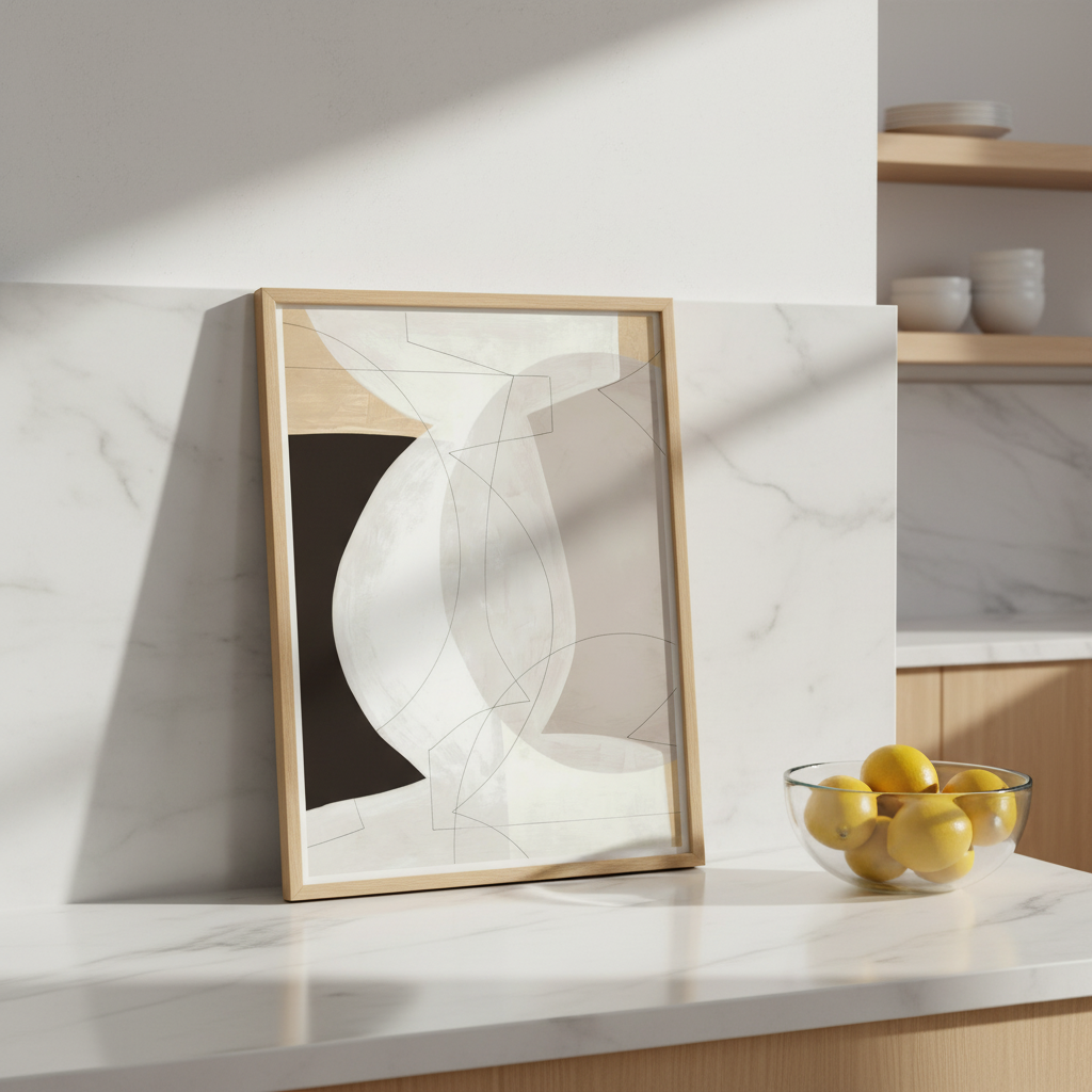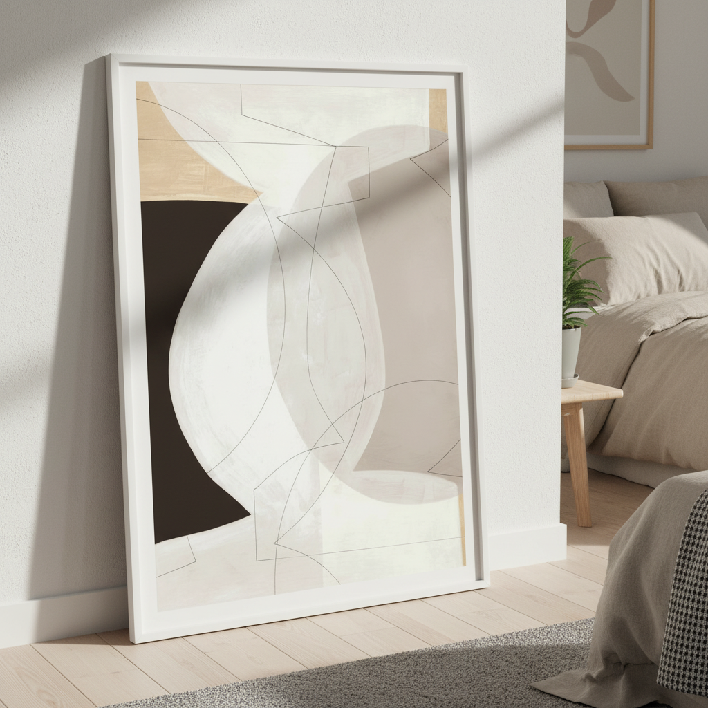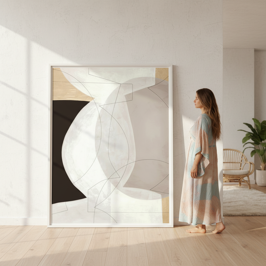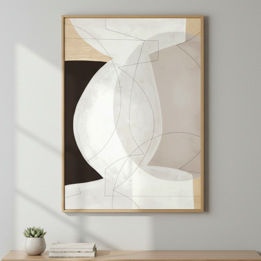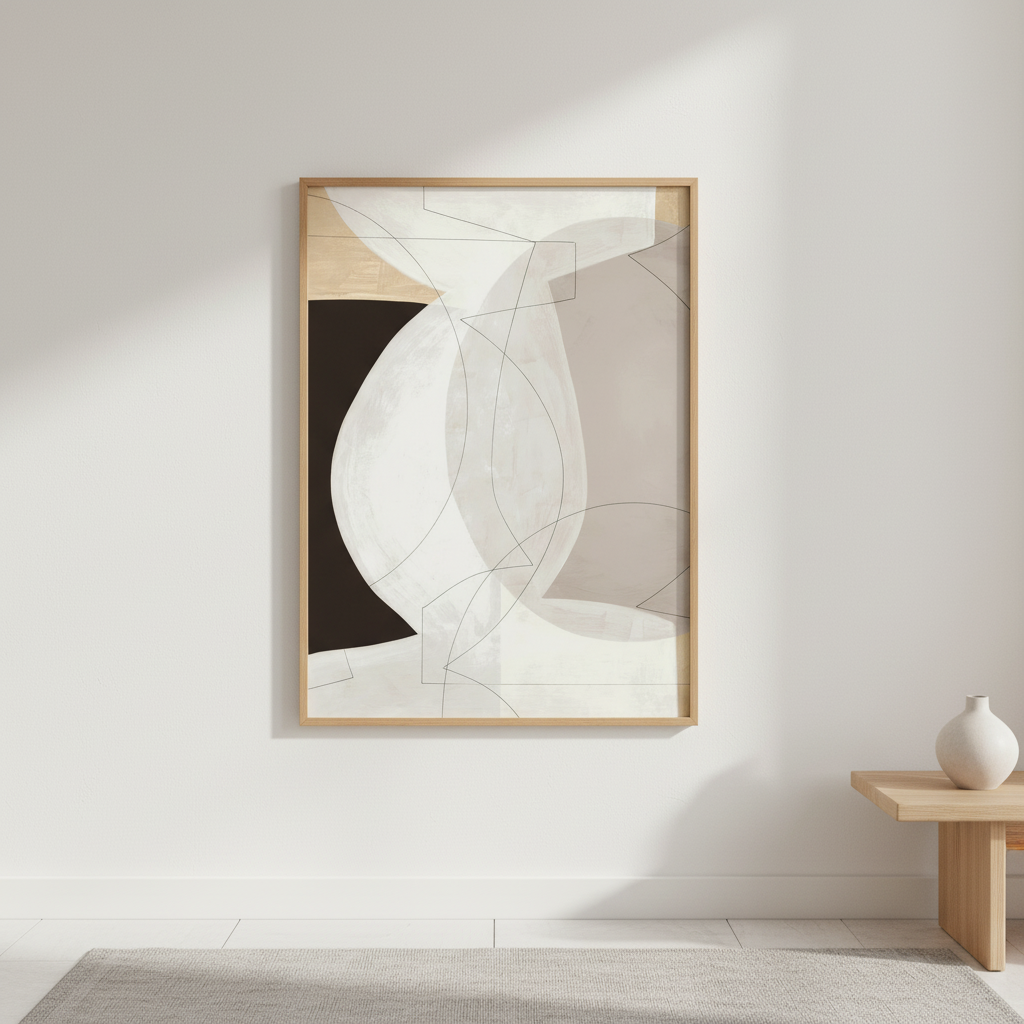 Sculpture by Berit Mongensen Lopez presents a sophisticated exploration of form through abstract geometric composition. This striking artwork features carefully balanced shapes rendered in a refined palette of neutral tones, set against a luminous light background that enhances the interplay of positive and negative space. The minimalist approach demonstrates masterful restraint, allowing each element to command attention while contributing to a cohesive visual narrative. Ideal for contemporary interiors seeking understated elegance and intellectual depth, this piece invites contemplation and rewards sustained viewing with its nuanced spatial relationships and refined aesthetic sensibility.