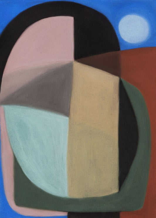 Soft Pastel by Berit Mongensen Lopez presents a sophisticated exploration of form and colour through abstract geometric composition. Rendered against a serene blue backdrop, layered shapes in complementary hues create visual depth and movement, inviting contemplative engagement. This piece exemplifies contemporary abstract practice, where geometric precision meets intuitive colour relationships to establish a dynamic yet harmonious aesthetic. Ideal for modern interiors seeking artistic sophistication and visual interest.
