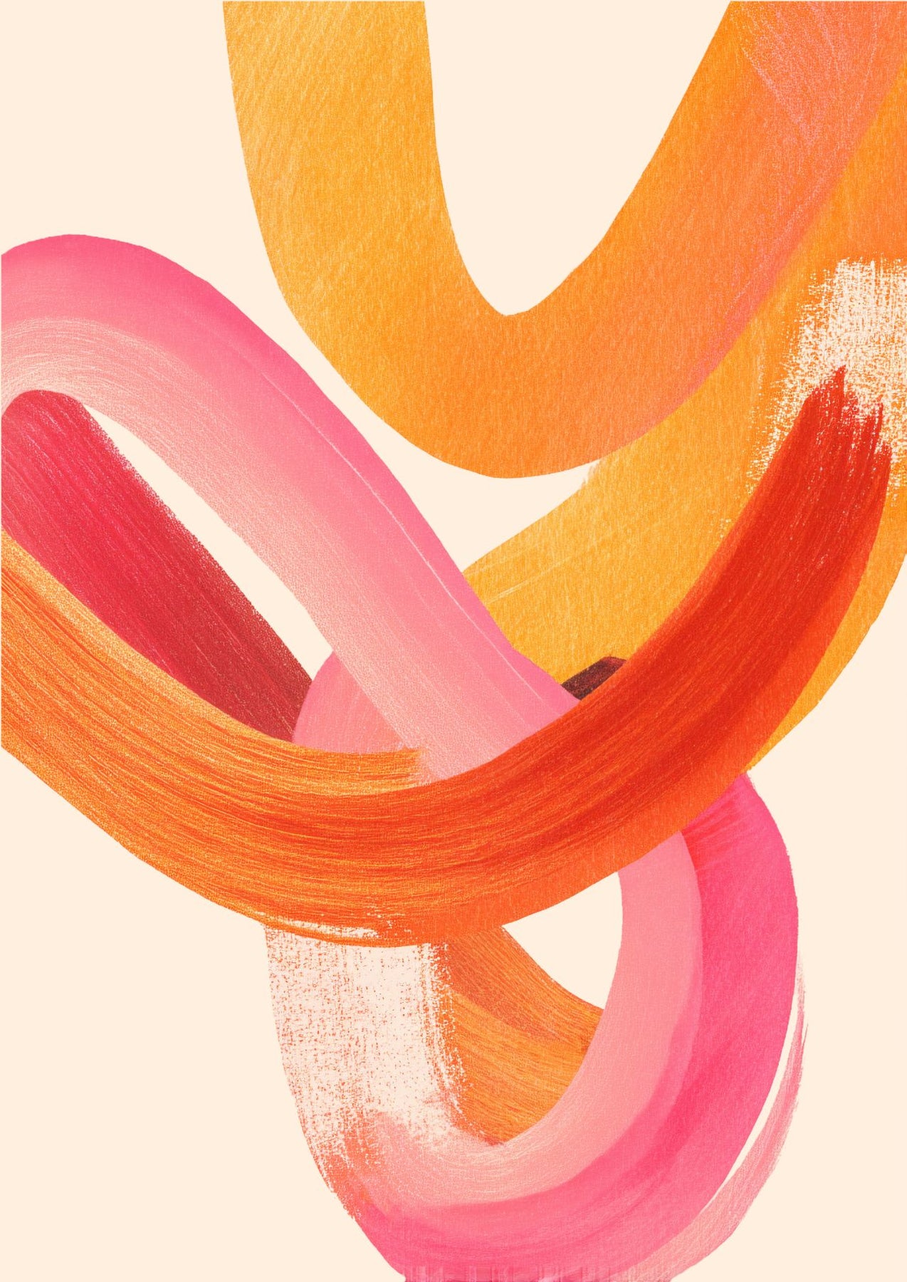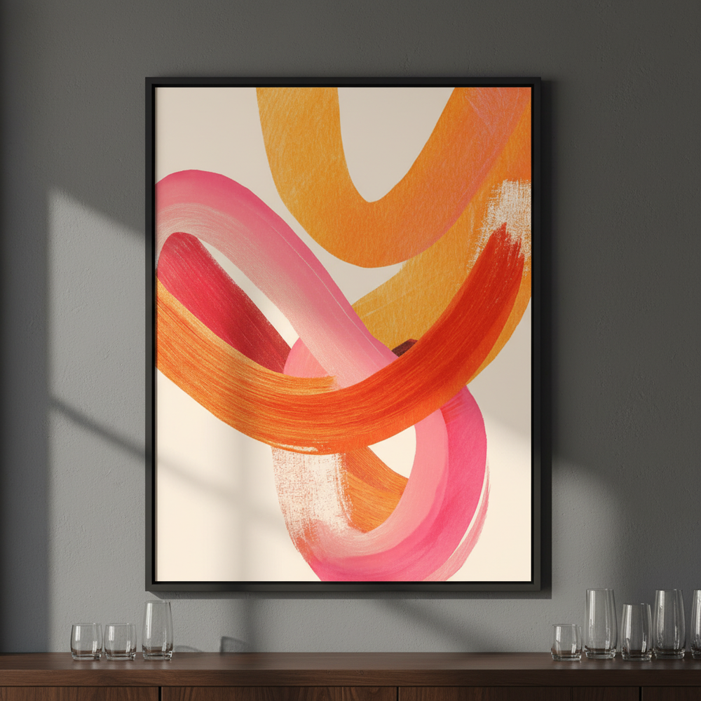 Sunset Intertwined is a warm, expressive abstract artwork featuring flowing brushstrokes in coral, blush pink, and golden orange. The layered curves create a sense of movement and connection, bringing energy and softness together in one modern composition.