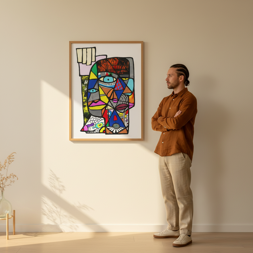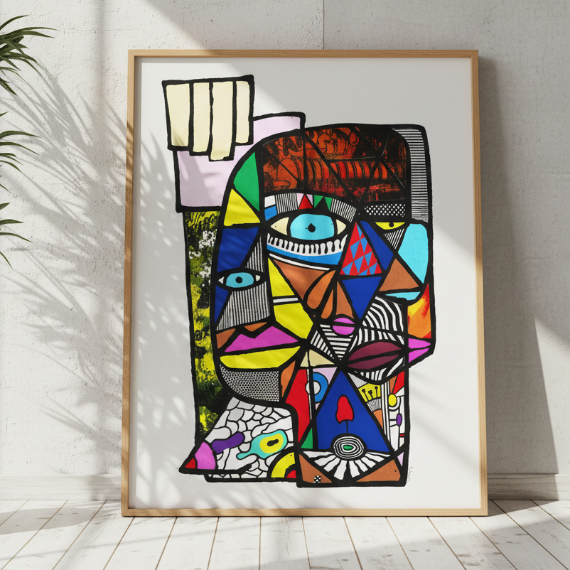 Fight the Power! by Sven Reubens is a striking abstract composition that merges bold geometric forms with dynamic colour interplay. This contemporary piece features interlocking shapes and rhythmic patterns that create visual movement across the canvas, inviting viewers to discover new perspectives with each glance. The vibrant palette and deliberate arrangement of elements convey a sense of energy and rebellion, making it an ideal statement piece for modern interiors seeking artistic depth and conversation-starting appeal.