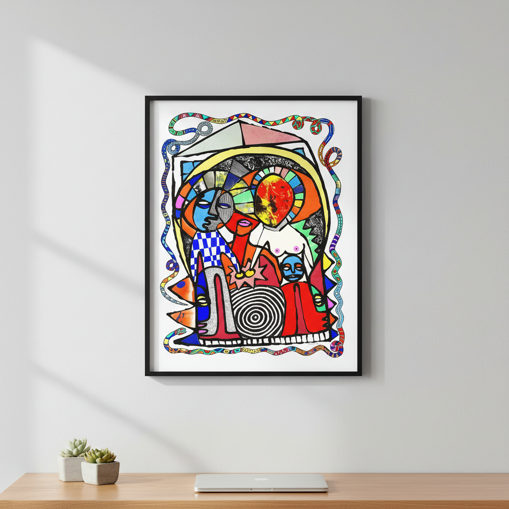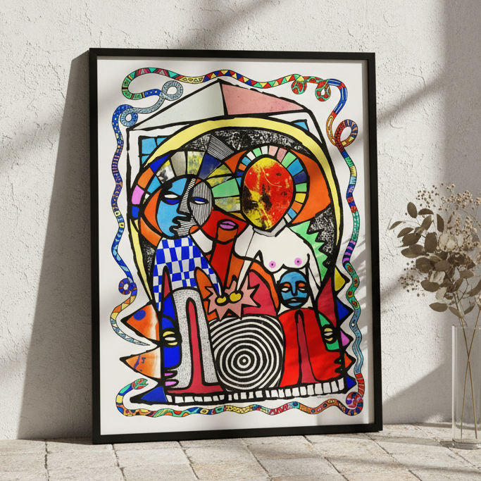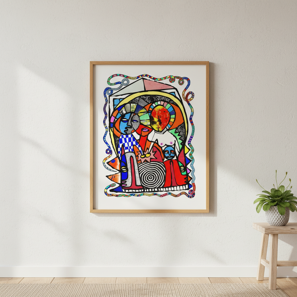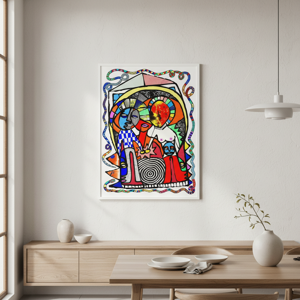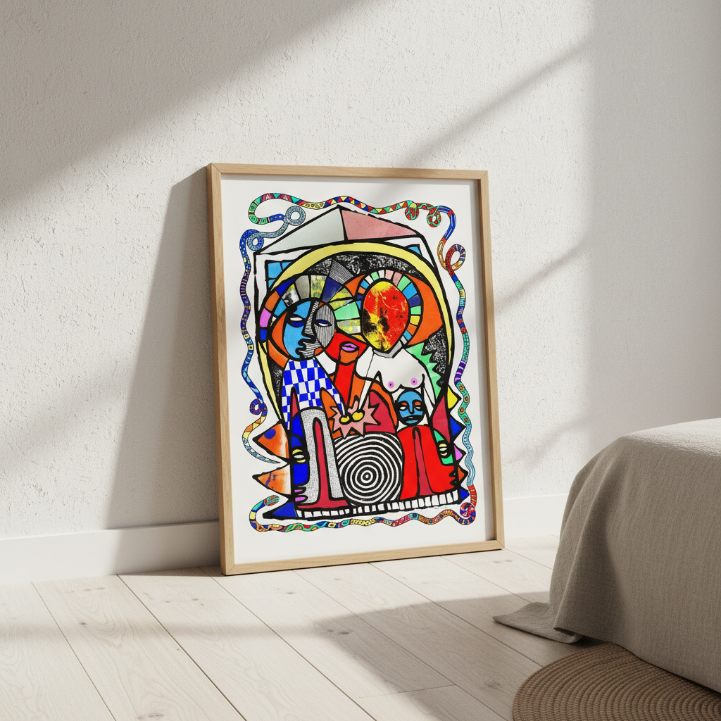 Home by Sven Reubens is a striking abstract composition that merges vibrant colour with dynamic geometric forms. This contemporary artwork features interlocking shapes and layered patterns that create visual depth and movement across the canvas. The bold palette and precise geometric construction make it an ideal statement piece for modern interiors, adding sophistication and artistic character to any space. Perfect for those seeking to elevate their walls with curated, gallery-quality design.