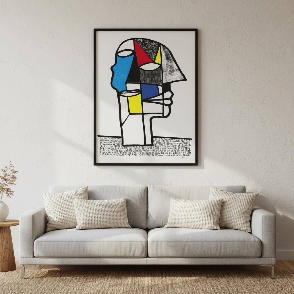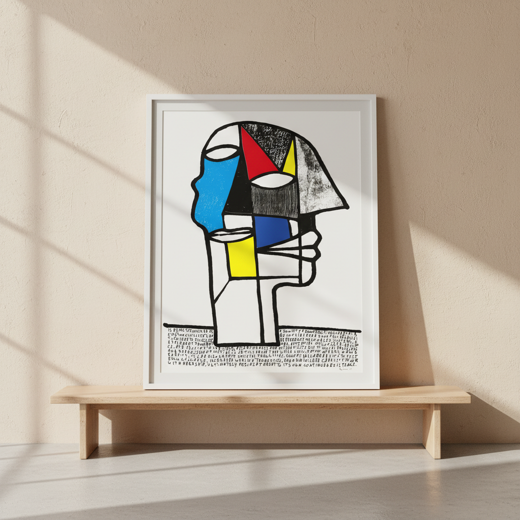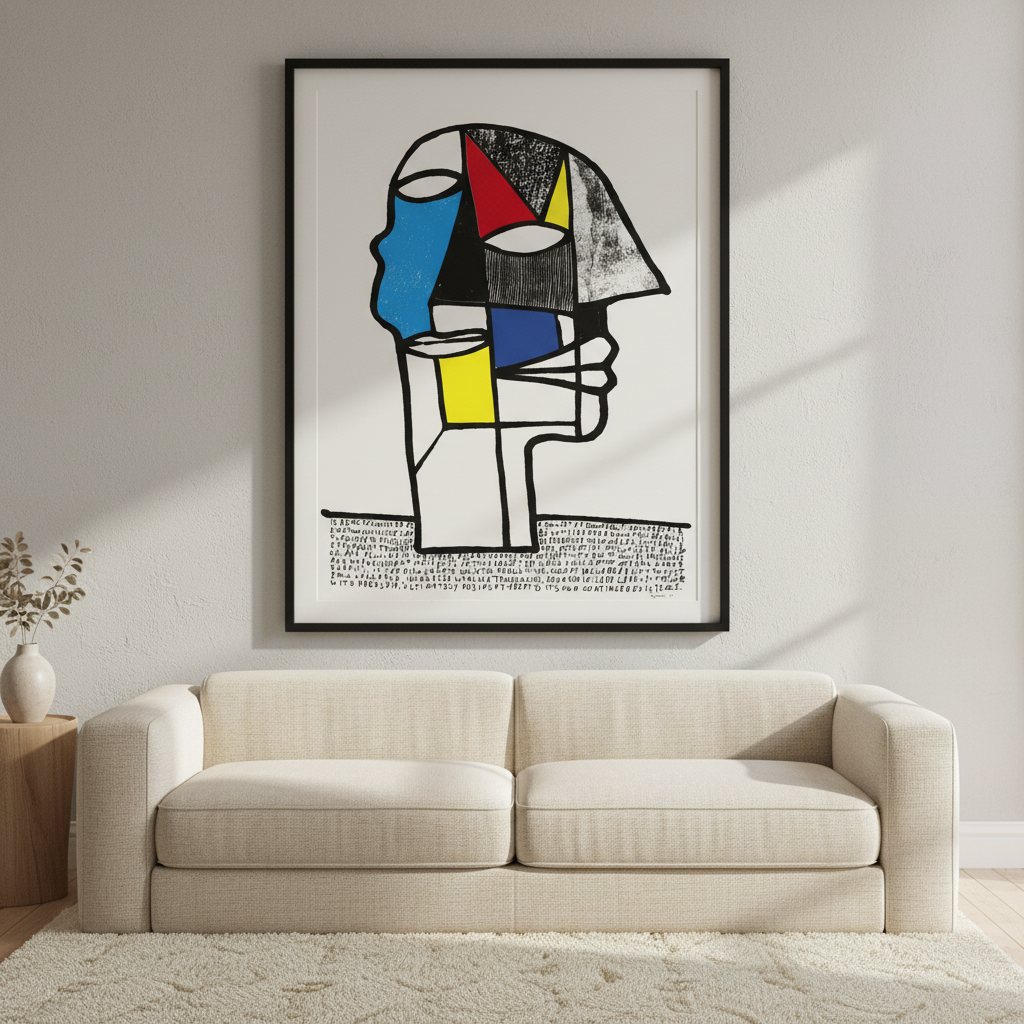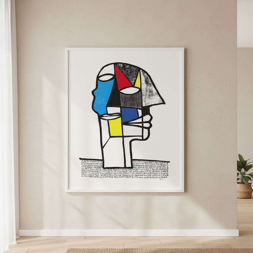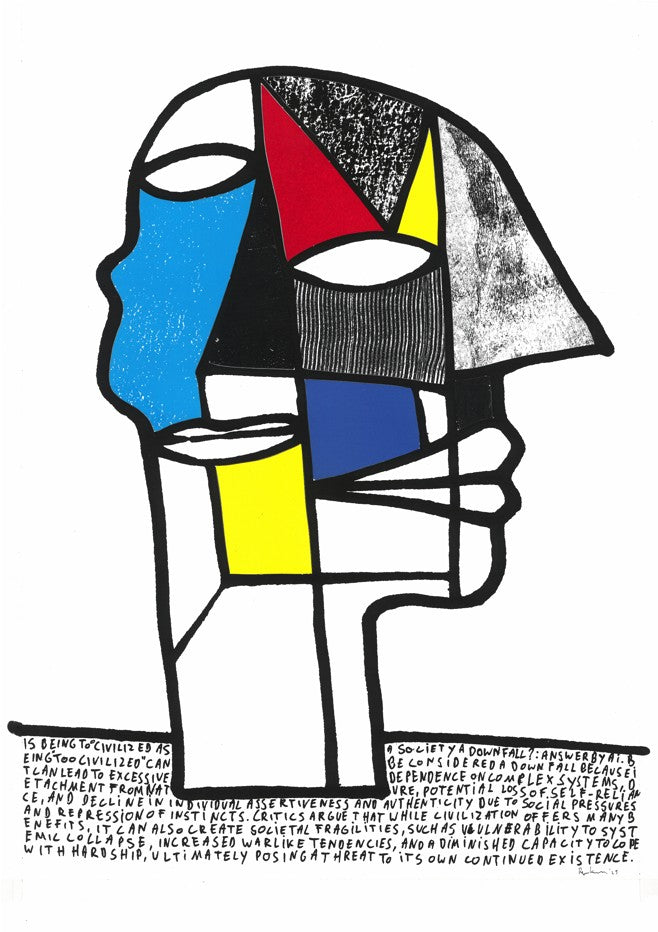 Is Being Too Civilized as a Society a Downfall? by Sven Reubens presents a thought-provoking abstract composition that merges geometric forms with philosophical inquiry. This striking artwork features bold geometric shapes arranged across a clean white background, complemented by carefully integrated text that invites contemplation. The interplay between visual abstraction and linguistic elements creates a dynamic dialogue, encouraging viewers to engage with both the aesthetic and conceptual dimensions of the piece. Ideal for contemporary spaces seeking to stimulate intellectual conversation and add visual sophistication to your walls.