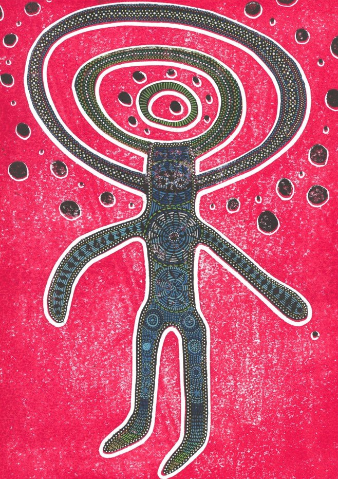 Petroglyph by Sven Reubens presents a striking abstract composition featuring a stylised human figure rendered through concentric circular forms against a soft pink backdrop. This contemporary artwork merges geometric precision with organic movement, creating visual depth through layered rings that draw the eye inward. The minimalist approach and restrained colour palette make it an ideal statement piece for modern interiors, offering sophisticated visual interest without overwhelming a space. Perfect for galleries, living areas, or creative studios seeking thoughtful, conversation-starting wall art.