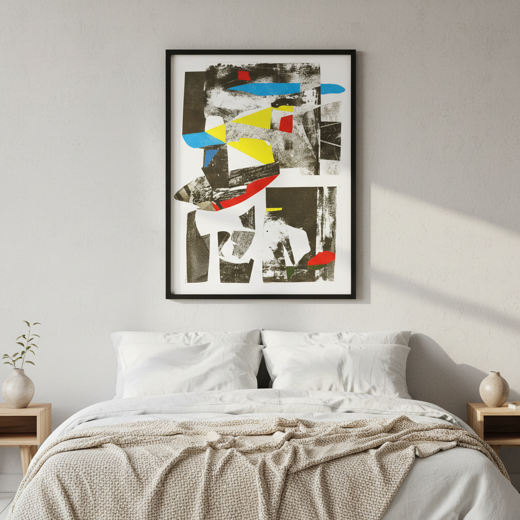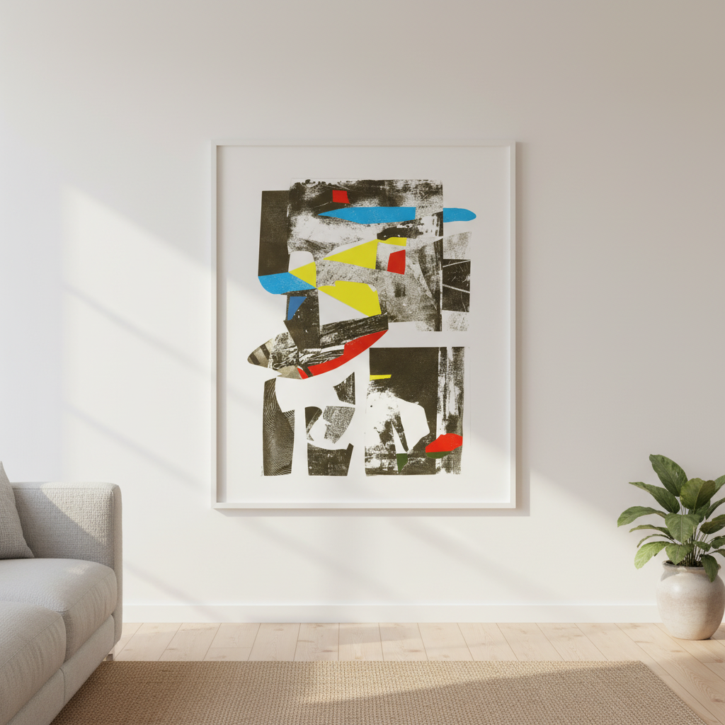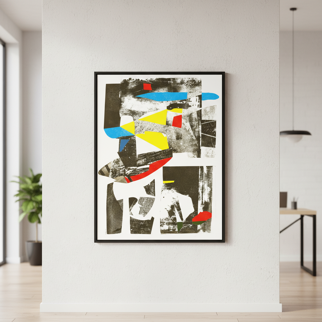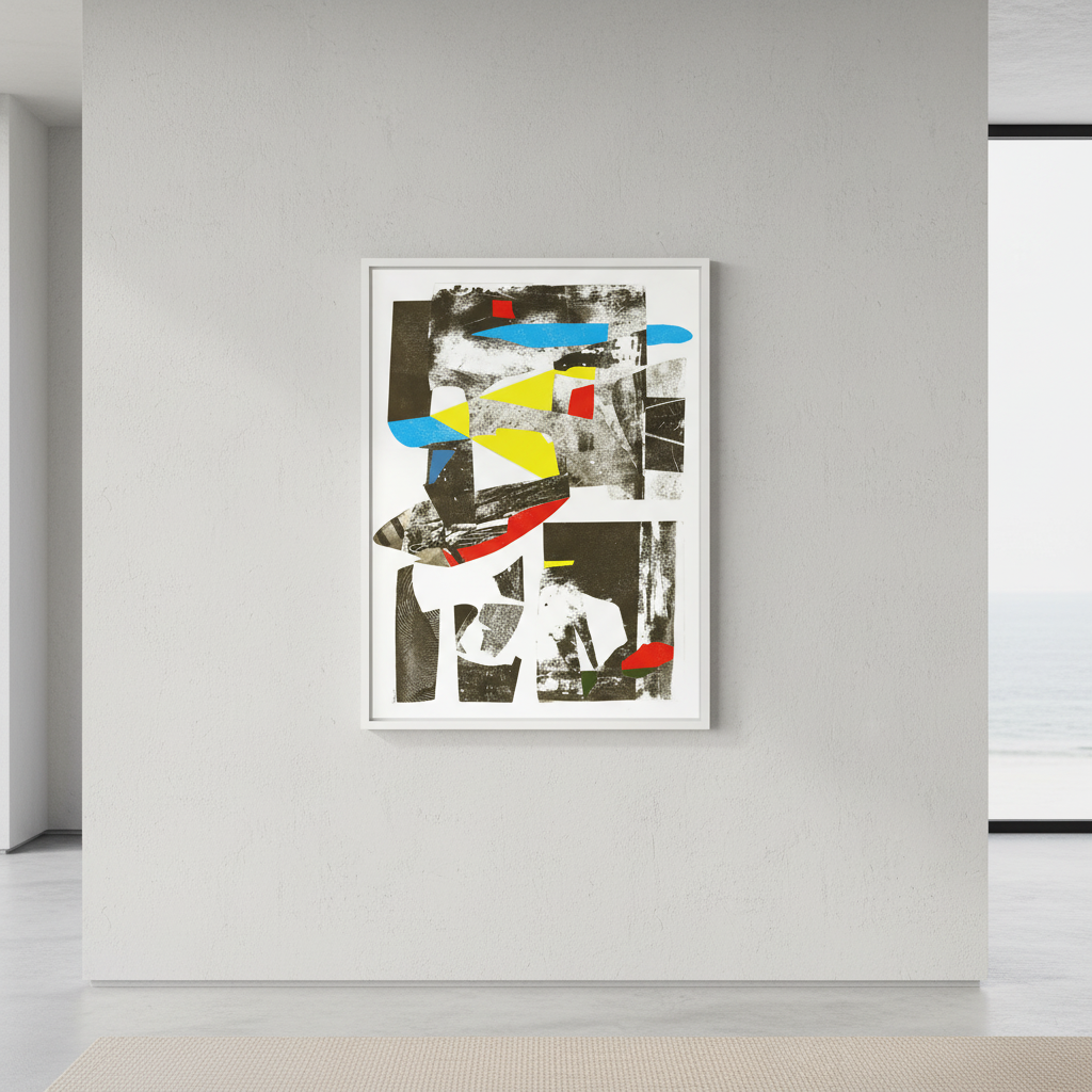 This striking abstract composition showcases bold geometric forms rendered in a carefully curated palette of black, white, red, yellow, and blue. The interplay of angular shapes creates dynamic visual tension across the pristine white ground, inviting multiple interpretations. Characteristic of modernist abstraction, the work demonstrates sophisticated colour theory and compositional balance. An excellent choice for contemporary interiors seeking an intellectually engaging focal point that complements both minimalist and eclectic design schemes.