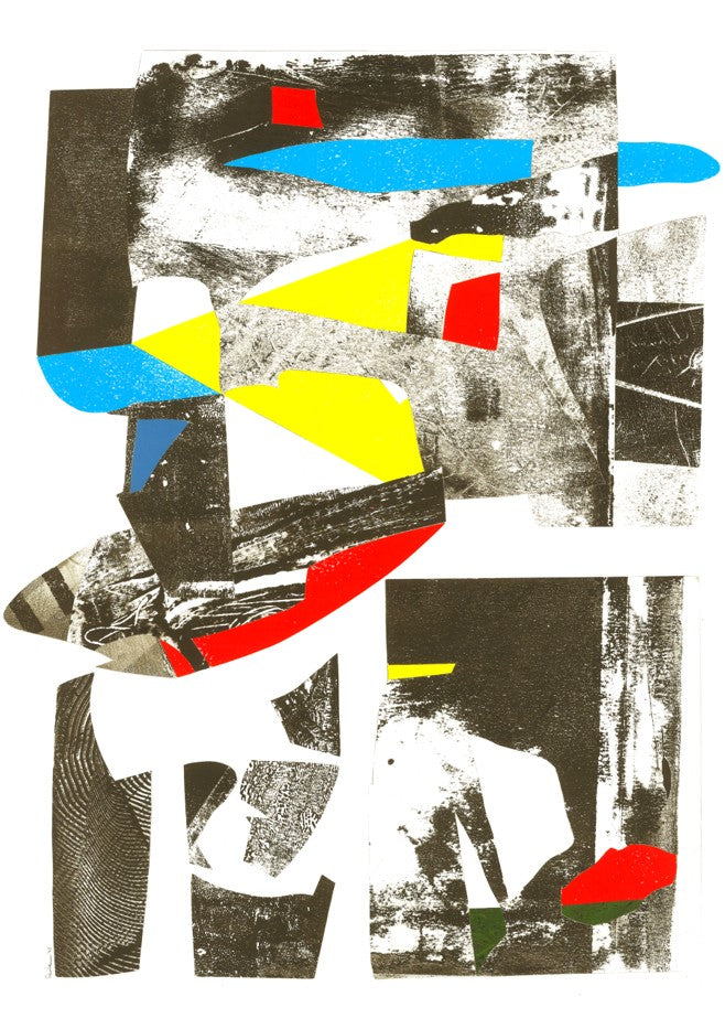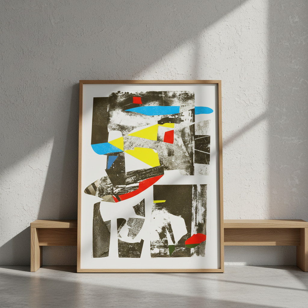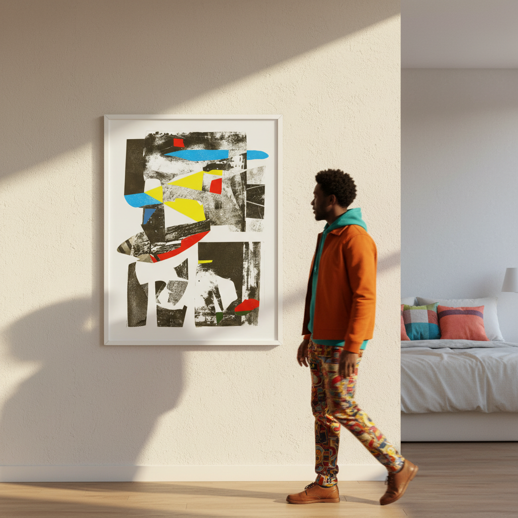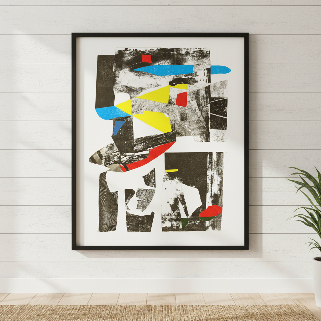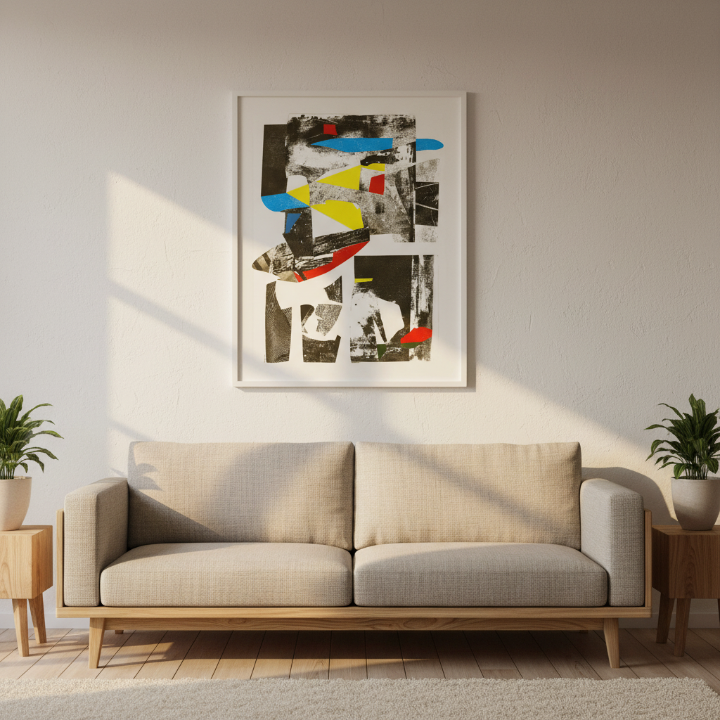 This striking abstract composition showcases bold geometric forms rendered in a carefully curated palette of black, white, red, yellow, and blue. The interplay of angular shapes creates dynamic visual tension across the pristine white ground, inviting multiple interpretations. Characteristic of modernist abstraction, the work demonstrates sophisticated colour theory and compositional balance. An excellent choice for contemporary interiors seeking an intellectually engaging focal point that complements both minimalist and eclectic design schemes.