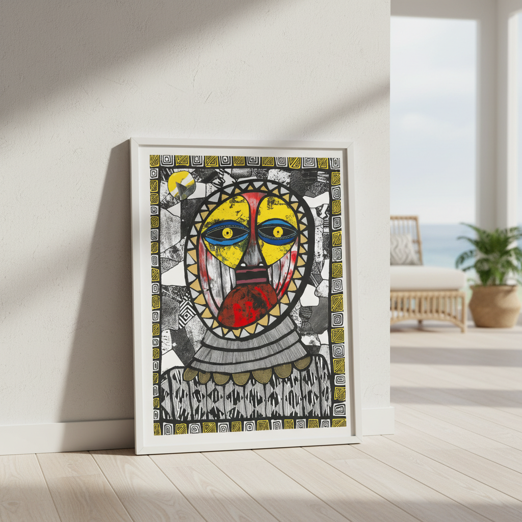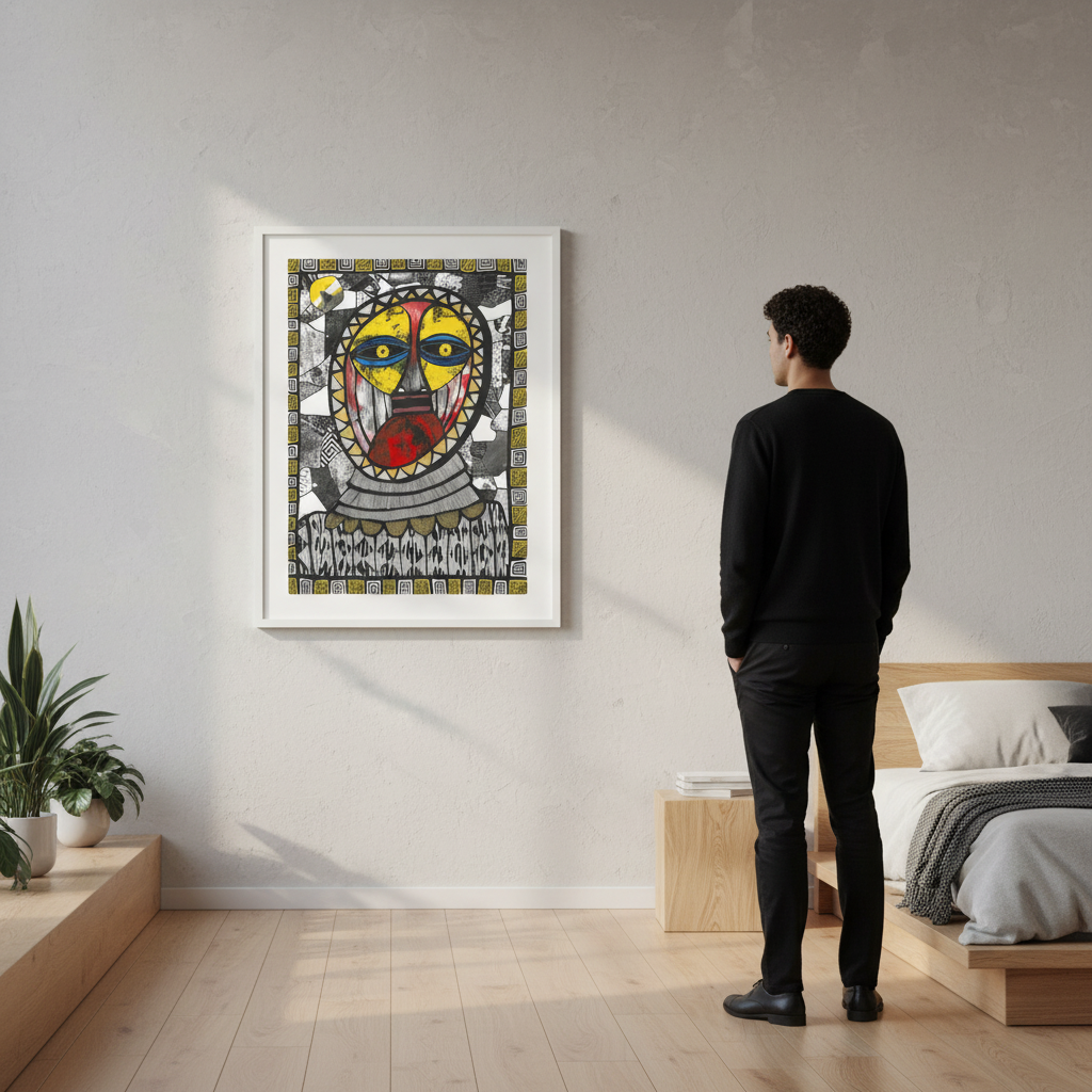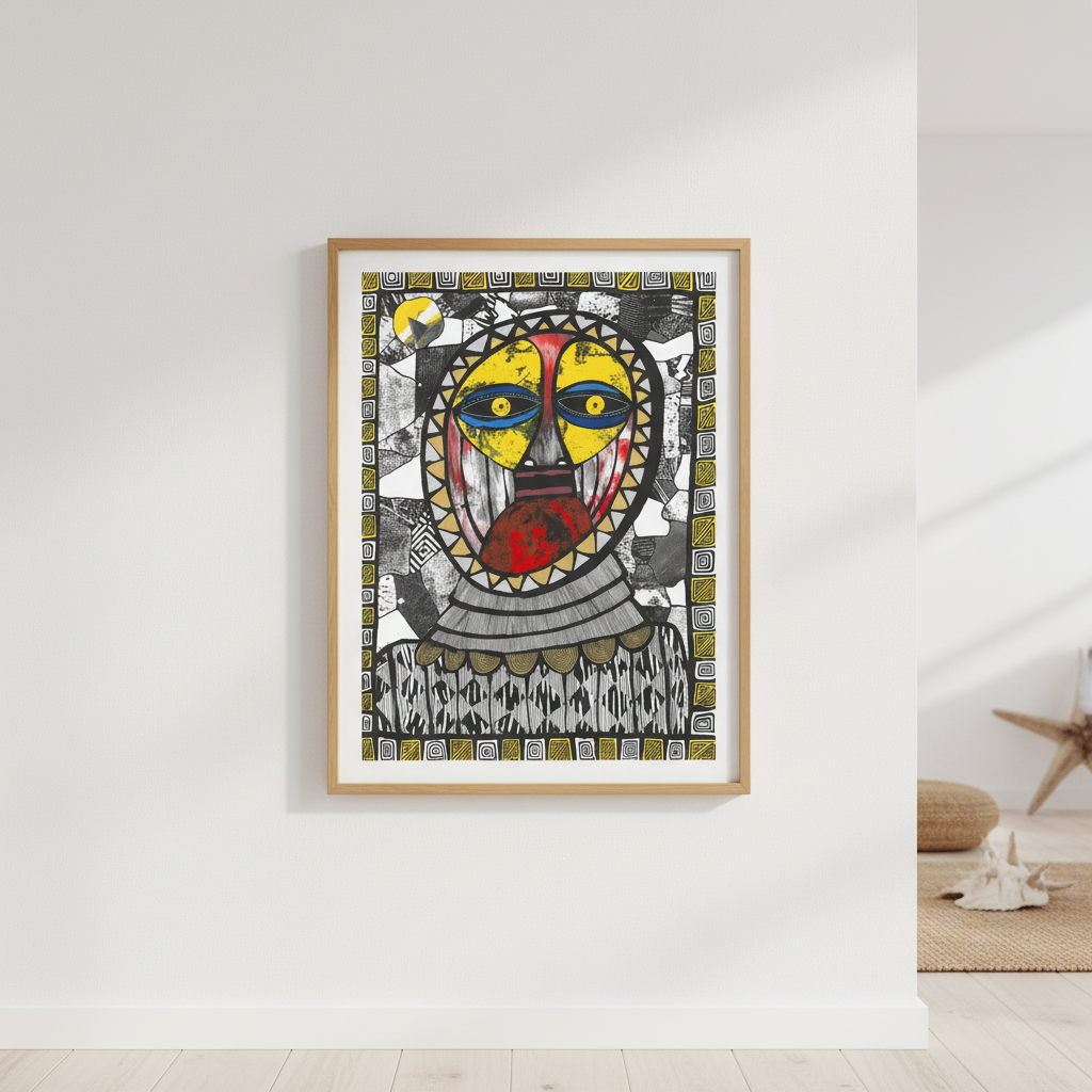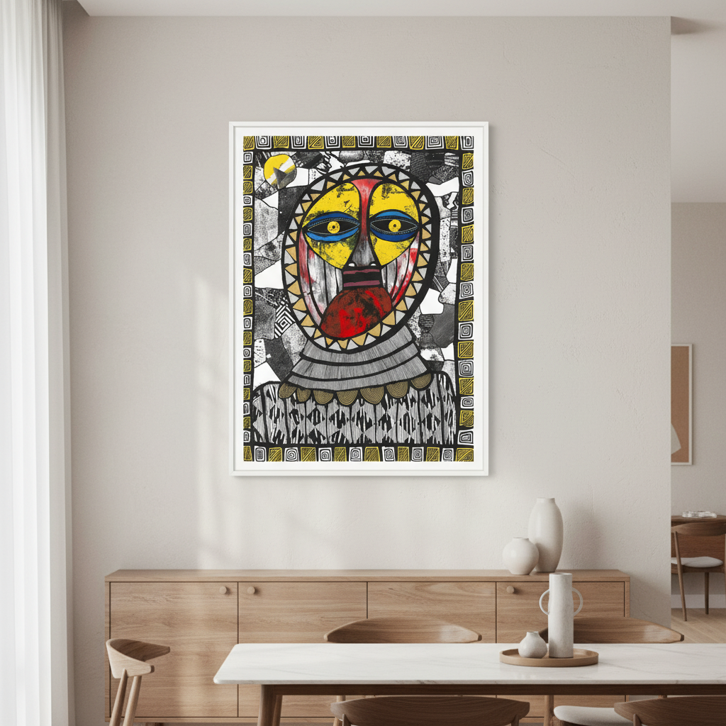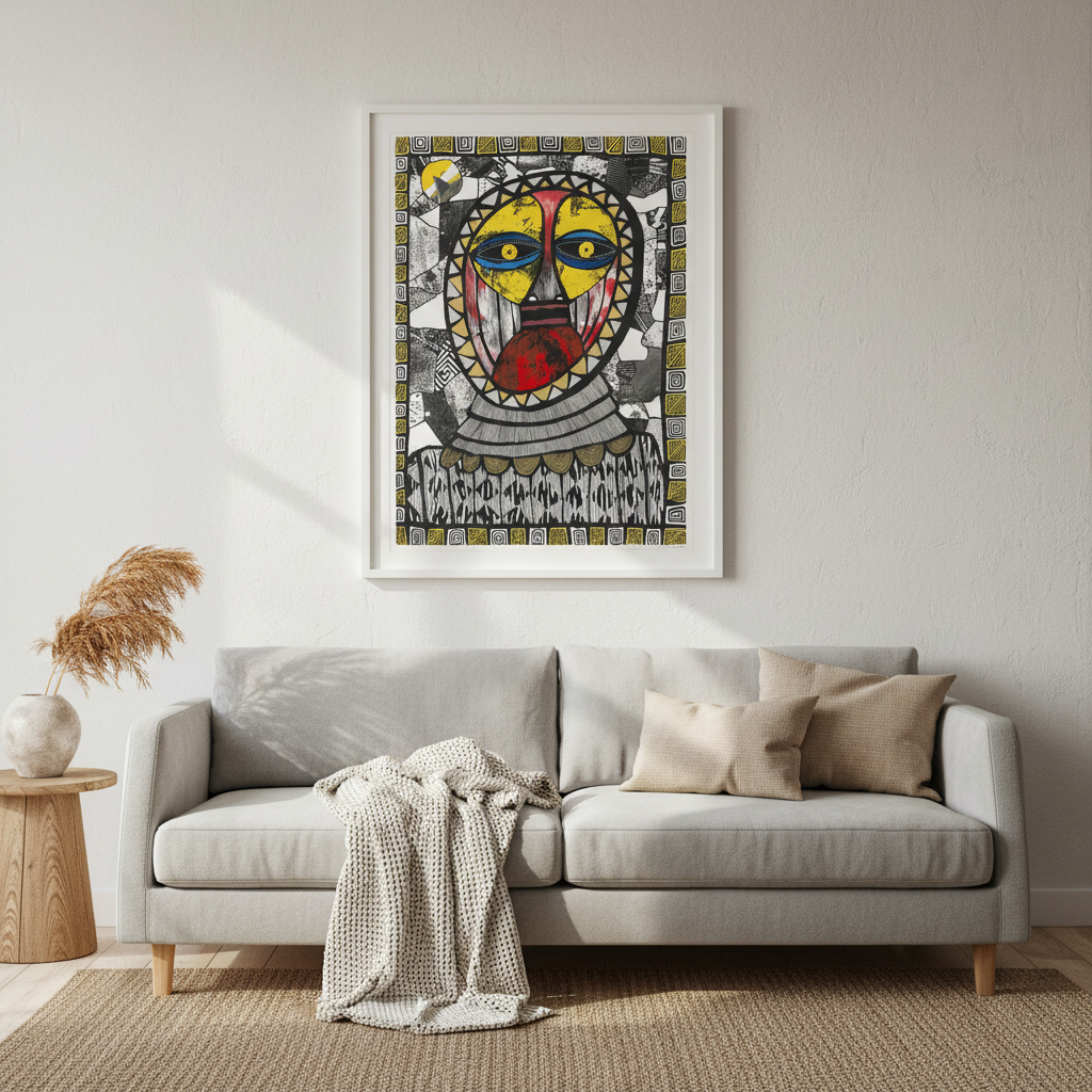 Sun Mask by Sven Reubens presents a striking abstract composition that merges modernist aesthetics with expressive portraiture. The work features a stylized face rendered in vibrant yellows, reds, and blues, set against a carefully balanced black and white ground. This interplay of chromatic intensity and neutral tones creates visual tension that draws the viewer's eye across the canvas. The geometric abstraction of facial features demonstrates sophisticated compositional control, making this piece an excellent focal point for contemporary interiors. Ideal for collectors seeking artwork that bridges figuration and abstraction with confident colour application.