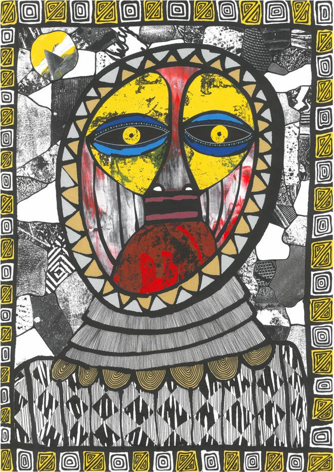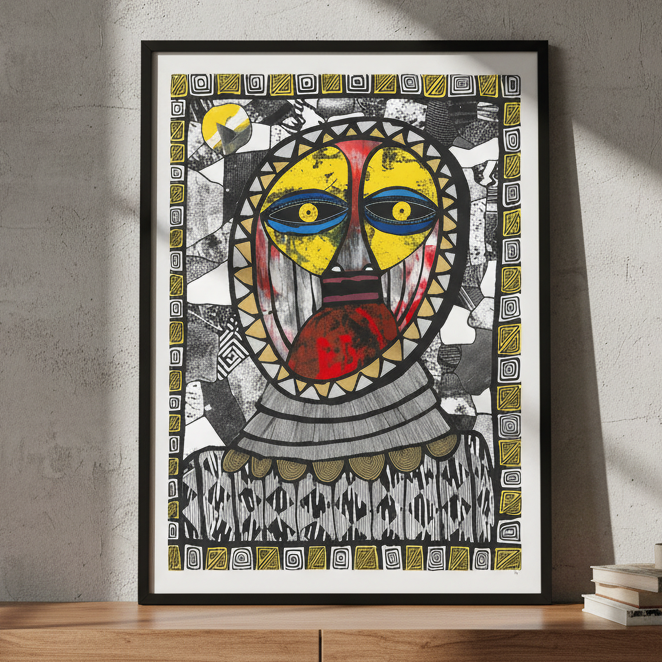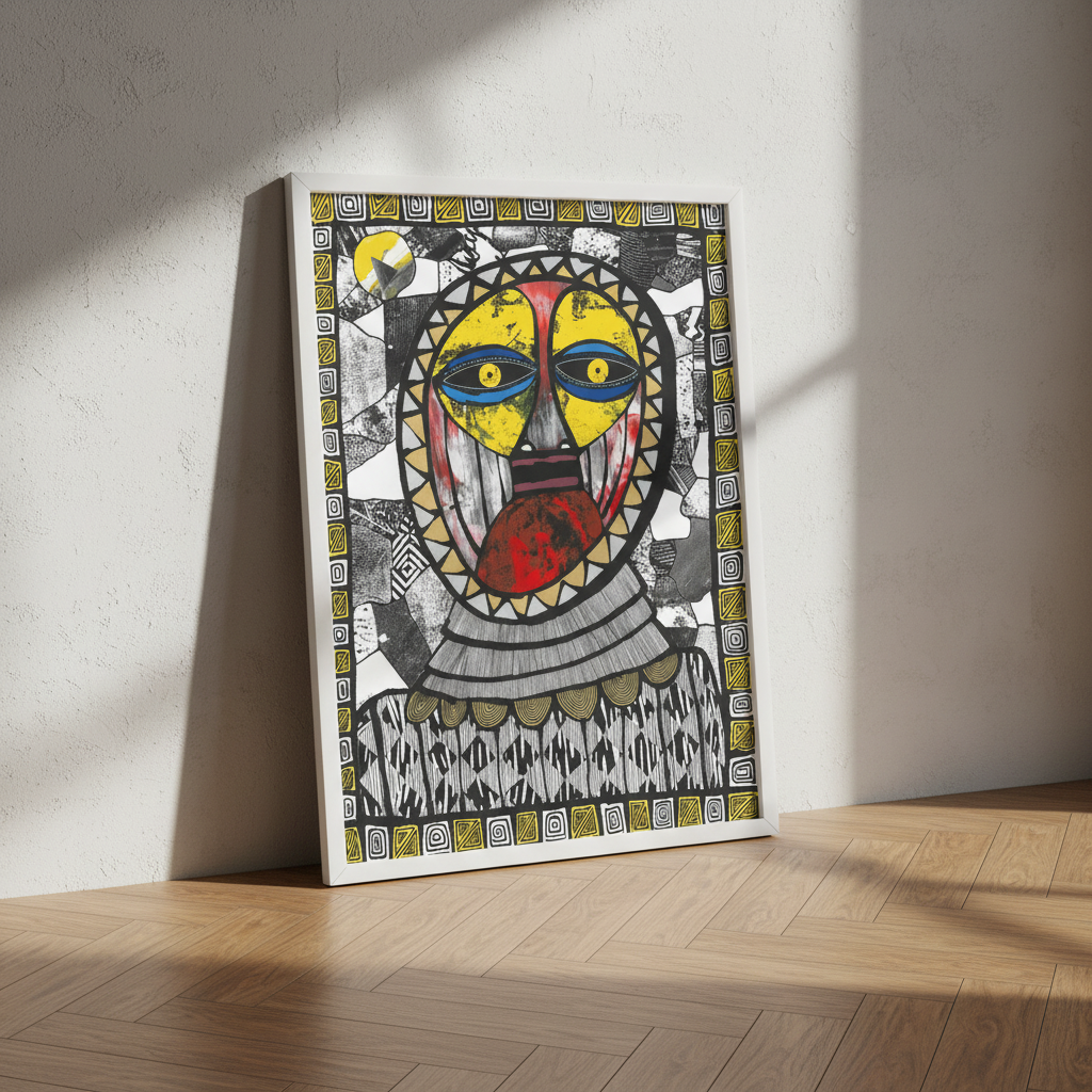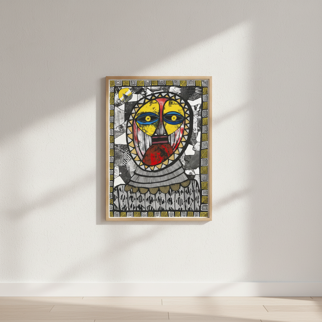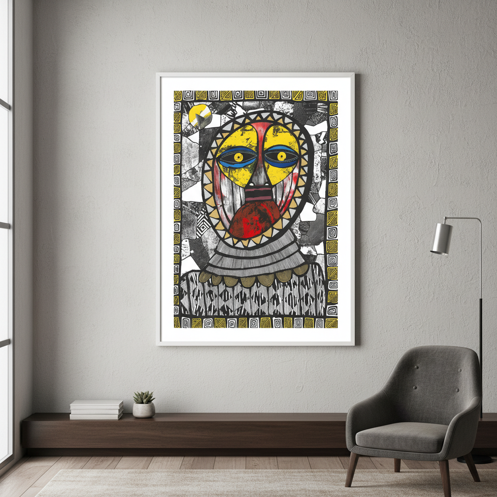 Sun Mask by Sven Reubens presents a striking abstract composition that merges modernist aesthetics with expressive portraiture. The work features a stylized face rendered in vibrant yellows, reds, and blues, set against a carefully balanced black and white ground. This interplay of chromatic intensity and neutral tones creates visual tension that draws the viewer's eye across the canvas. The geometric abstraction of facial features demonstrates sophisticated compositional control, making this piece an excellent focal point for contemporary interiors. Ideal for collectors seeking artwork that bridges figuration and abstraction with confident colour application.