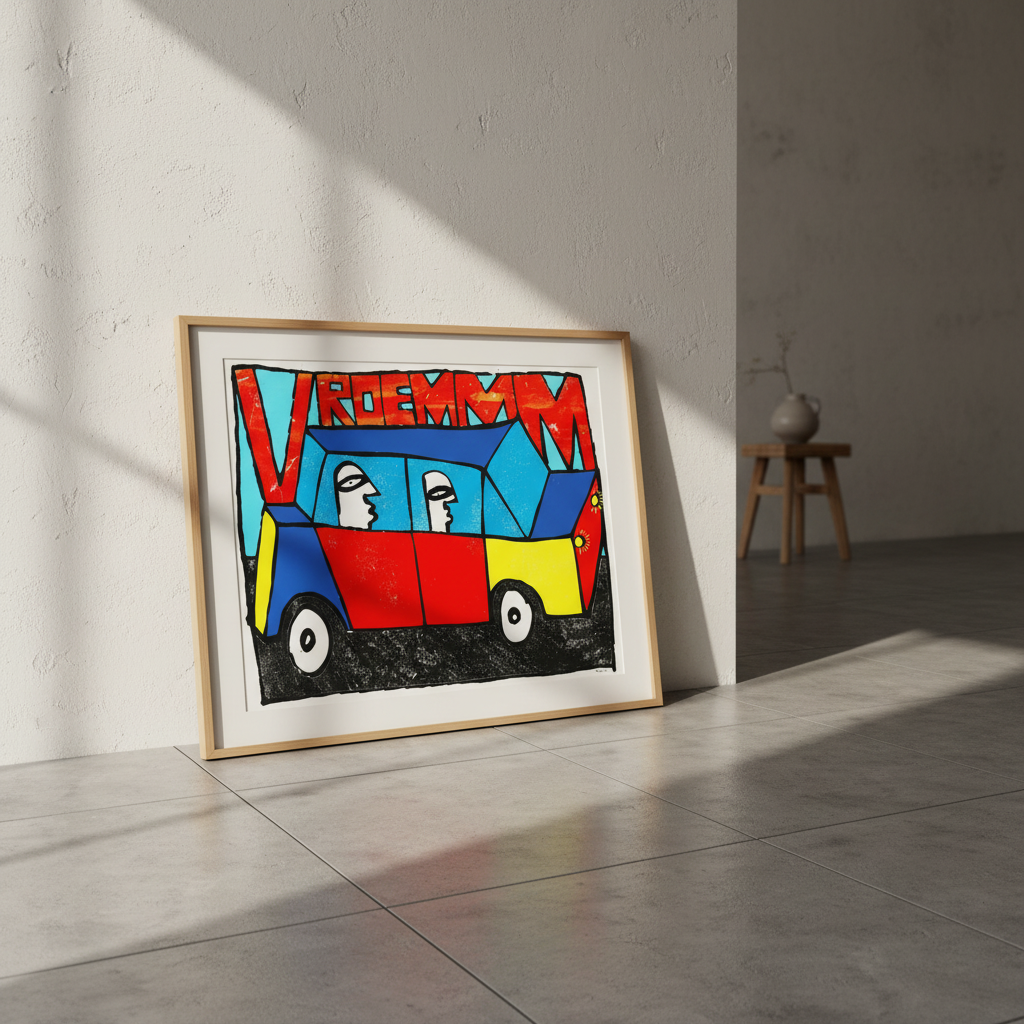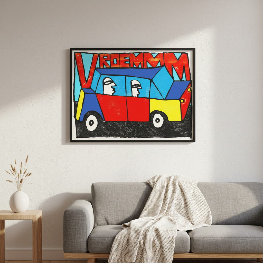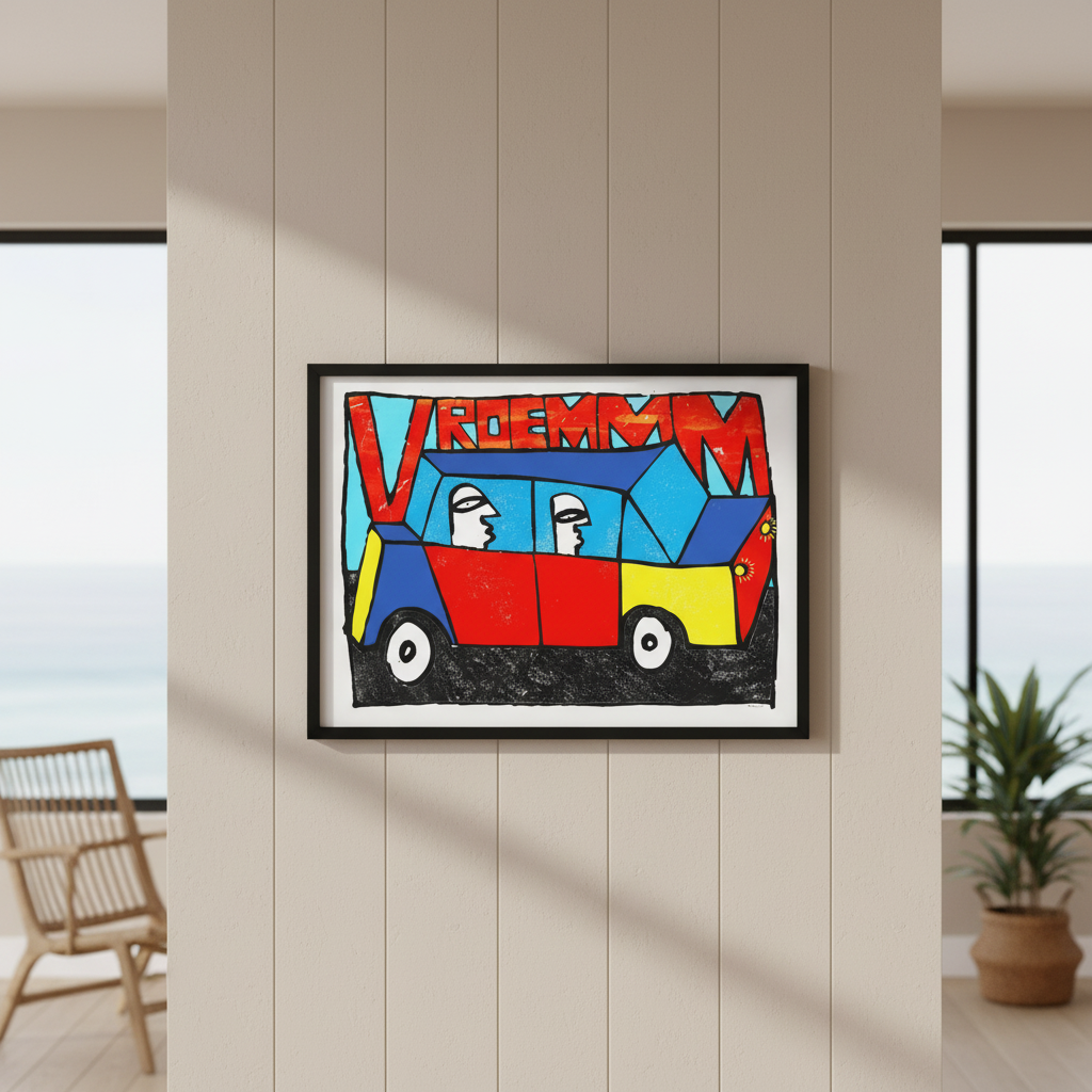 Vroemmm by Sven Reubens captures the exhilaration of motion through vibrant, dynamic artwork. This striking piece depicts two figures navigating a brilliantly coloured vehicle, with the energetic word "vroemmm" emblazoned across the composition. Reubens' bold use of colour and movement creates an engaging focal point that brings playful energy to any space. Perfect for those seeking contemporary art that celebrates speed, adventure, and unbridled joy. An ideal addition to modern interiors seeking personality and visual impact.