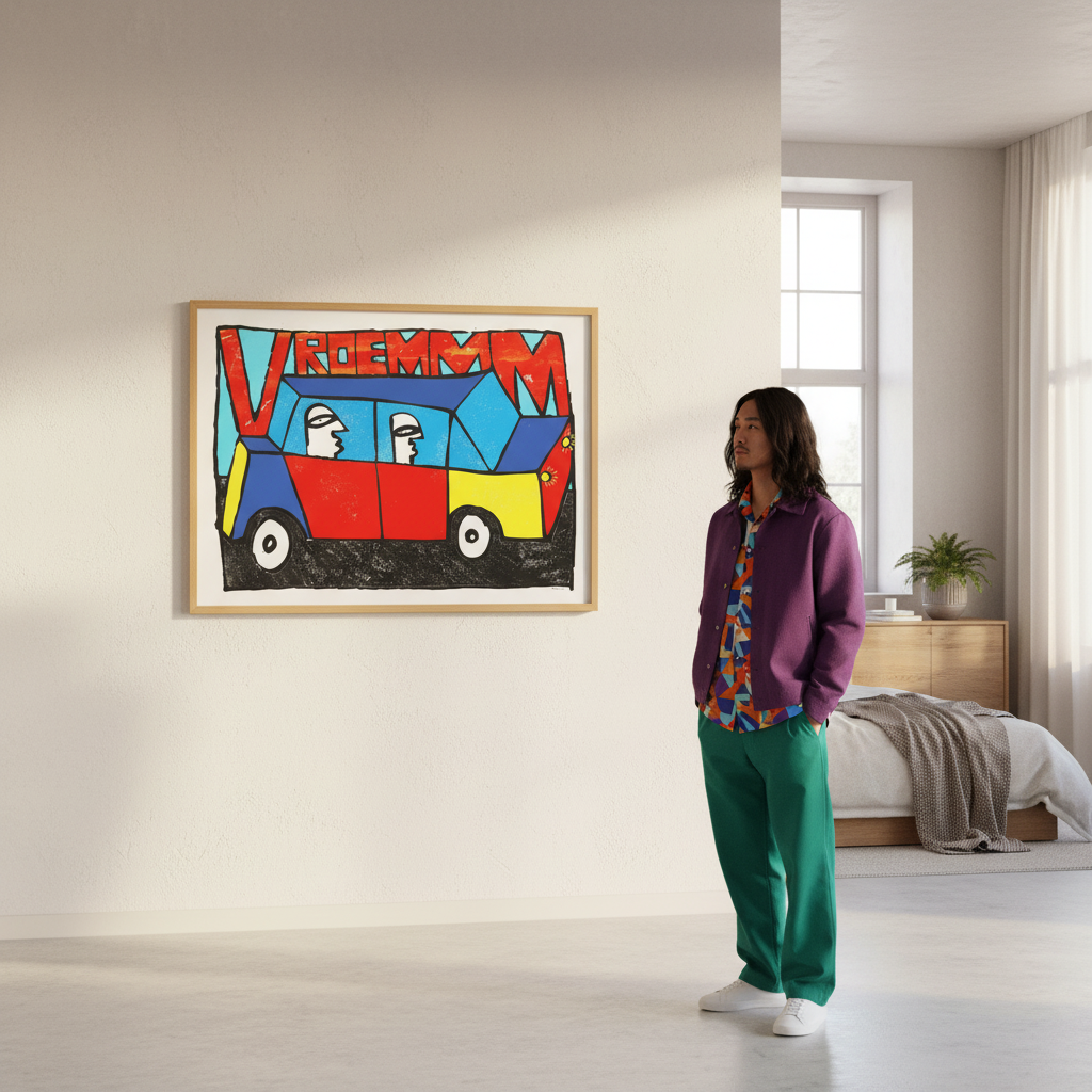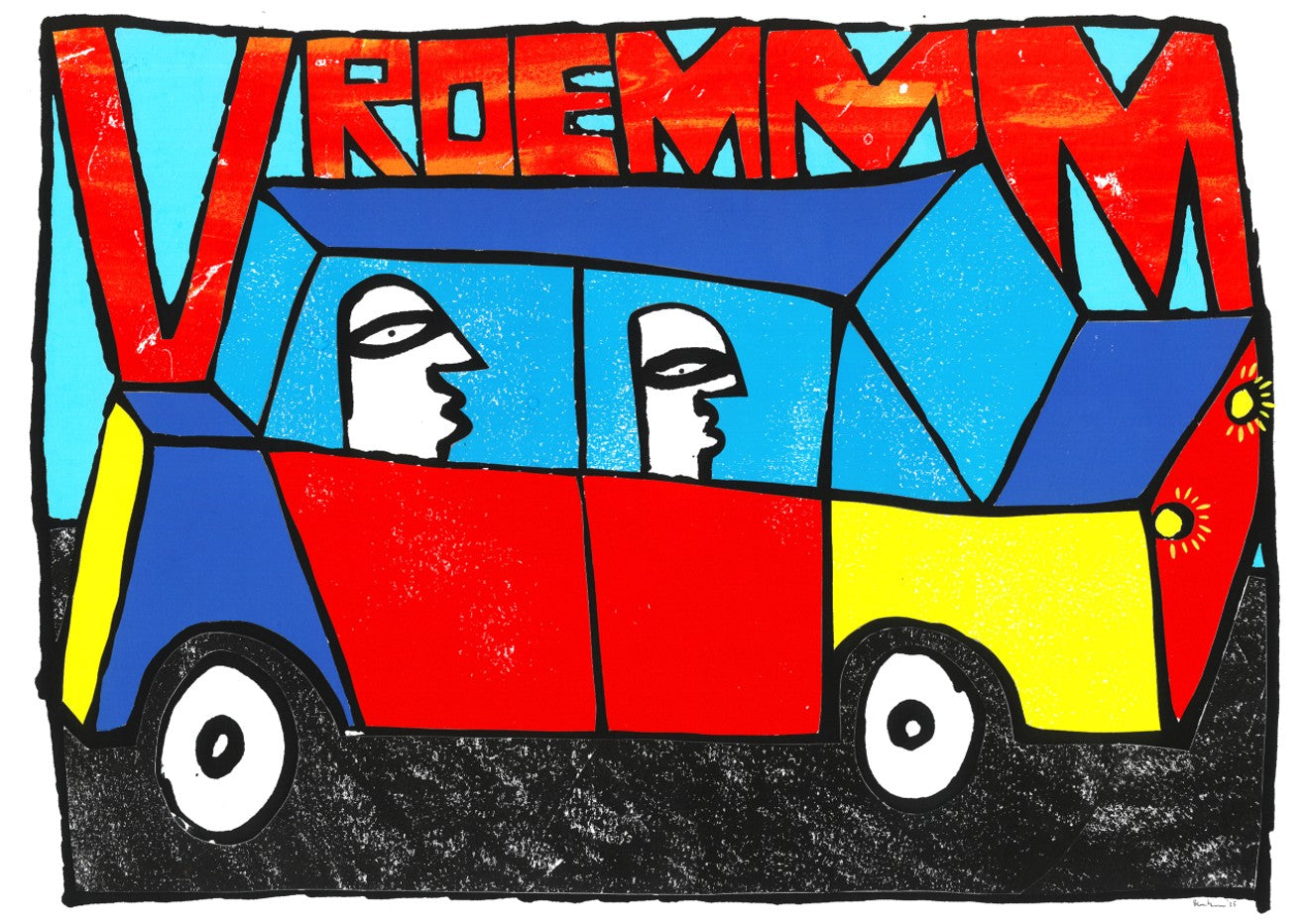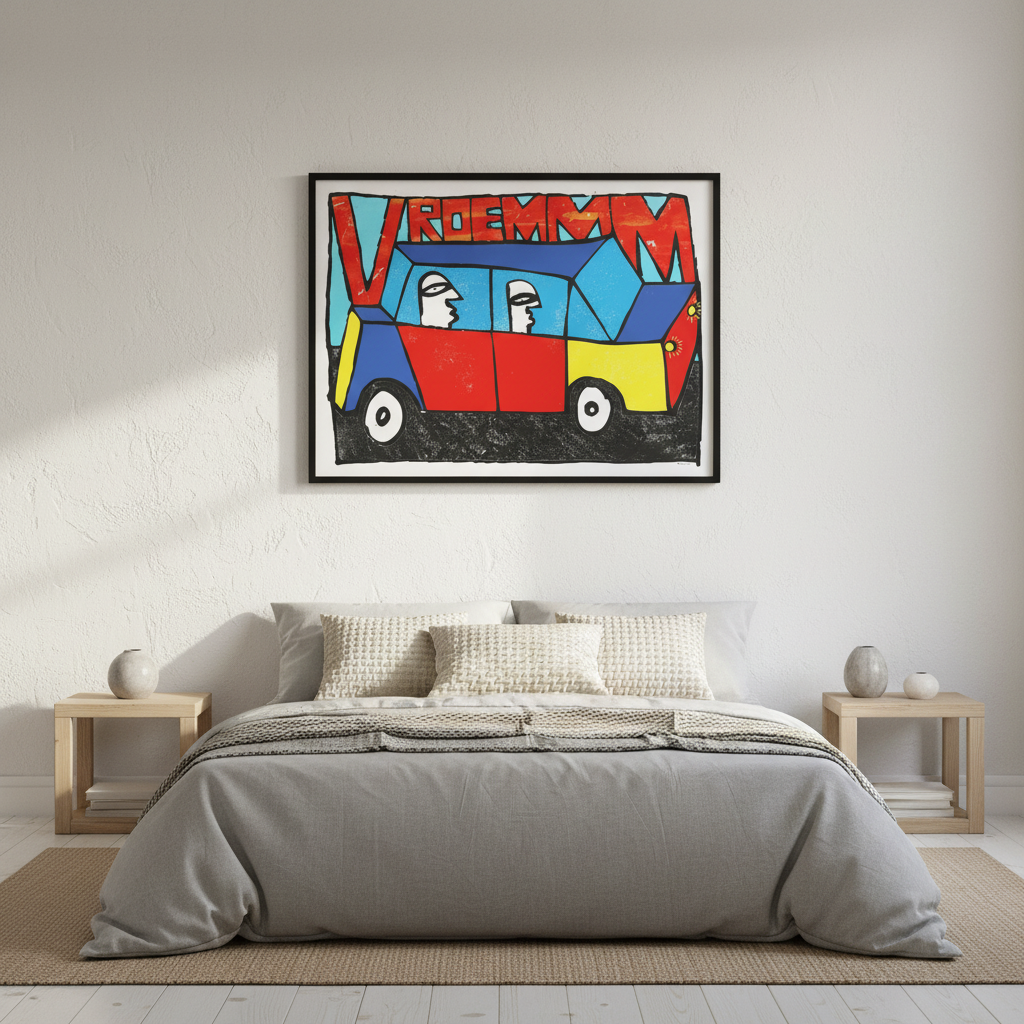Vroemmm by Sven Reubens captures the exhilaration of motion through vibrant, dynamic artwork. This striking piece depicts two figures navigating a brilliantly coloured vehicle, with the energetic word "vroemmm" emblazoned across the composition. Reubens' bold use of colour and movement creates an engaging focal point that brings playful energy to any space. Perfect for those seeking contemporary art that celebrates speed, adventure, and unbridled joy. An ideal addition to modern interiors seeking personality and visual impact.