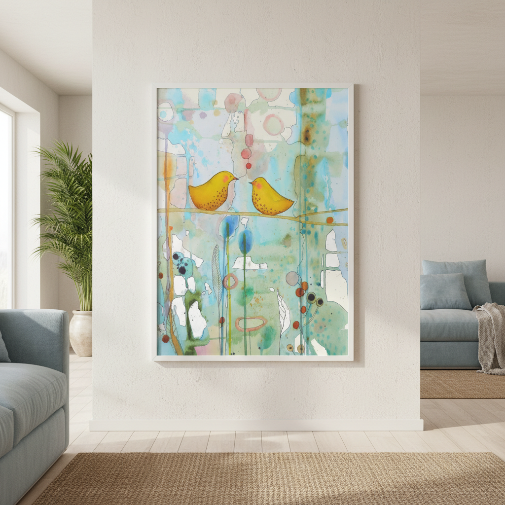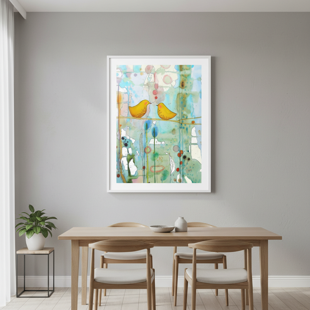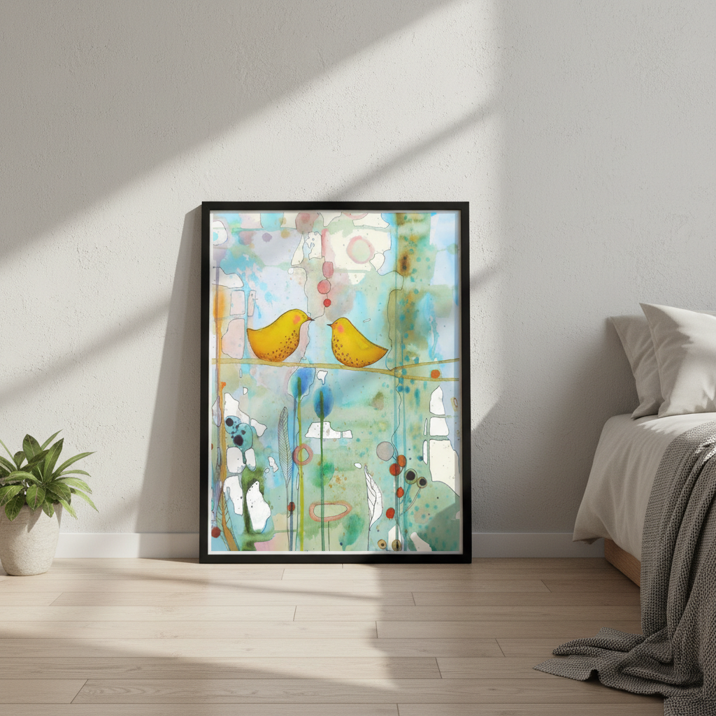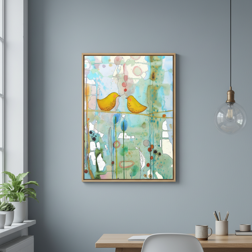 This vibrant artwork captures two golden yellow birds perched together on a wire, set against a dynamic abstract background bursting with colour and movement. The composition balances the delicate realism of the birds with expressive, layered hues that create visual depth and energy. Perfect for adding warmth and artistic sophistication to any interior space, this piece combines naturalistic detail with contemporary abstract elements. The interplay between the serene subjects and the bold, colourful backdrop creates an engaging focal point that draws the eye while maintaining an elegant aesthetic appeal.
