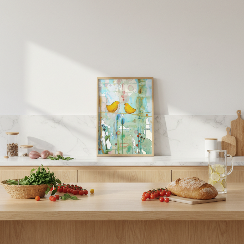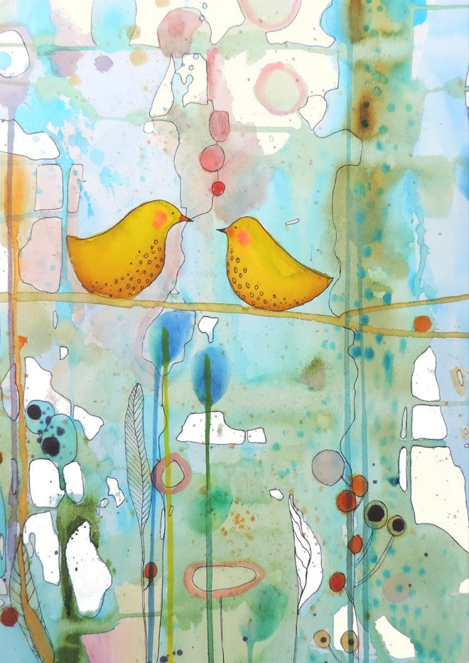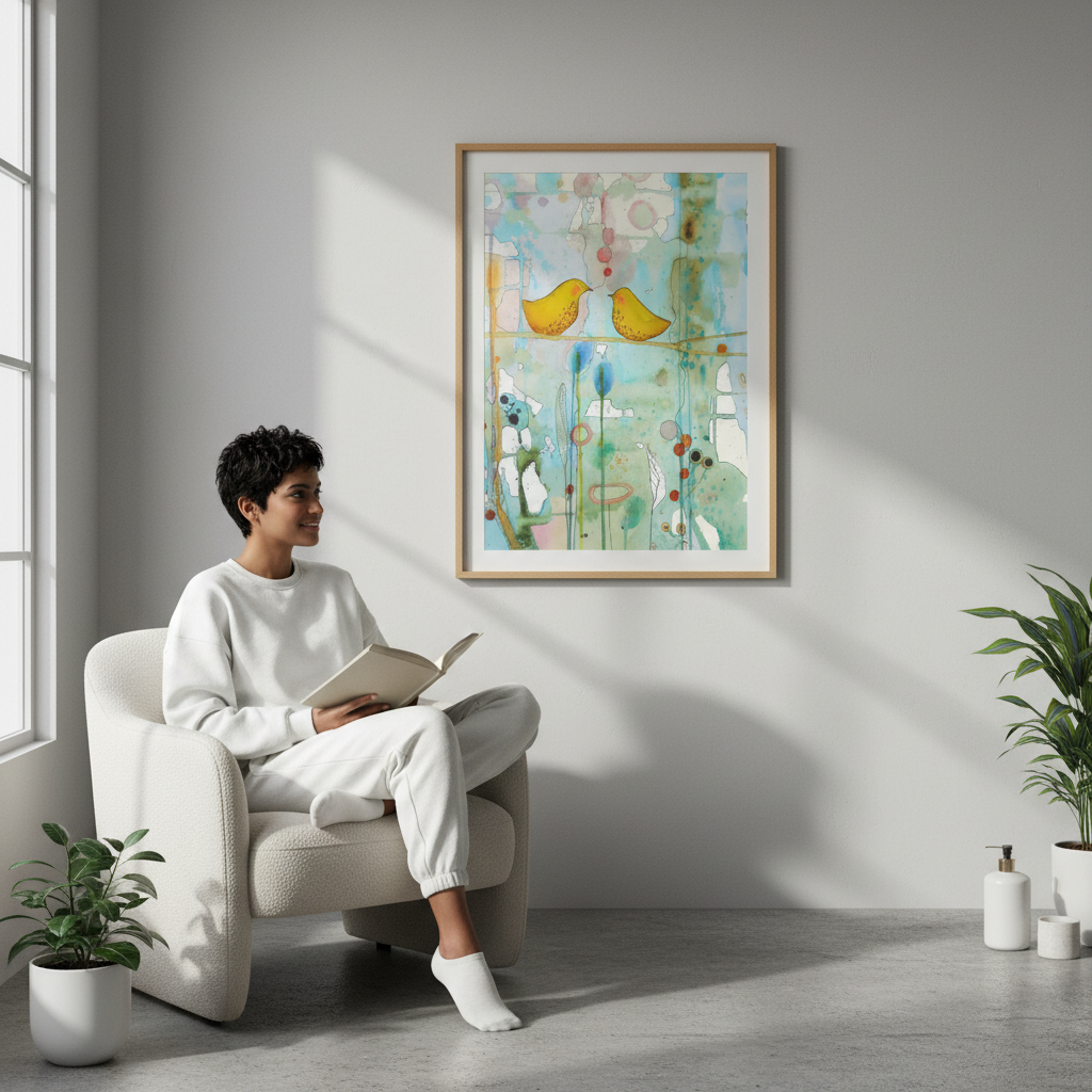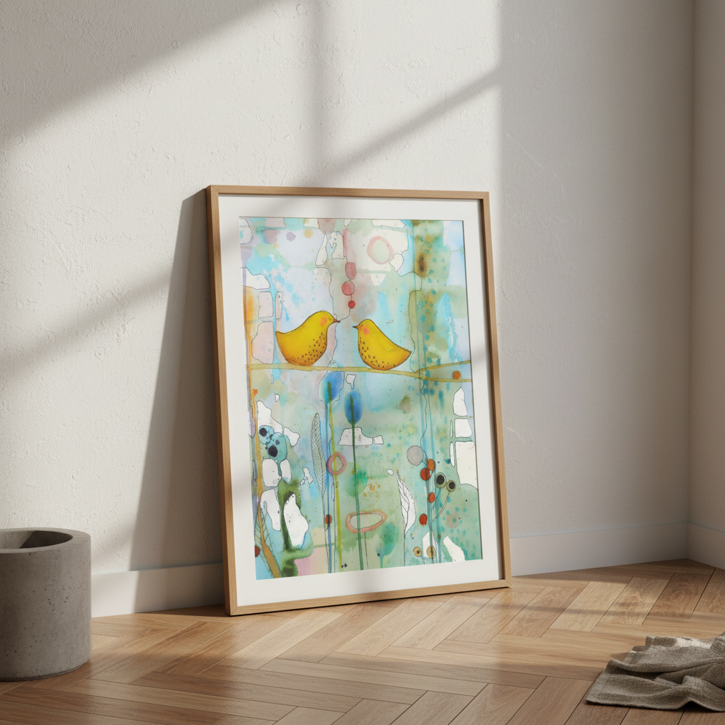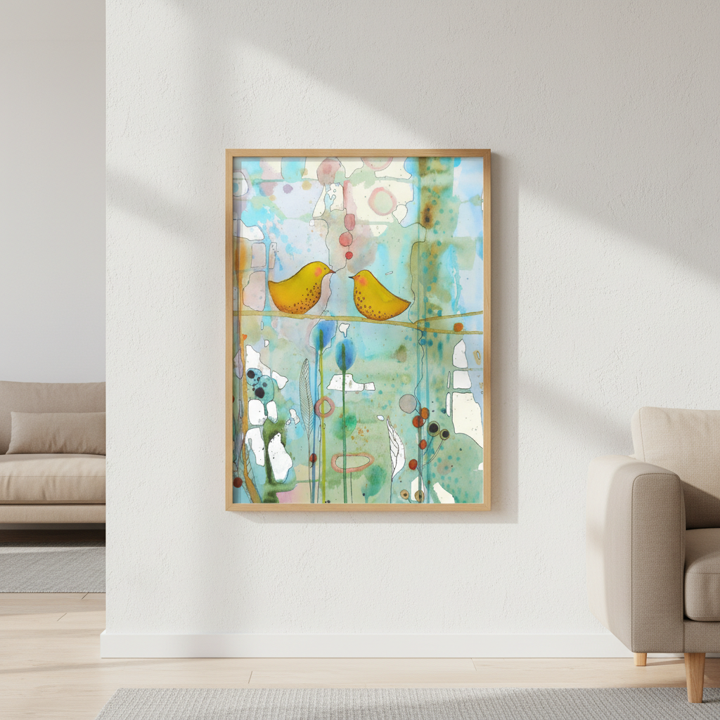 This vibrant artwork captures two golden yellow birds perched together on a wire, set against a dynamic abstract background bursting with colour and movement. The composition balances the delicate realism of the birds with expressive, layered hues that create visual depth and energy. Perfect for adding warmth and artistic sophistication to any interior space, this piece combines naturalistic detail with contemporary abstract elements. The interplay between the serene subjects and the bold, colourful backdrop creates an engaging focal point that draws the eye while maintaining an elegant aesthetic appeal.